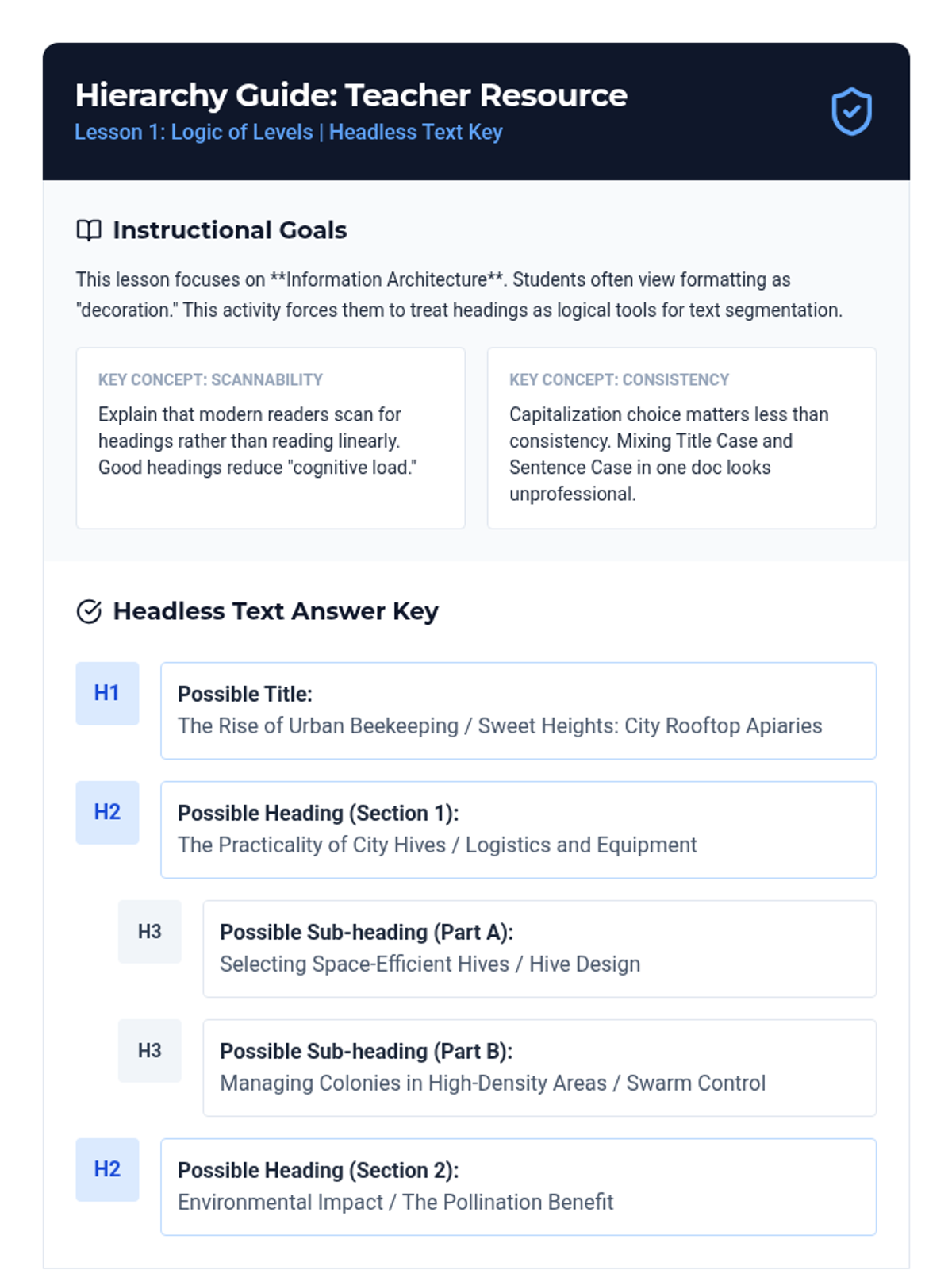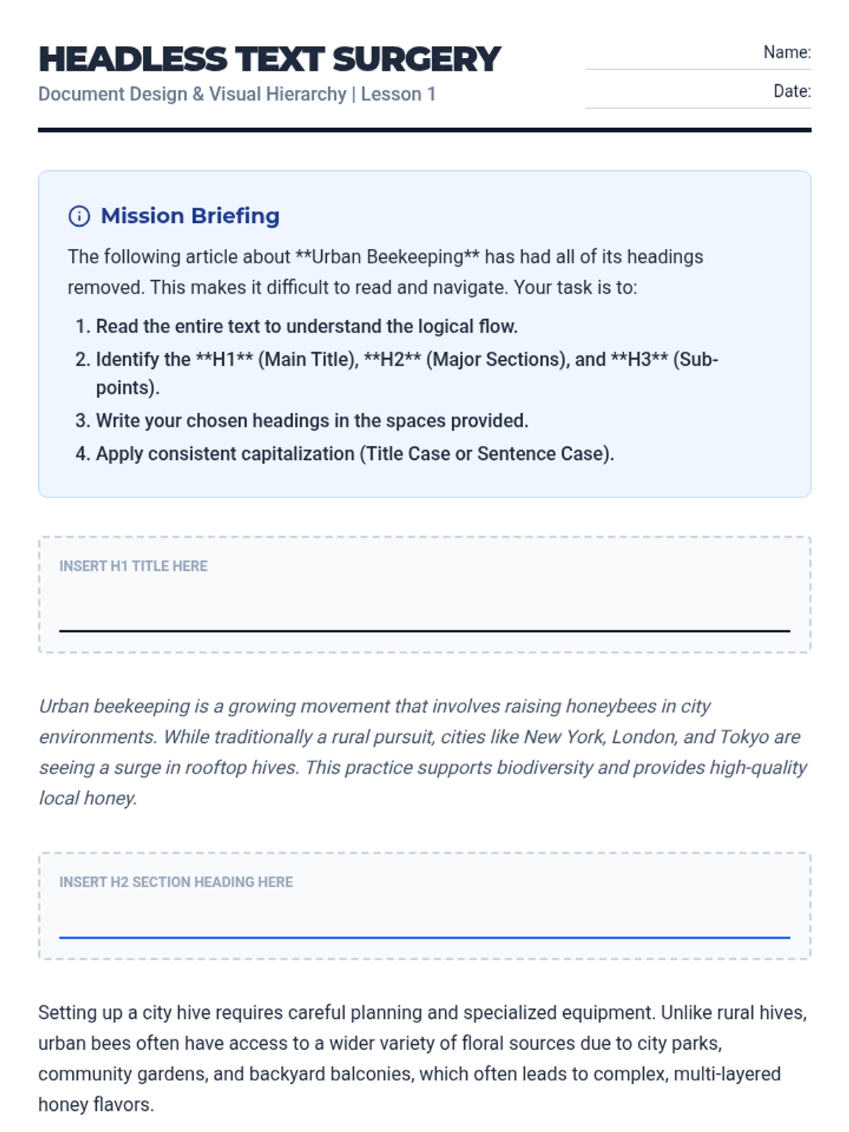 This sequence teaches 10th-grade students the principles of document design and visual hierarchy. Students explore how headings, white space, typography, and alignment function as tools for cognitive accessibility and effective communication.