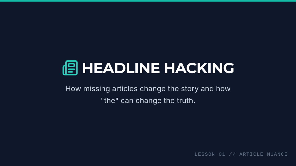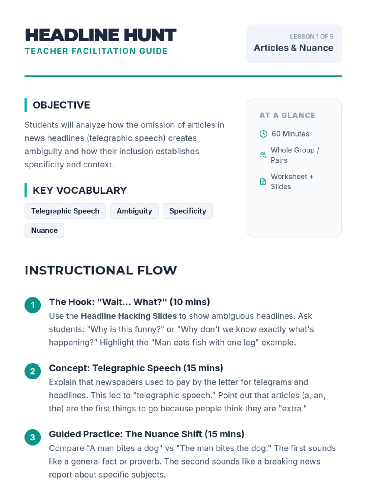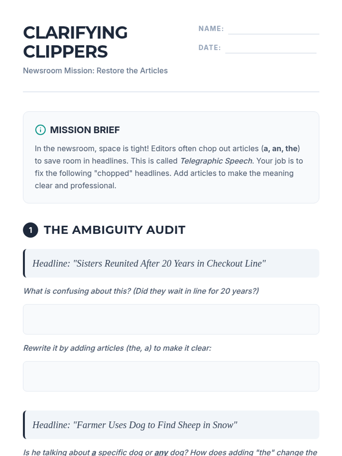 A 5th-grade ELA sequence exploring how the choice of articles (a, an, the) shifts meaning and tone in headlines, geography, science, and persuasion. Students move beyond simple grammar rules to analyze the semantic impact of these 'tiny' words.