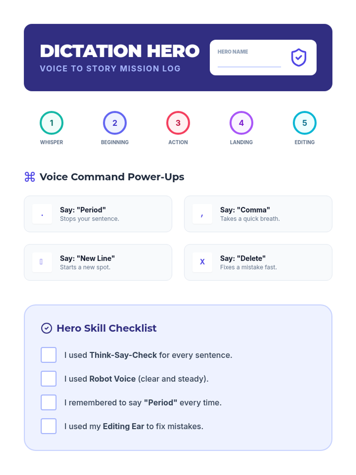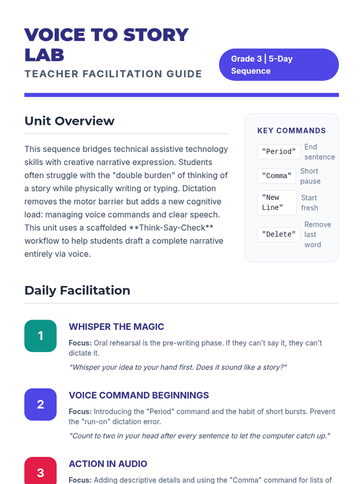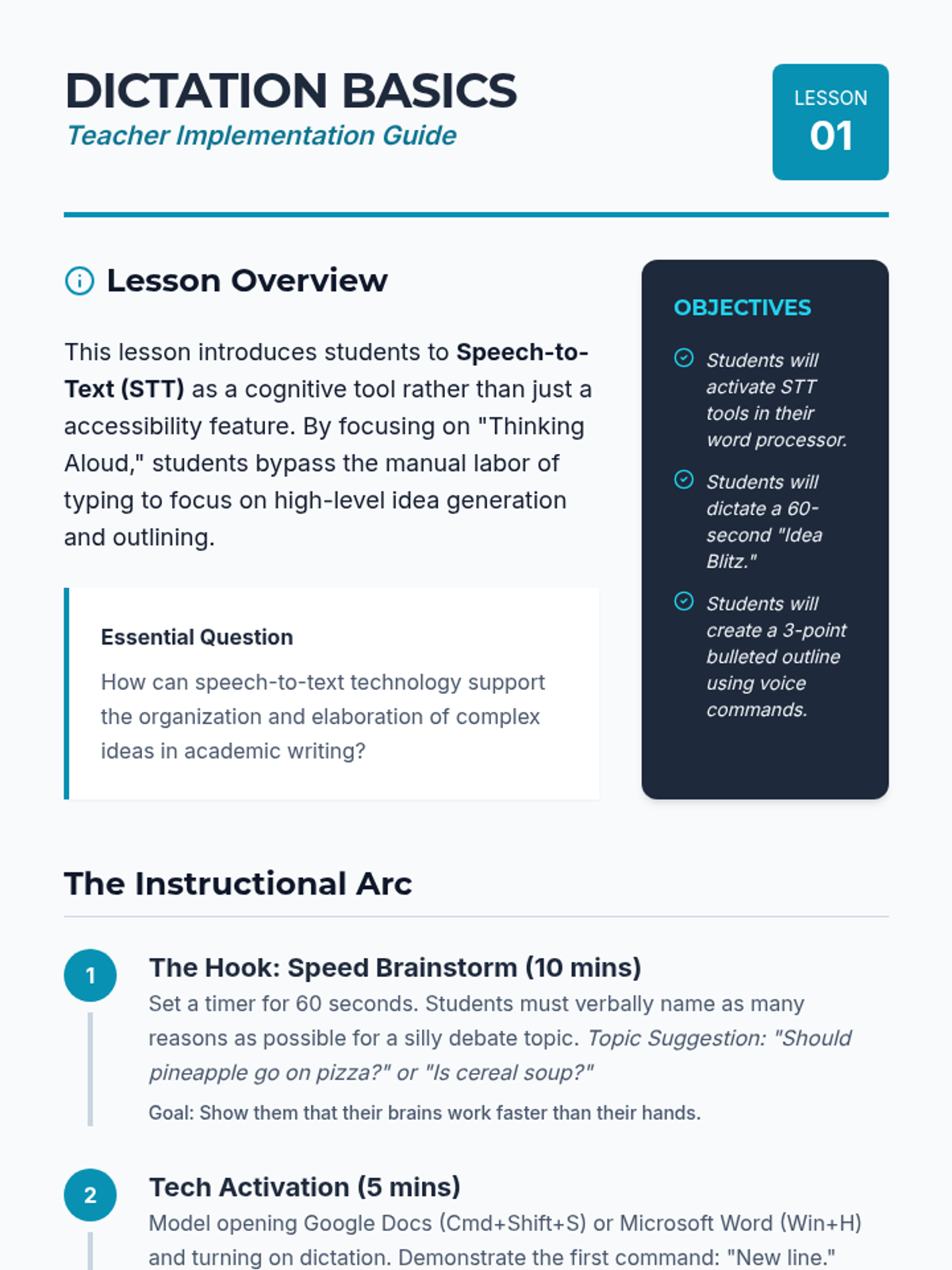 This 5-lesson sequence guides 7th-grade students through the process of writing academic essays using speech-to-text assistive technology. It covers the entire writing process from rapid brainstorming and outlining to drafting, structuring arguments, and final formatting, all using voice commands.