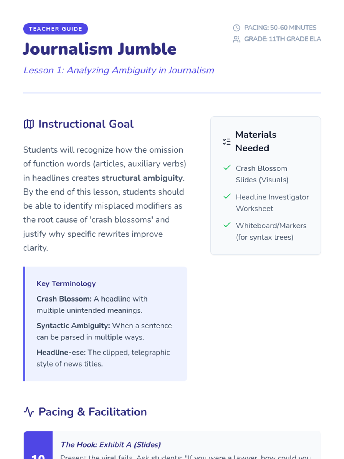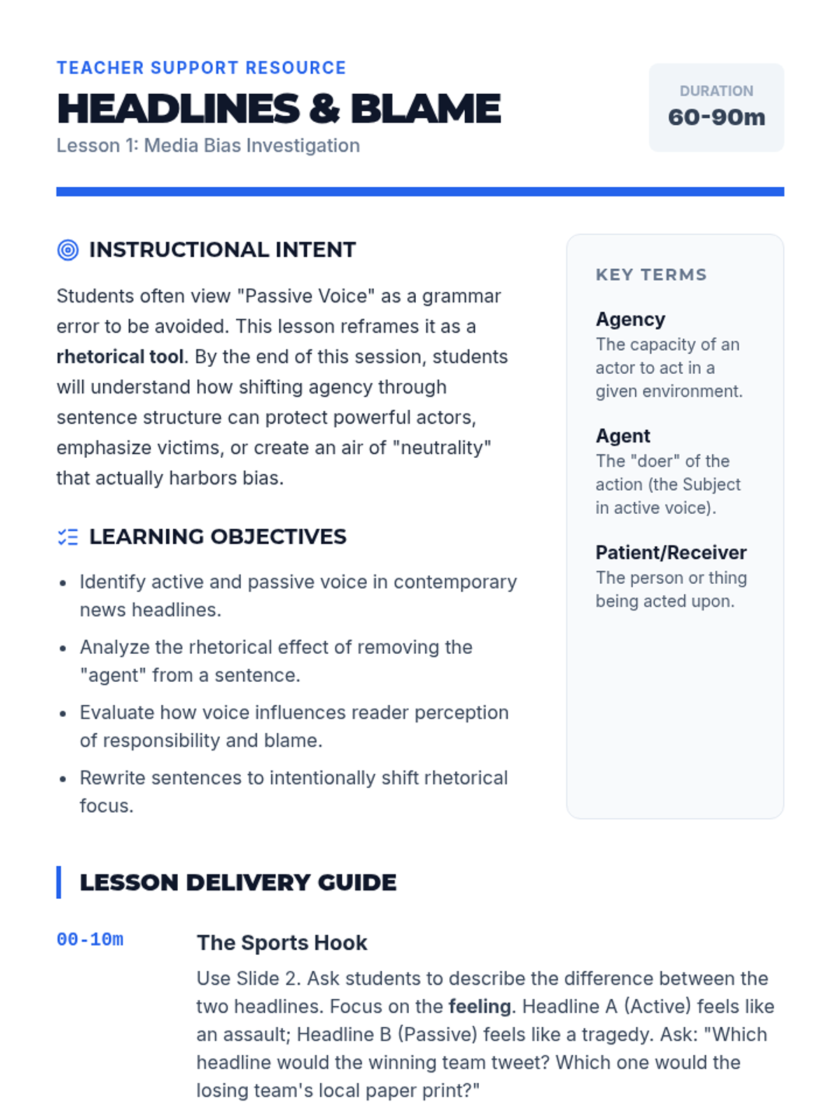 A 10th-grade ELA sequence exploring the rhetorical impact of active and passive voice in nonfiction, media, and technical writing. Students investigate how grammatical choices influence perception of agency, responsibility, and objectivity.