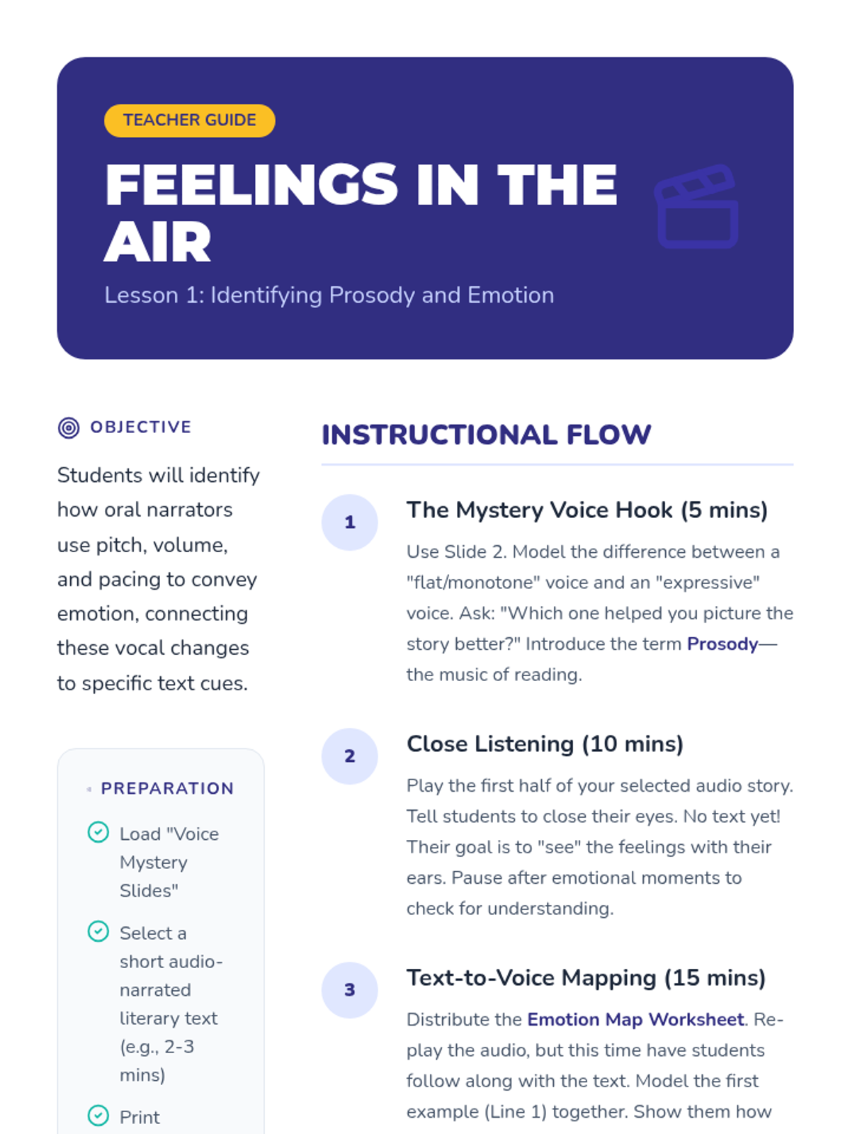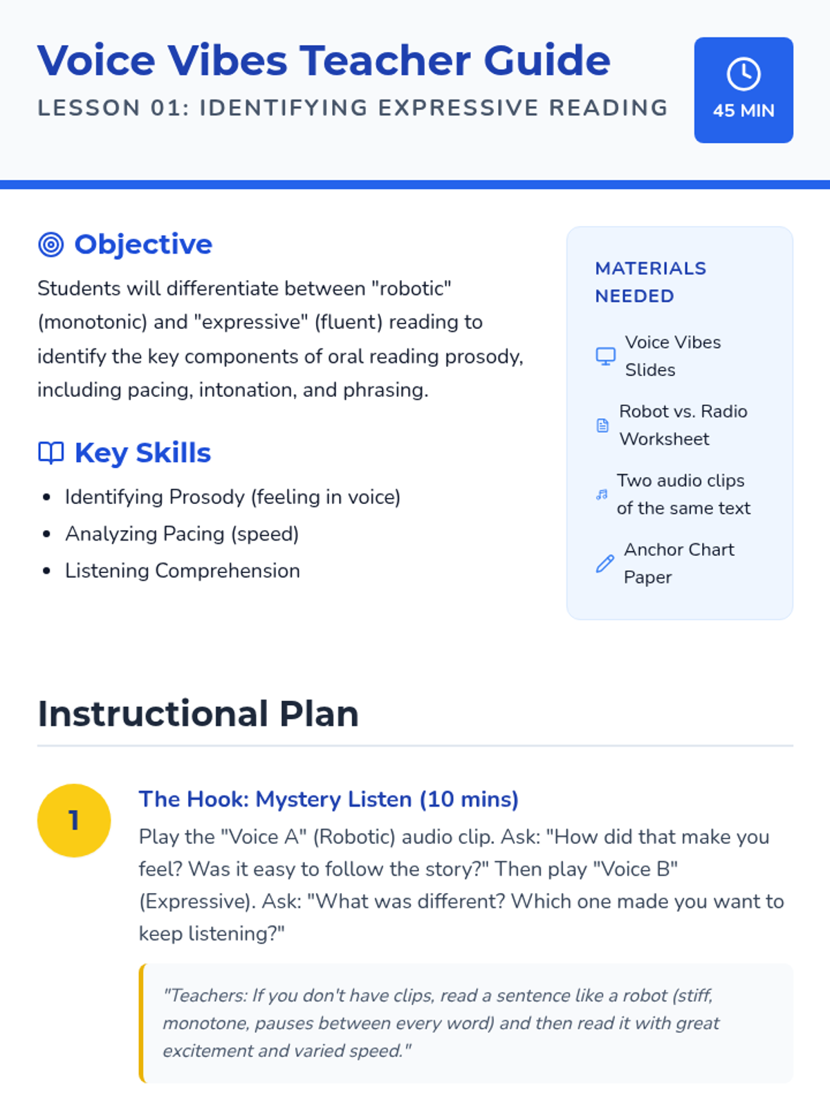 A 2nd-grade sequence focusing on developing oral reading fluency and prosody using audio-narrated literary texts. Students progress from listening for emotion to recording their own expressive readings, bridging the gap between decoding and comprehension.
