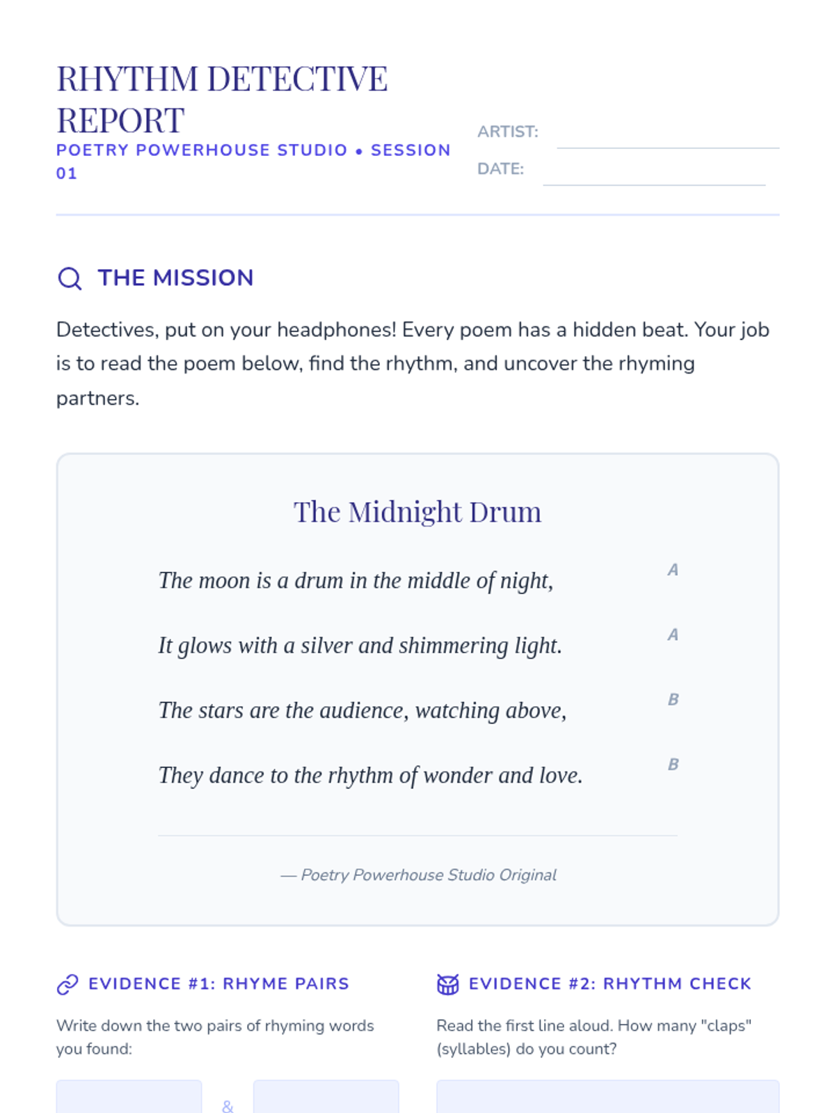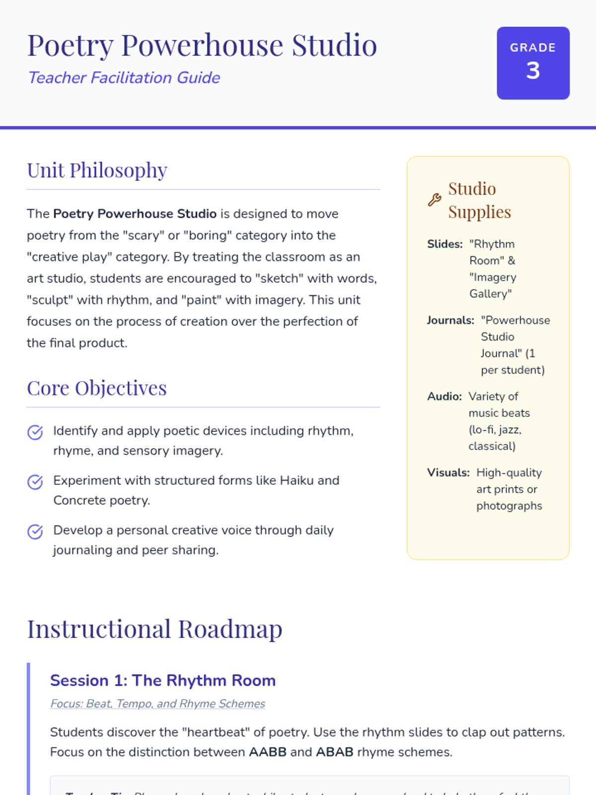 A dynamic 3rd-grade poetry unit that transforms the classroom into an art studio where students explore rhythm, rhyme, imagery, and form. Through hands-on experimentation, students build confidence in their creative voice and language skills.