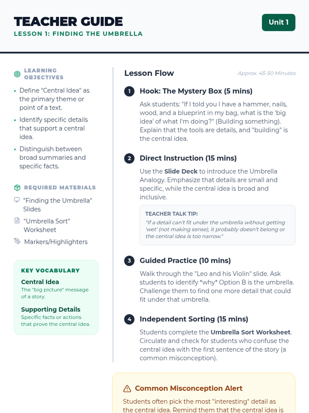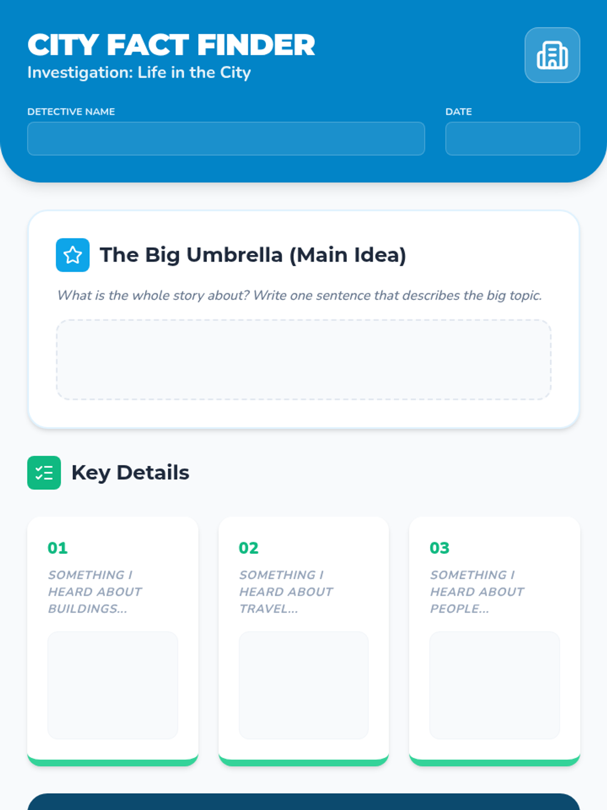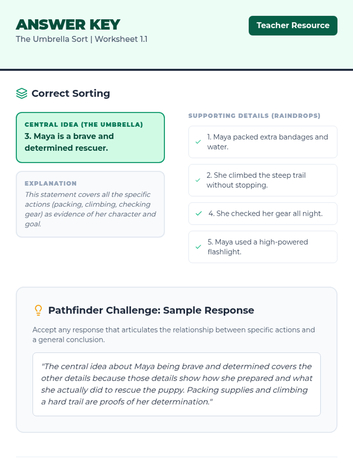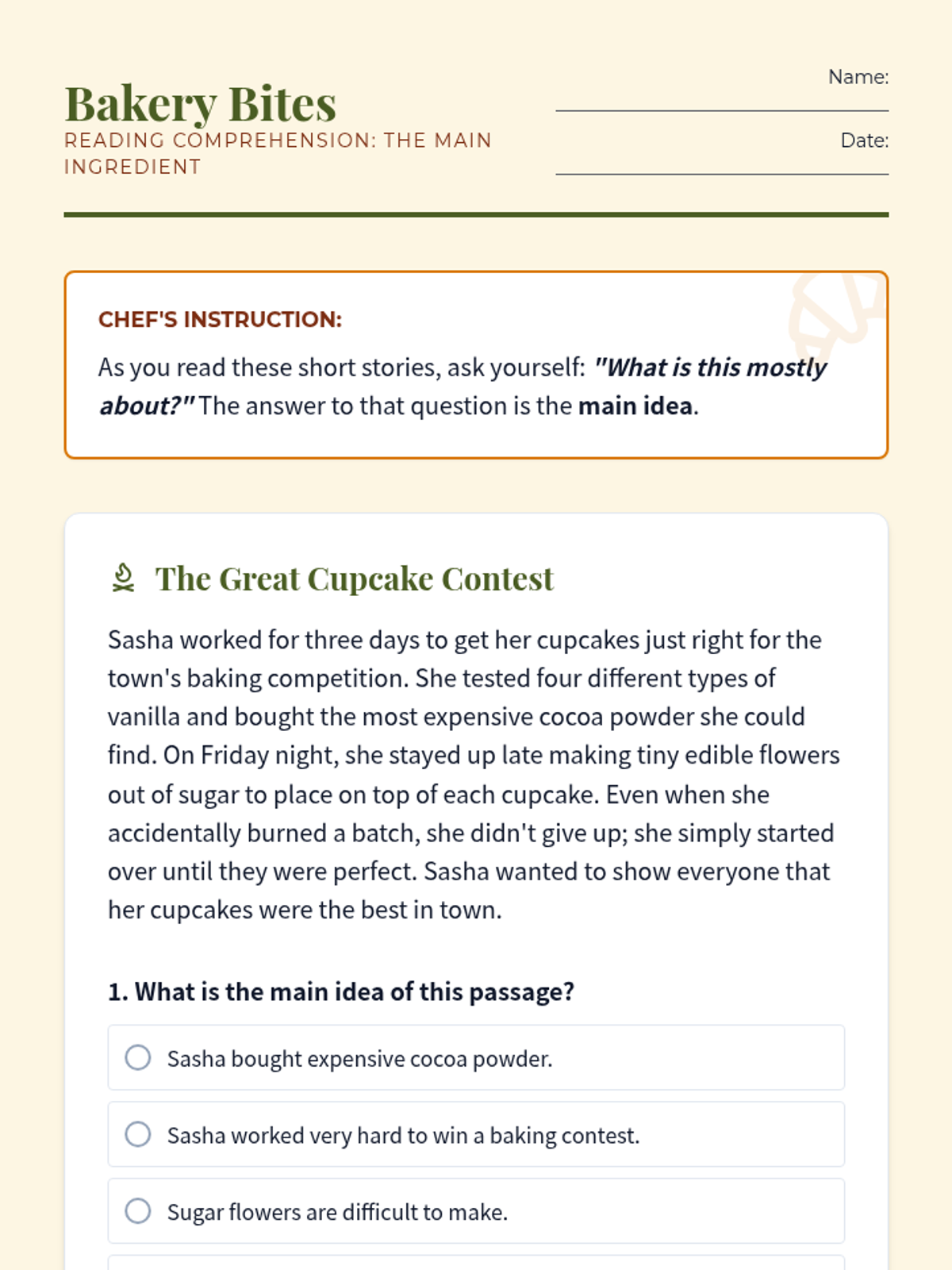 Main IdeaIdentification of central messages and supporting details within informational and narrative texts. Strengthens summarization skills and the ability to distinguish primary points from secondary evidence.