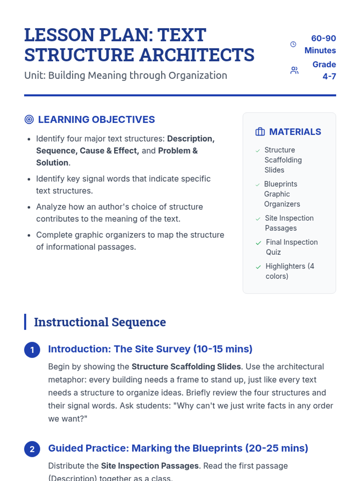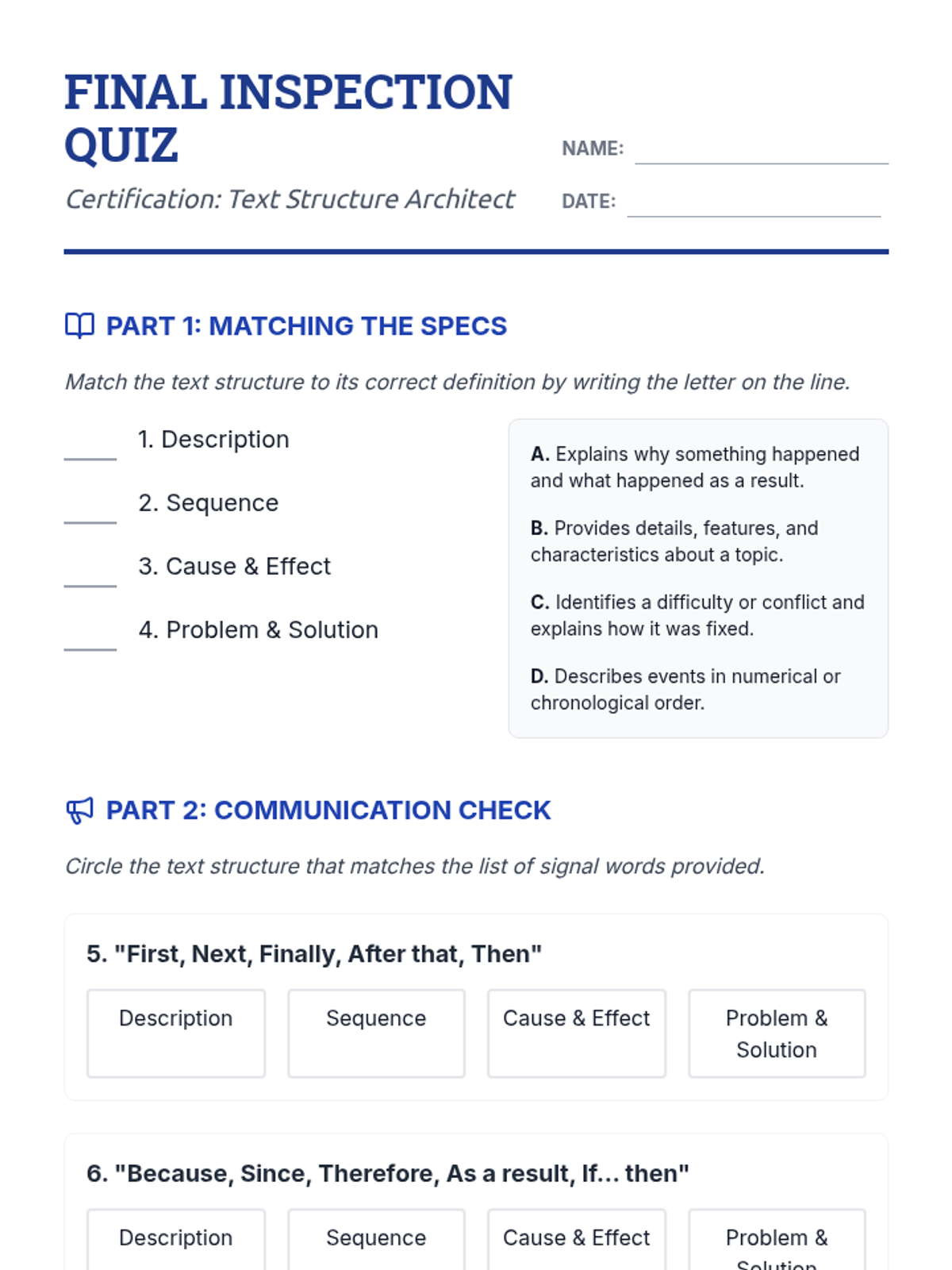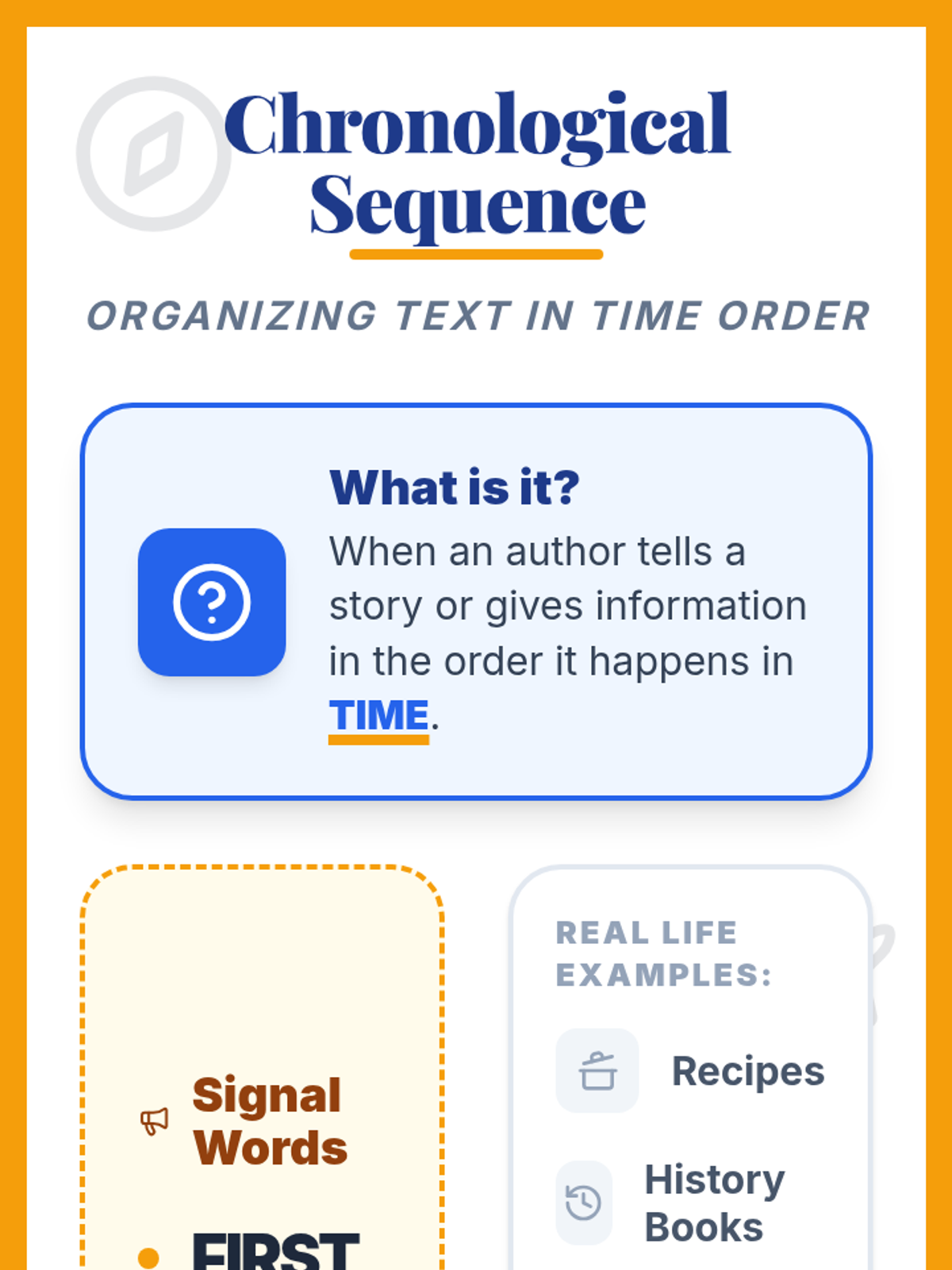 Text StructureOrganizational patterns including cause and effect, compare and contrast, and chronological sequencing. Strengthens comprehension by analyzing how authors arrange information to clarify relationships between ideas.