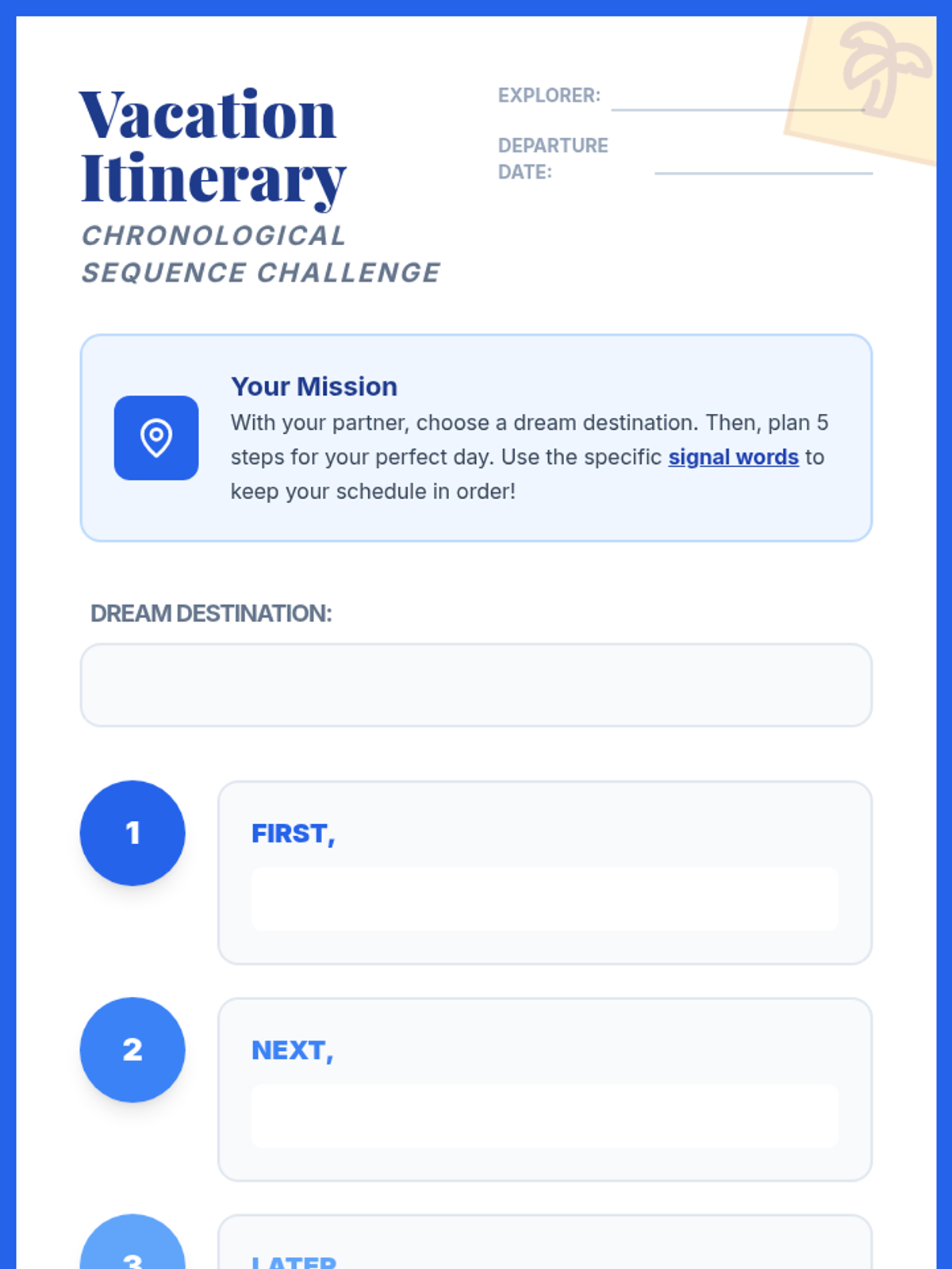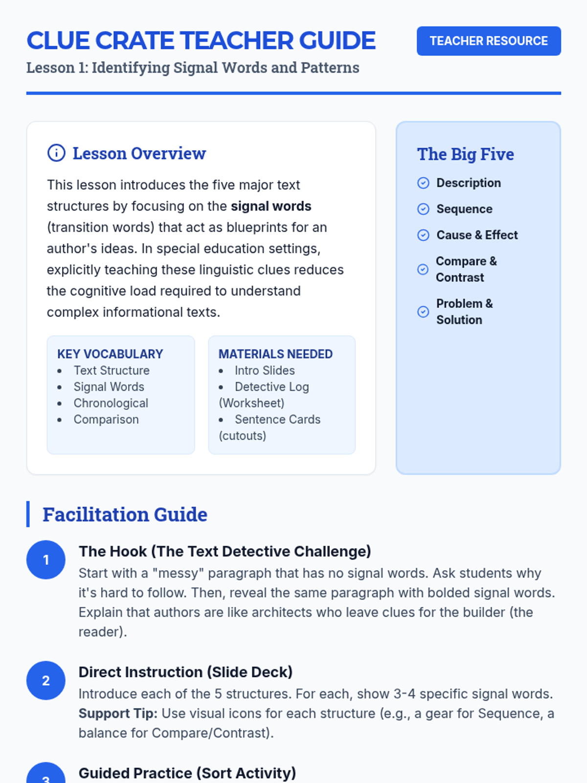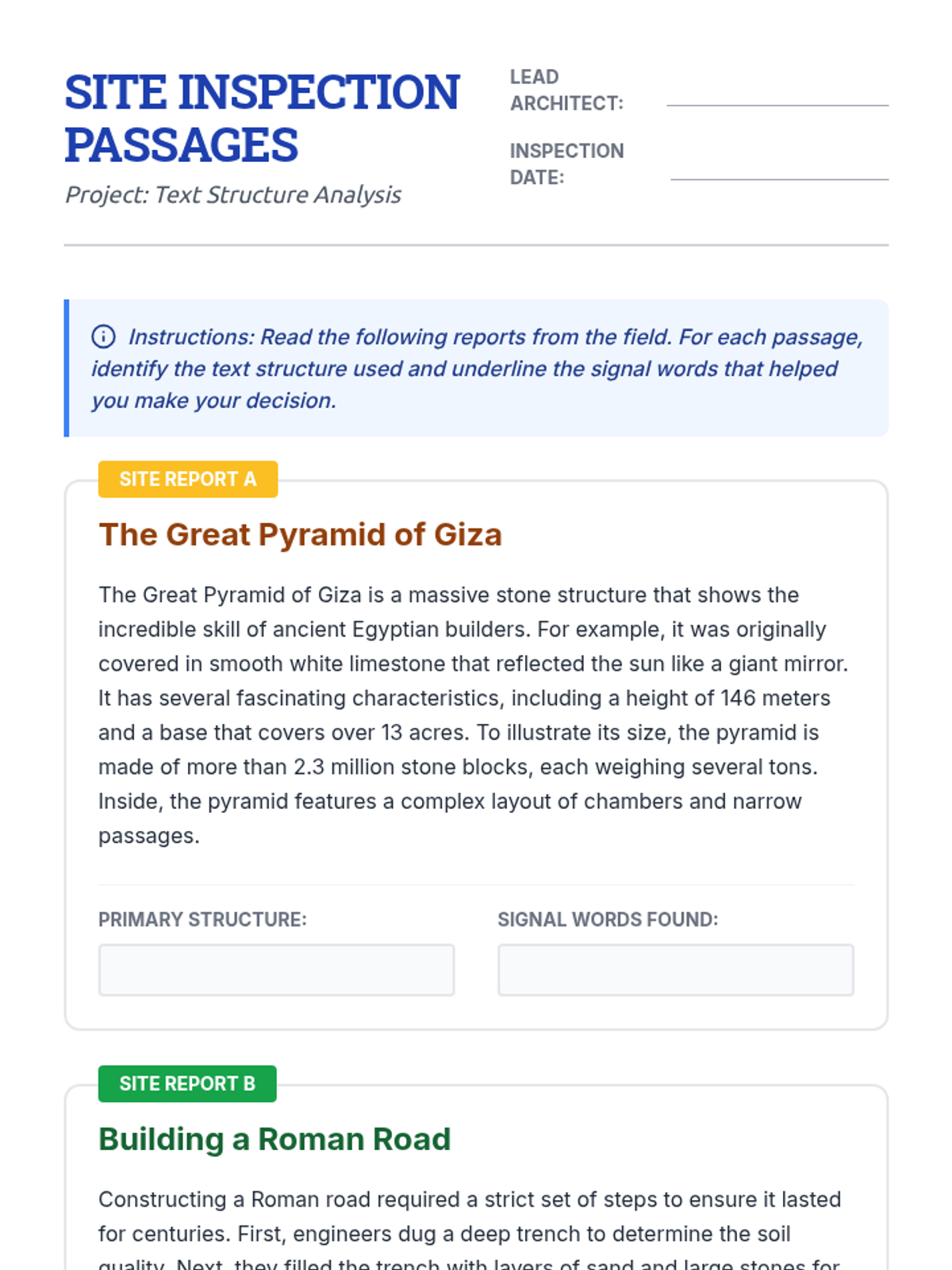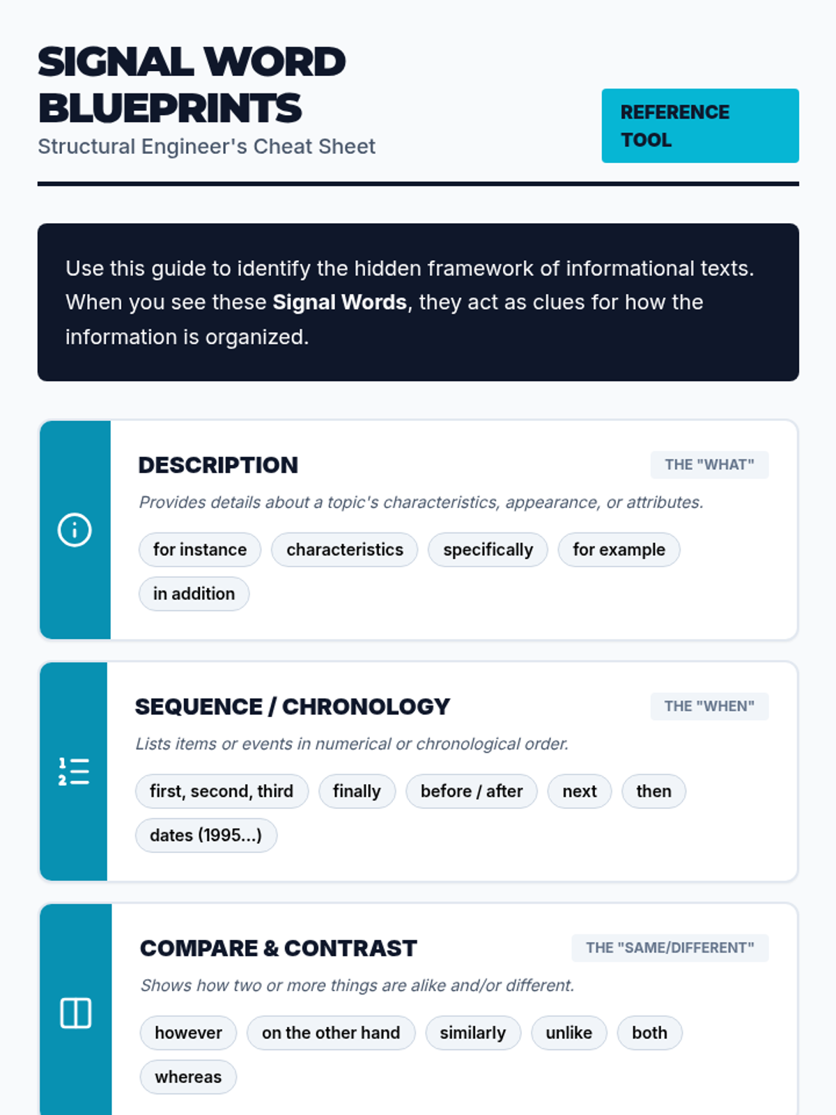 Text StructureOrganizational patterns including cause and effect, compare and contrast, and chronological sequencing. Strengthens comprehension by analyzing how authors arrange information to clarify relationships between ideas.