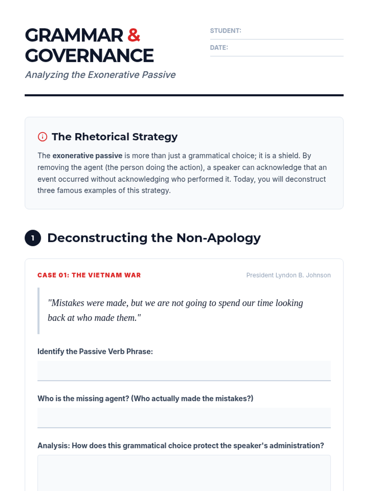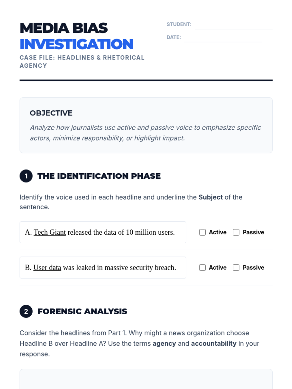 This sequence explores the strategic implications of active and passive voice in media, politics, and literature. Students move from analyzing news bias to deconstructing political 'non-apologies' and scientific objectivity, culminating in a creative writing project that demonstrates their mastery over sentence voice for rhetorical effect.