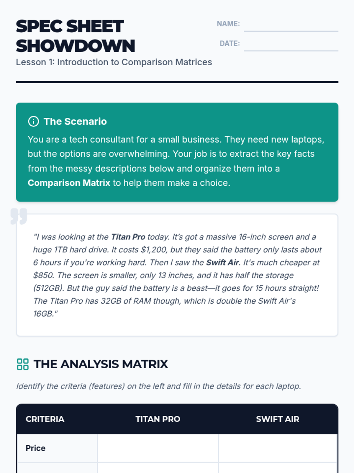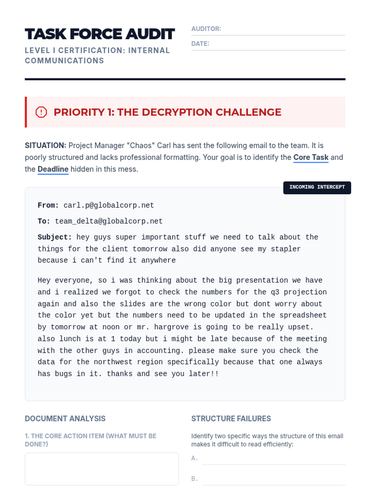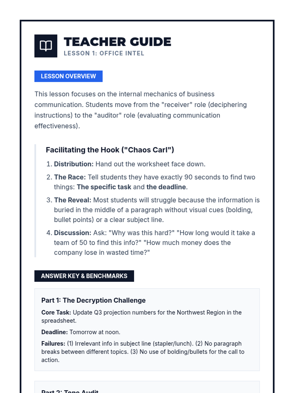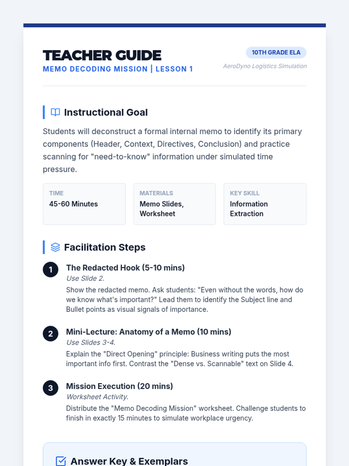 A workplace simulation sequence where 10th-grade students master the interpretation and creation of professional business documents, acting as junior associates at a fictional corporation. Students progress from deconstructing memos to auditing financial documents and synthesizing complex reports, culminating in a high-stakes inbox simulation.
