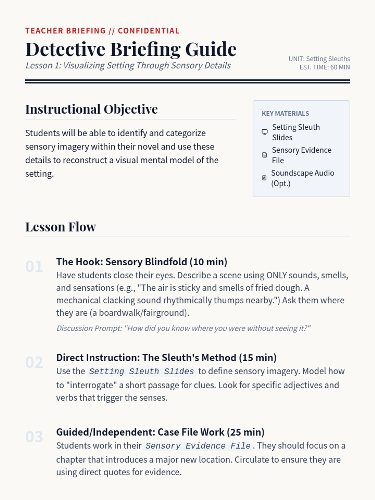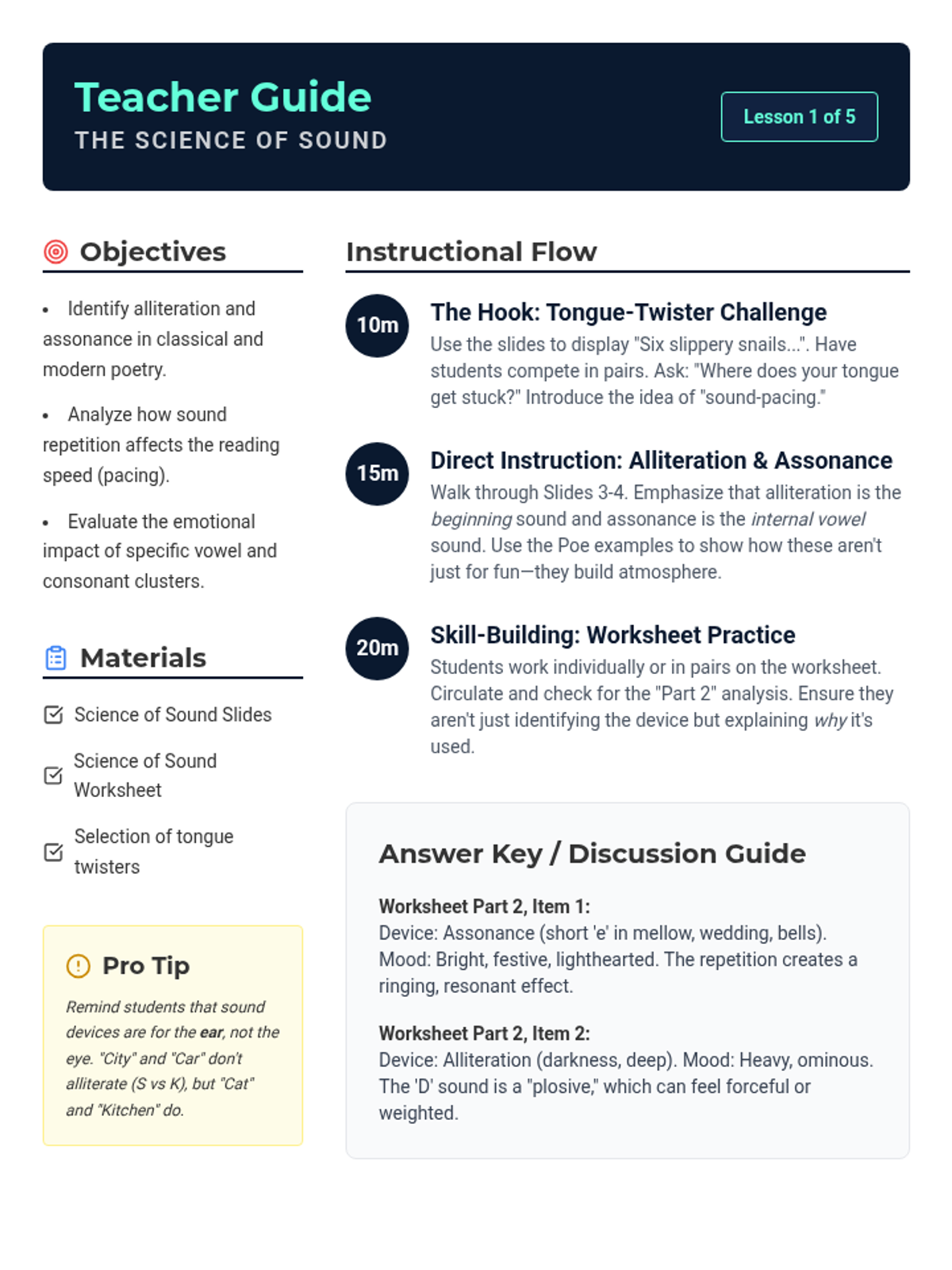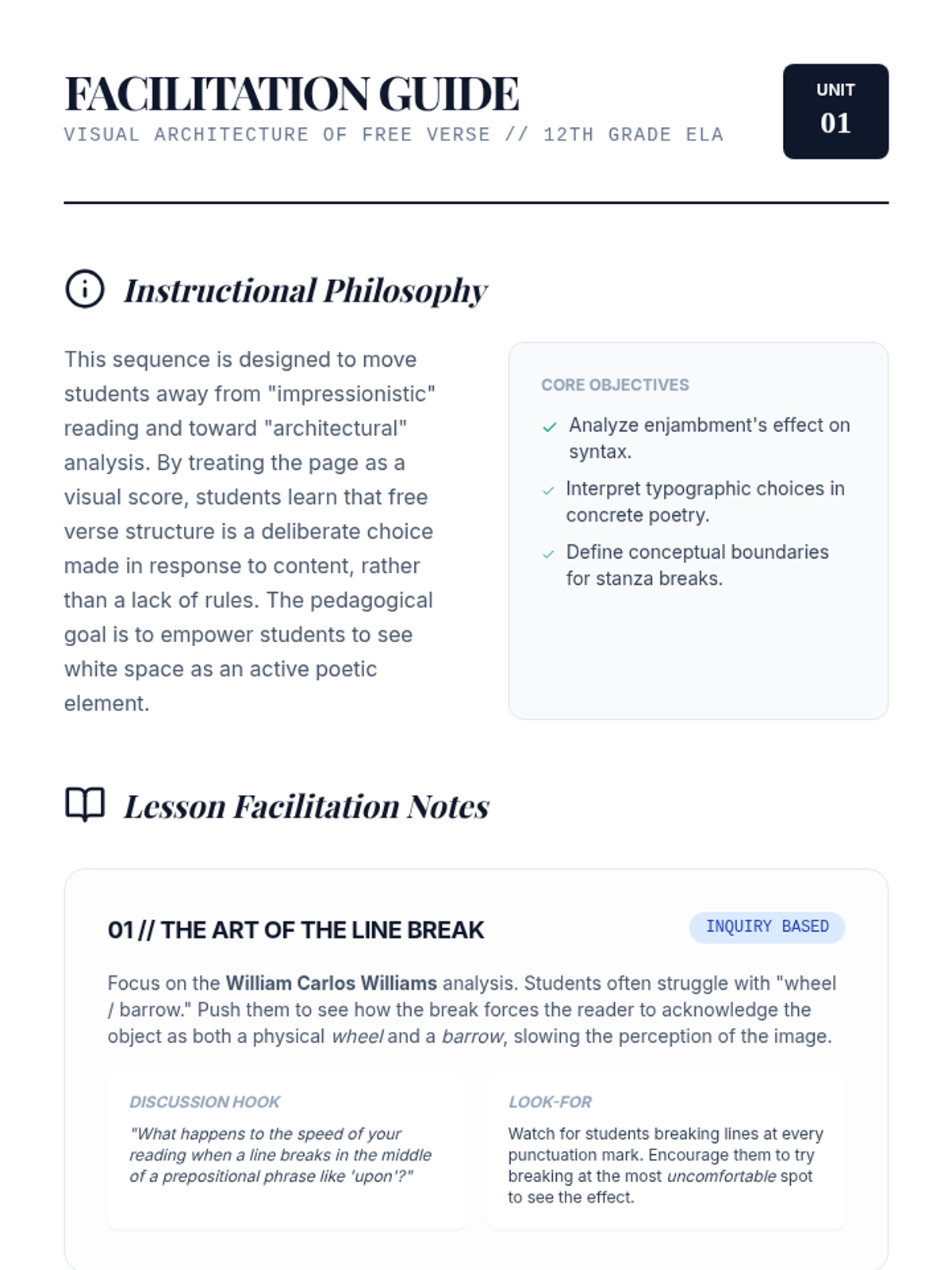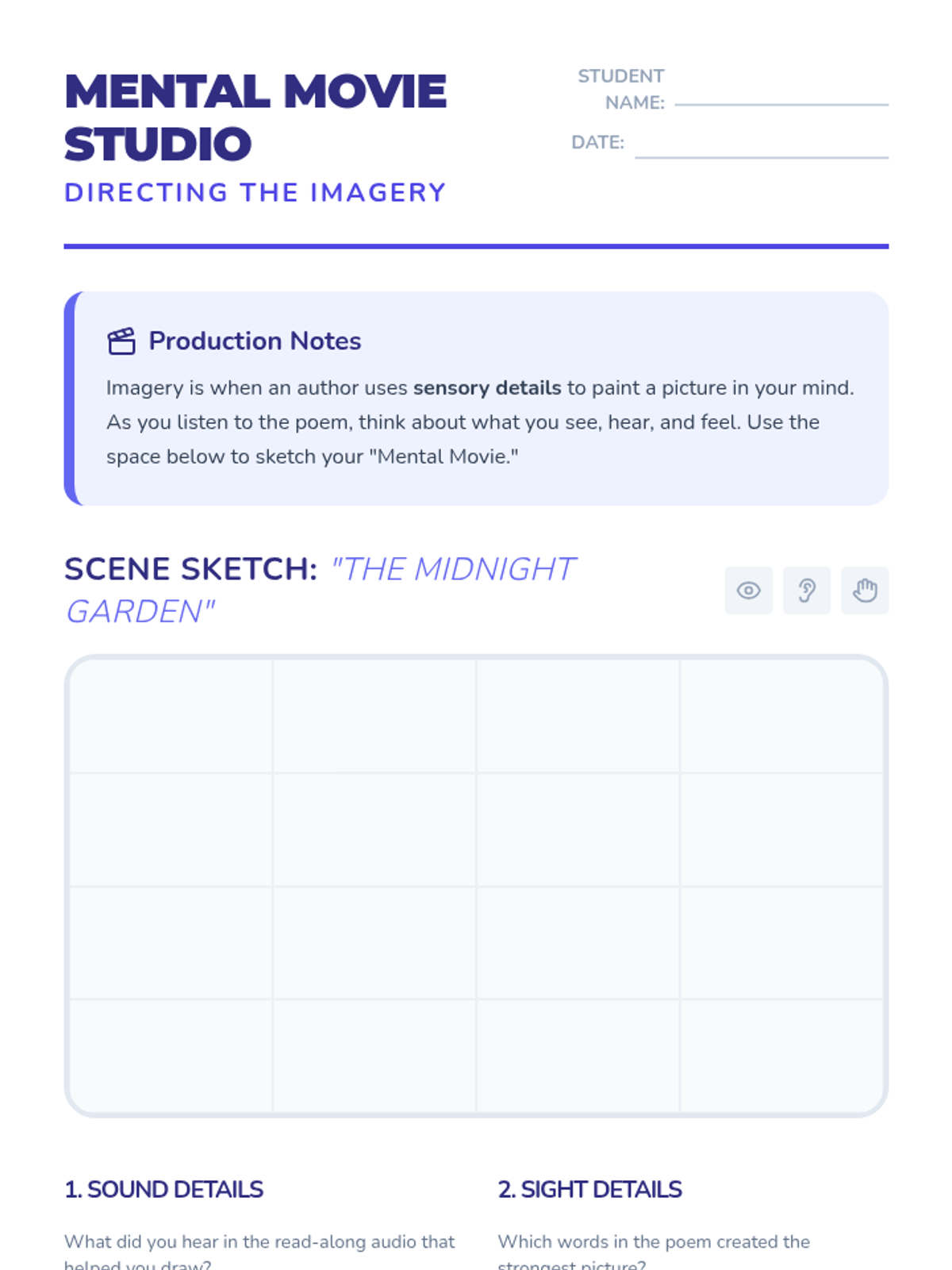 This 3rd-grade sequence explores how imagery, rhythm, and sound devices create meaning in poetry through a multisensory read-along approach. Students progress from visualizing sensory details to analyzing structural elements and finally synthesizing their understanding by creating their own audio-enhanced poetry experiences.