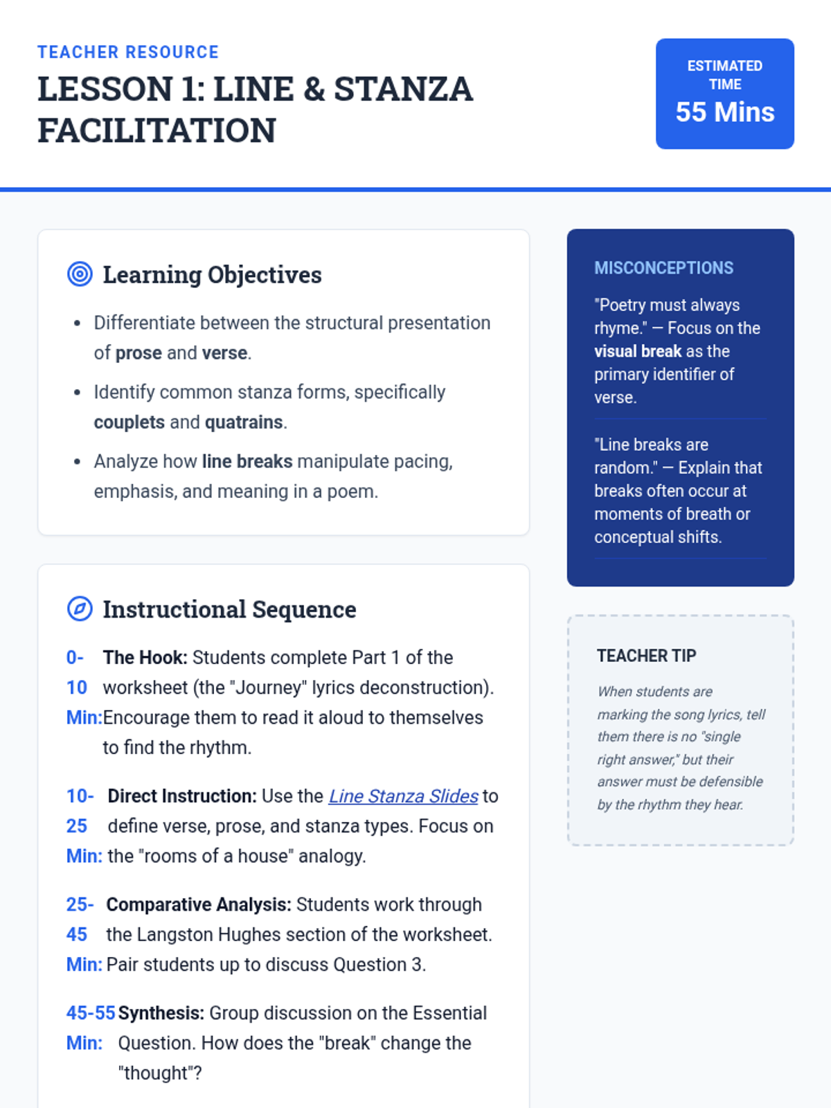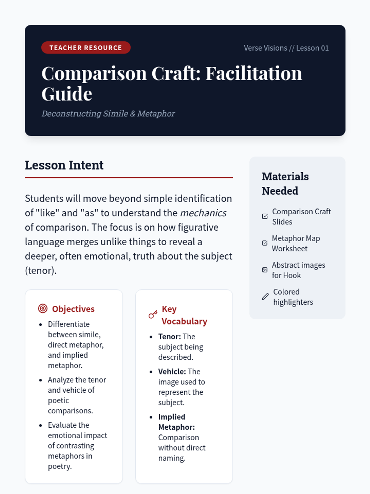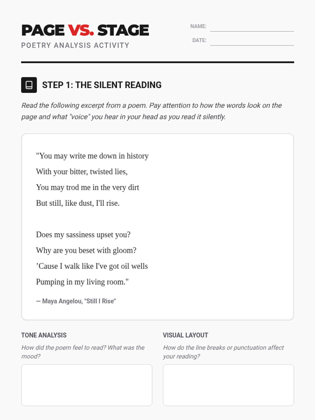 This 3rd-grade sequence explores how imagery, rhythm, and sound devices create meaning in poetry through a multisensory read-along approach. Students progress from visualizing sensory details to analyzing structural elements and finally synthesizing their understanding by creating their own audio-enhanced poetry experiences.