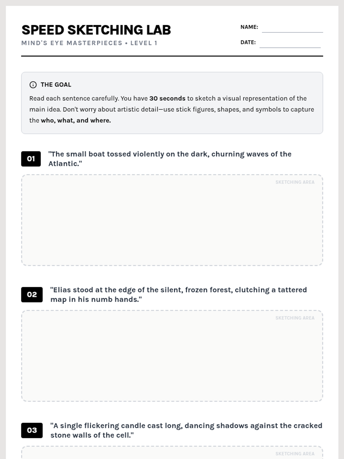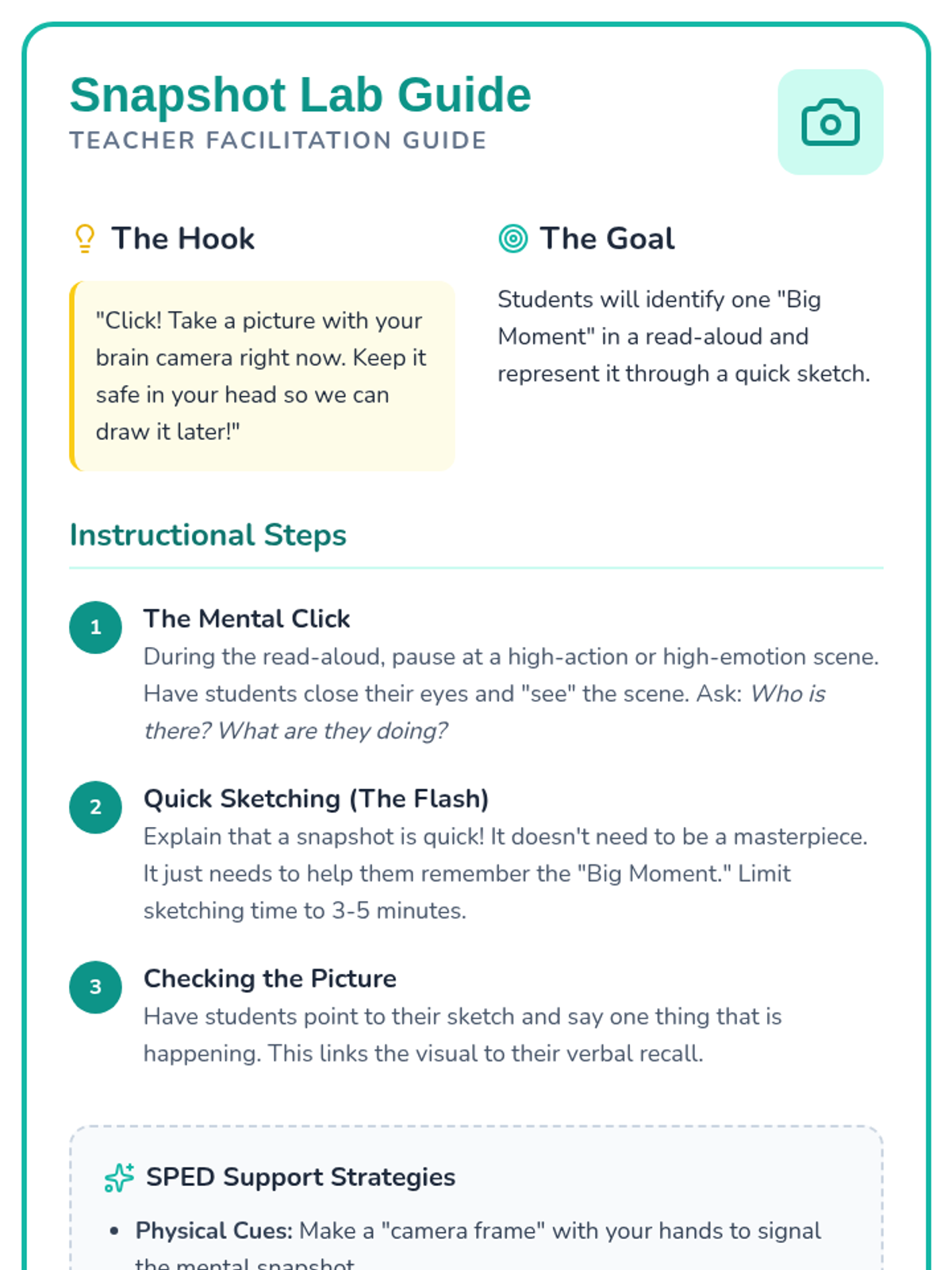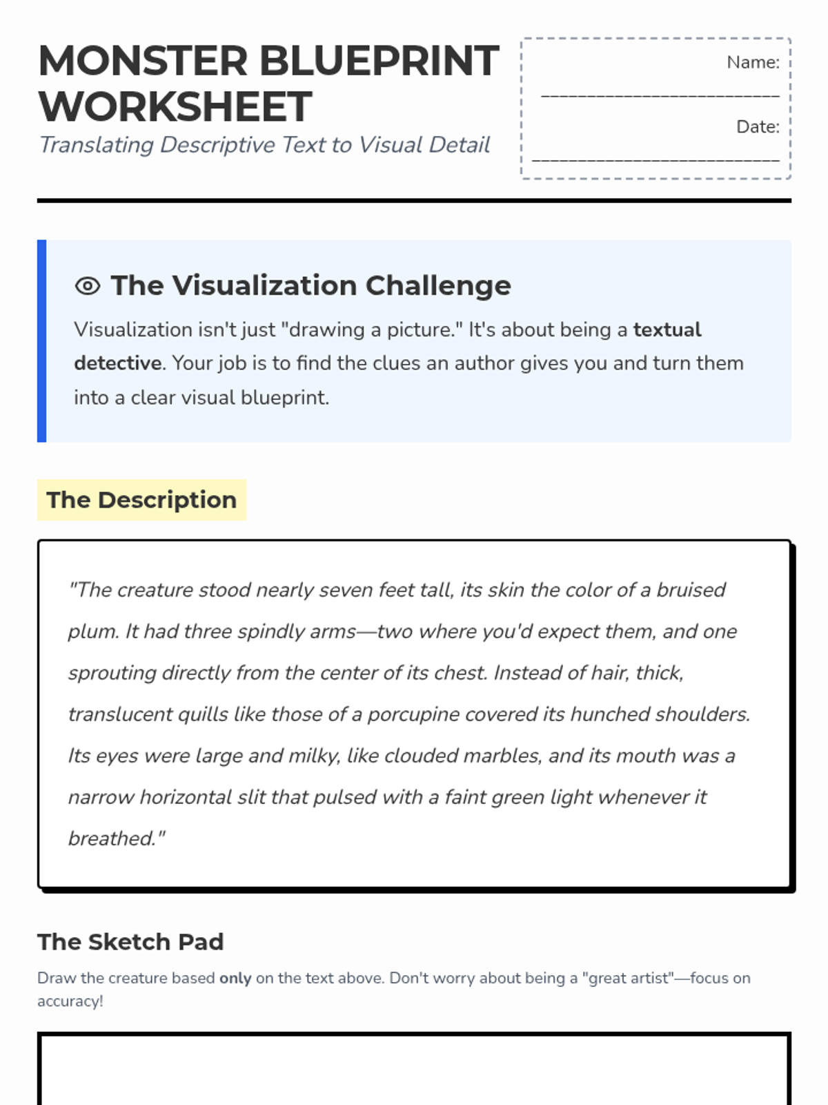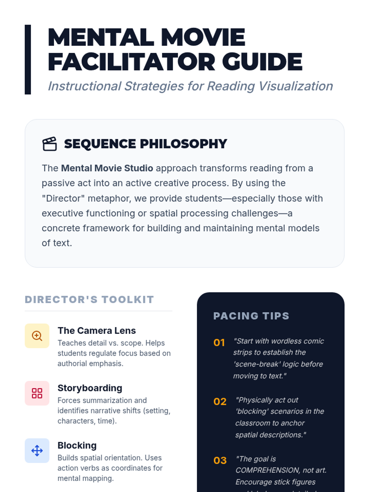 A project-based sequence where 3rd-grade students use auditory cues from read-along texts to strengthen their visualization and story mapping skills. Students progress from sketching settings and characters to creating a full storyboard synchronized with audio narration.