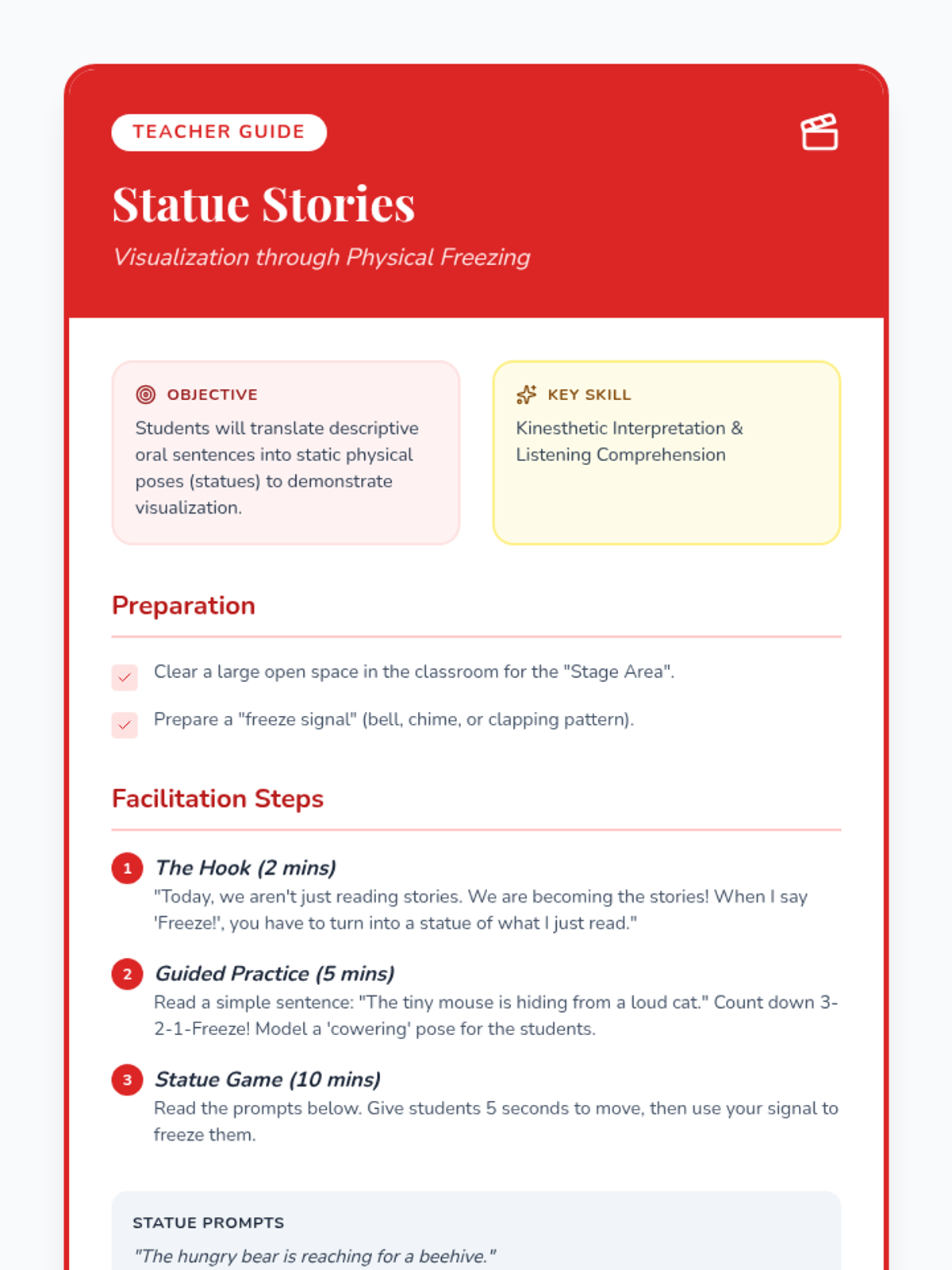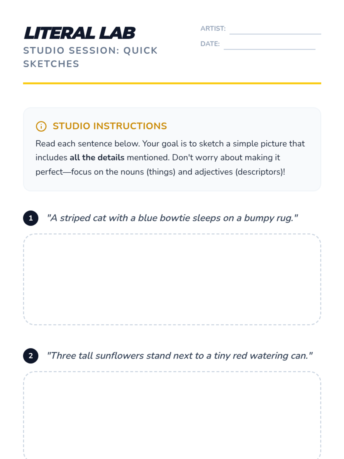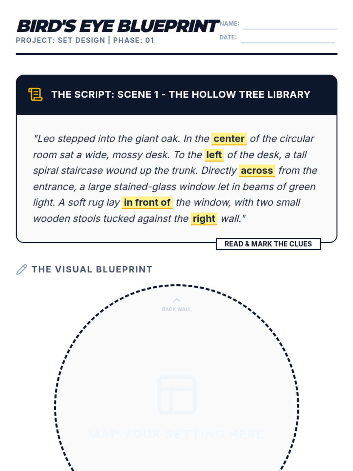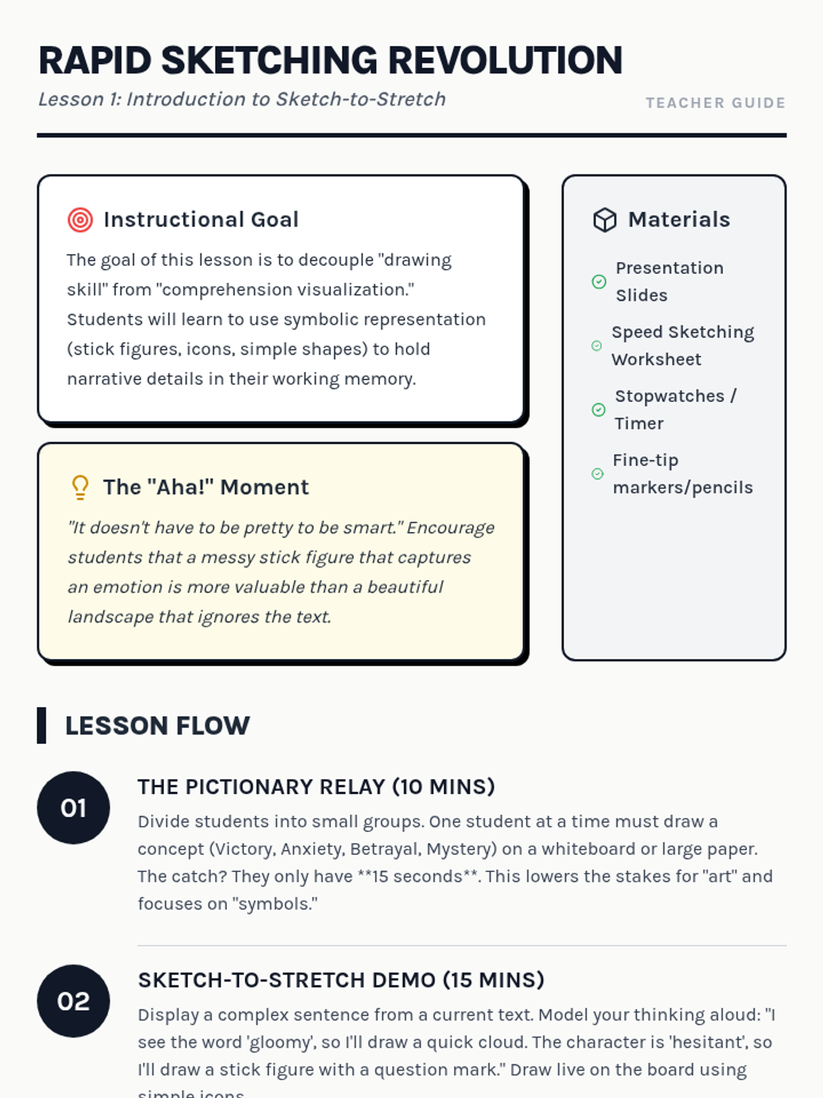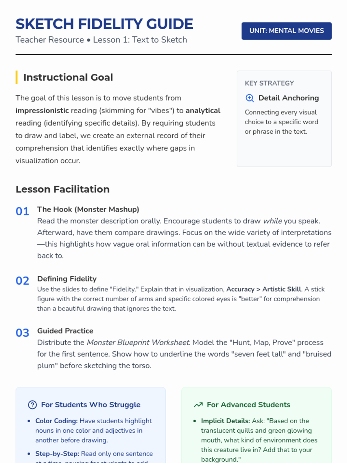 A project-based sequence where 3rd-grade students use auditory cues from read-along texts to strengthen their visualization and story mapping skills. Students progress from sketching settings and characters to creating a full storyboard synchronized with audio narration.
