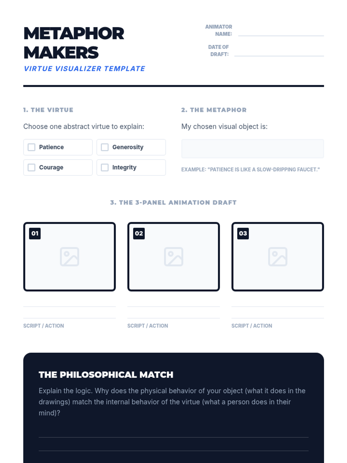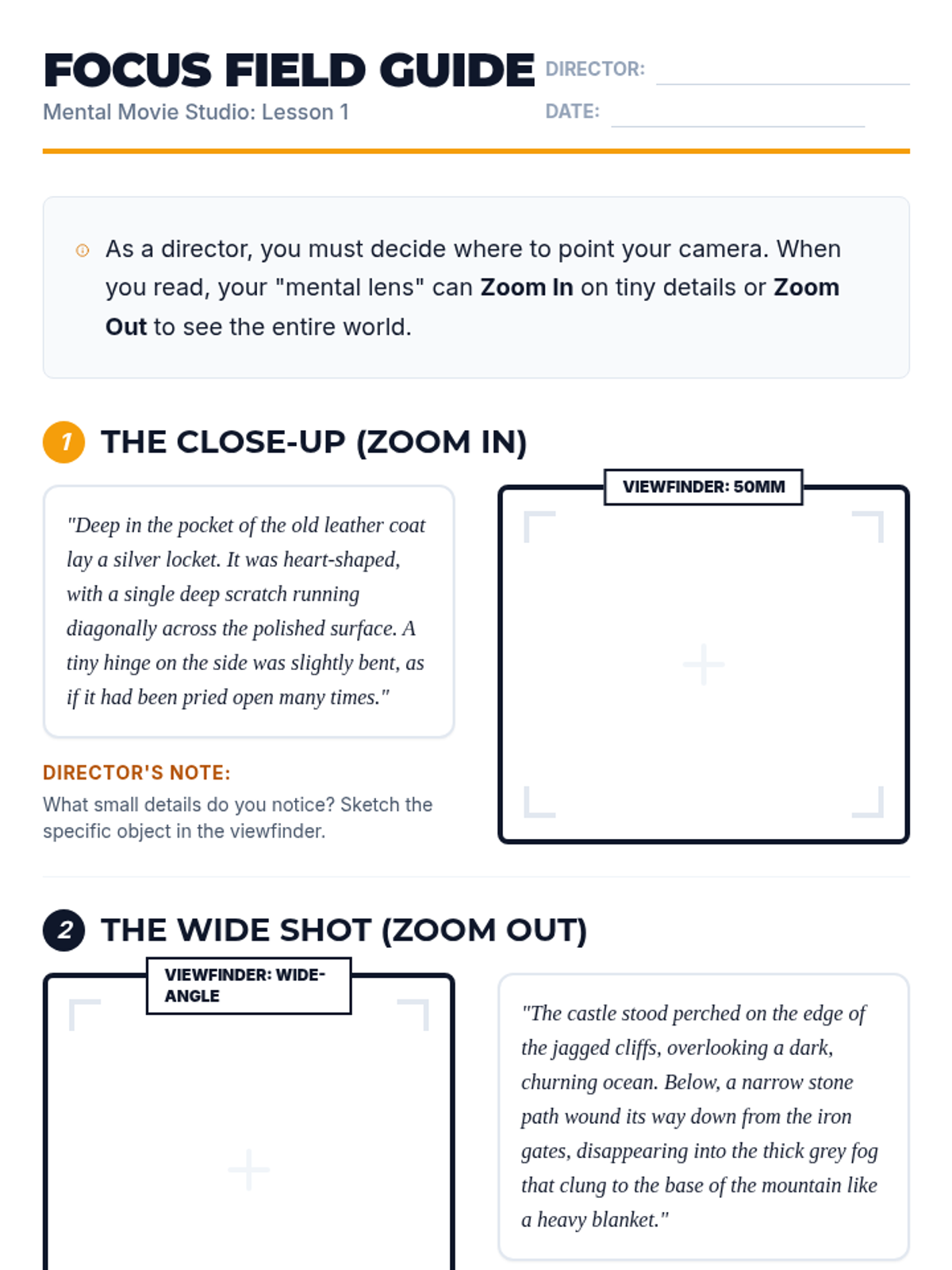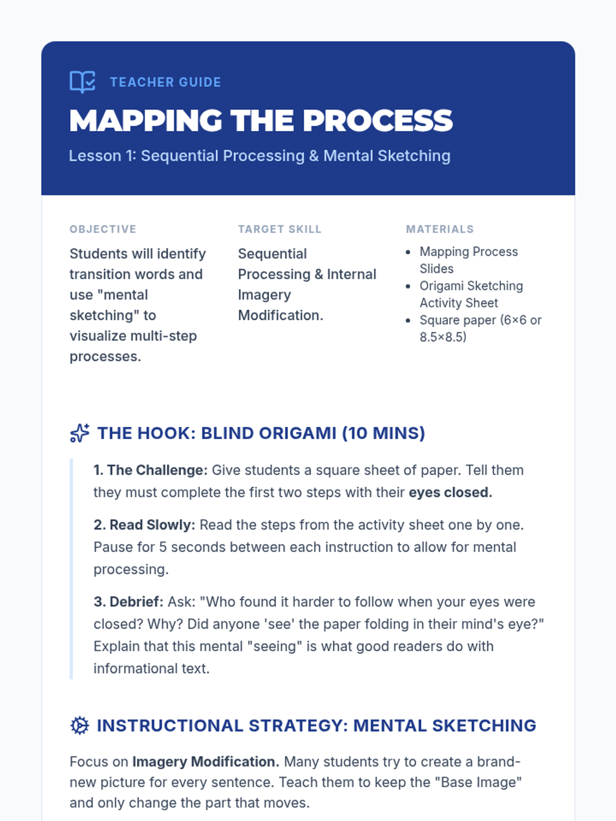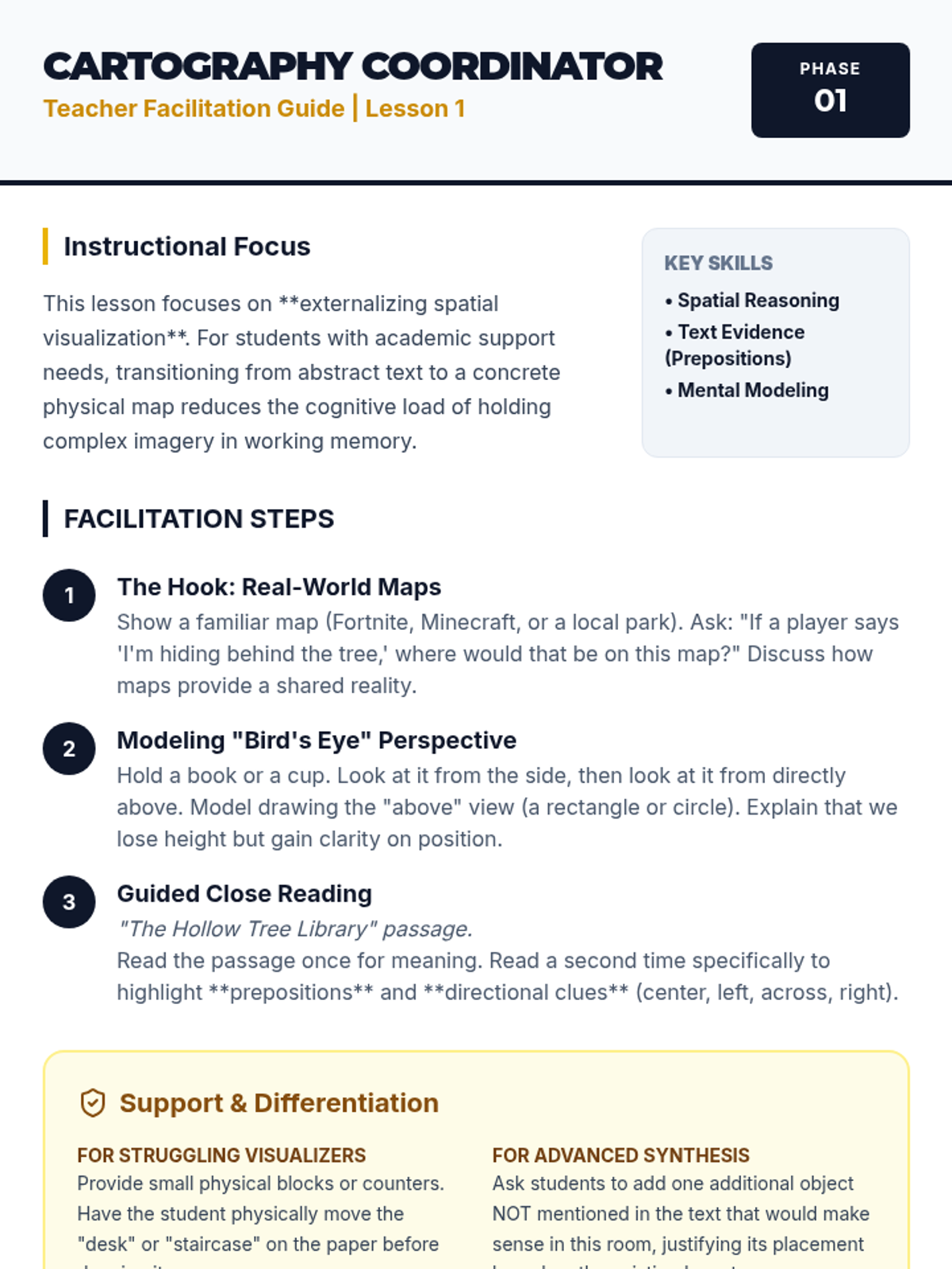 A project-based sequence where 3rd-grade students use auditory cues from read-along texts to strengthen their visualization and story mapping skills. Students progress from sketching settings and characters to creating a full storyboard synchronized with audio narration.