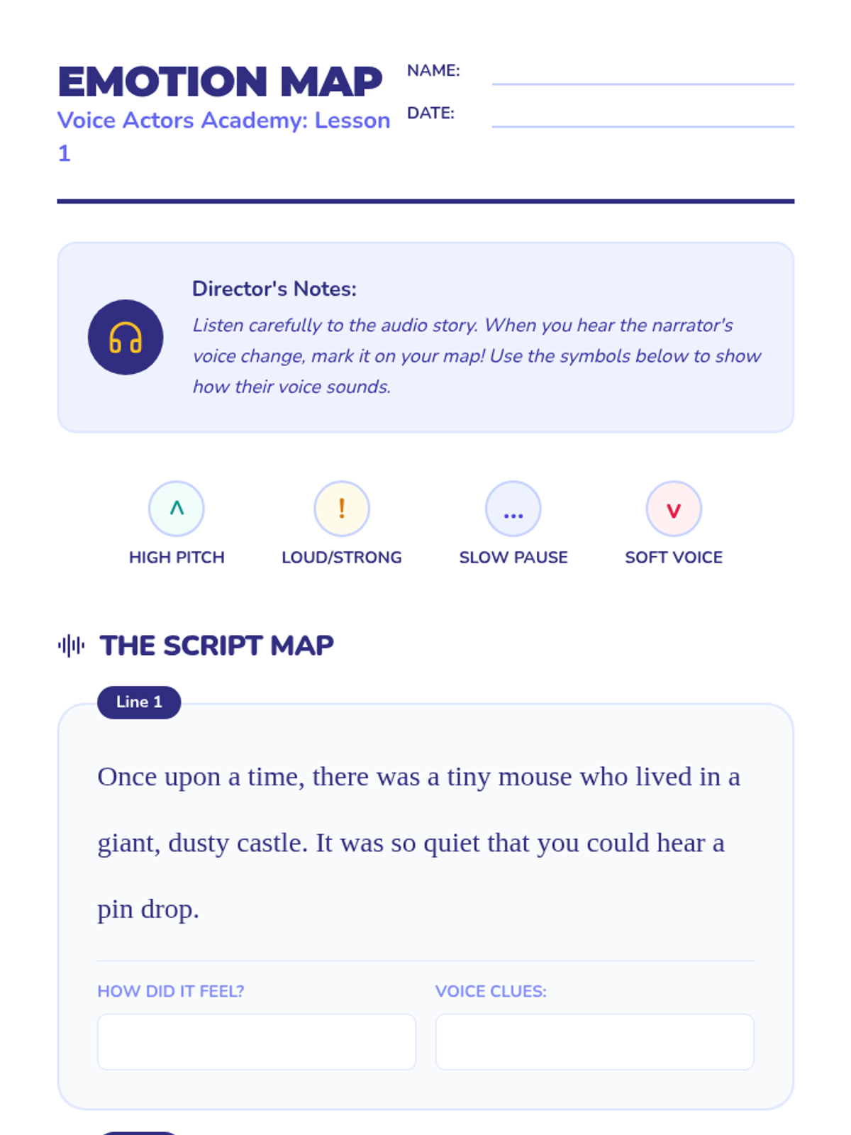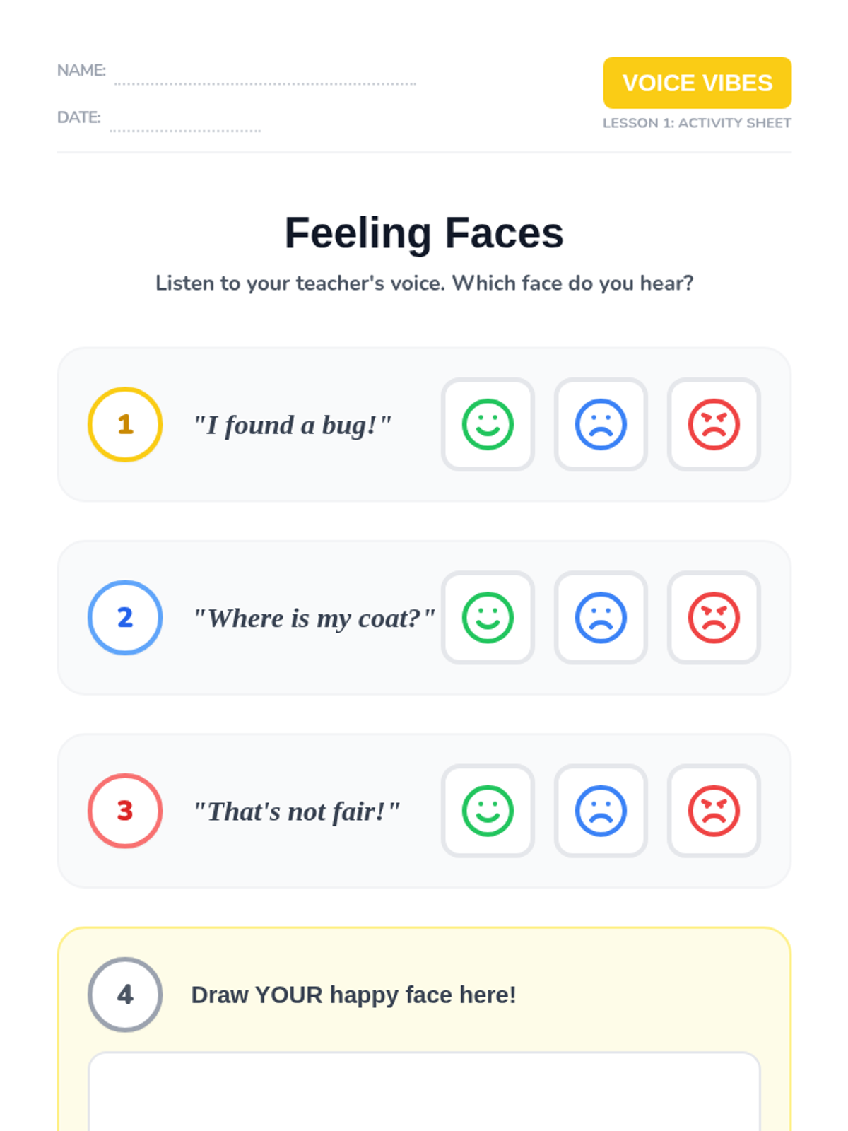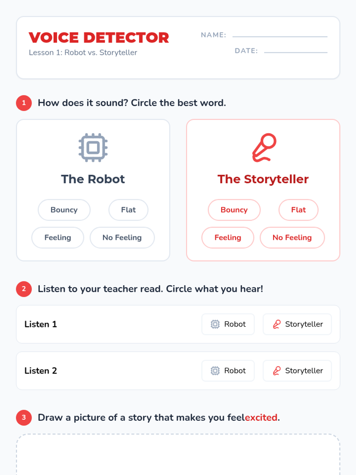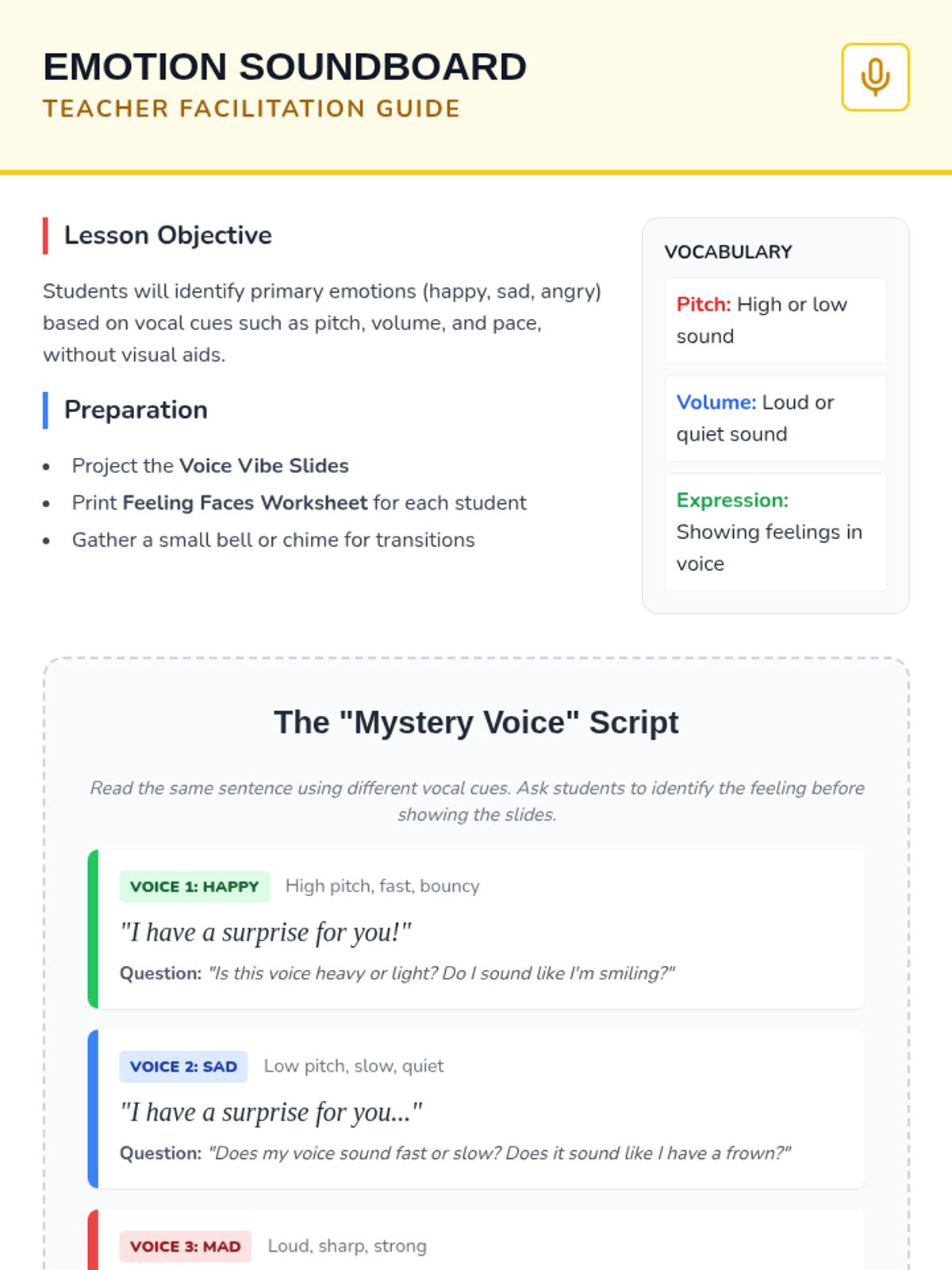 This Kindergarten ELA sequence focuses on developing oral fluency and prosody by exploring how voice modulation (pitch, volume, speed) conveys emotion and meaning in read-aloud literary texts. Students progress from identifying emotions in tone to practicing character voices and punctuation-based intonation, culminating in their own expressive reading performances.