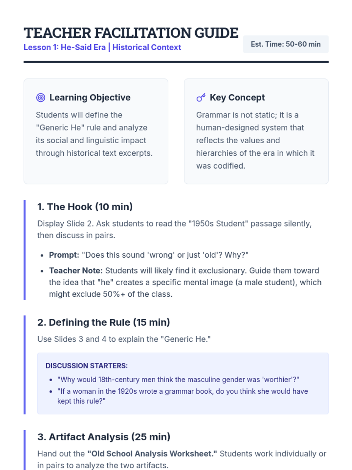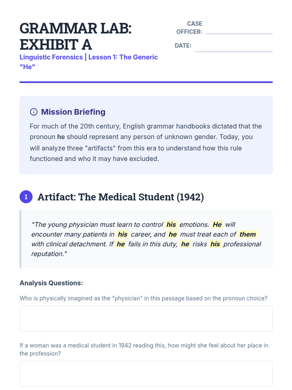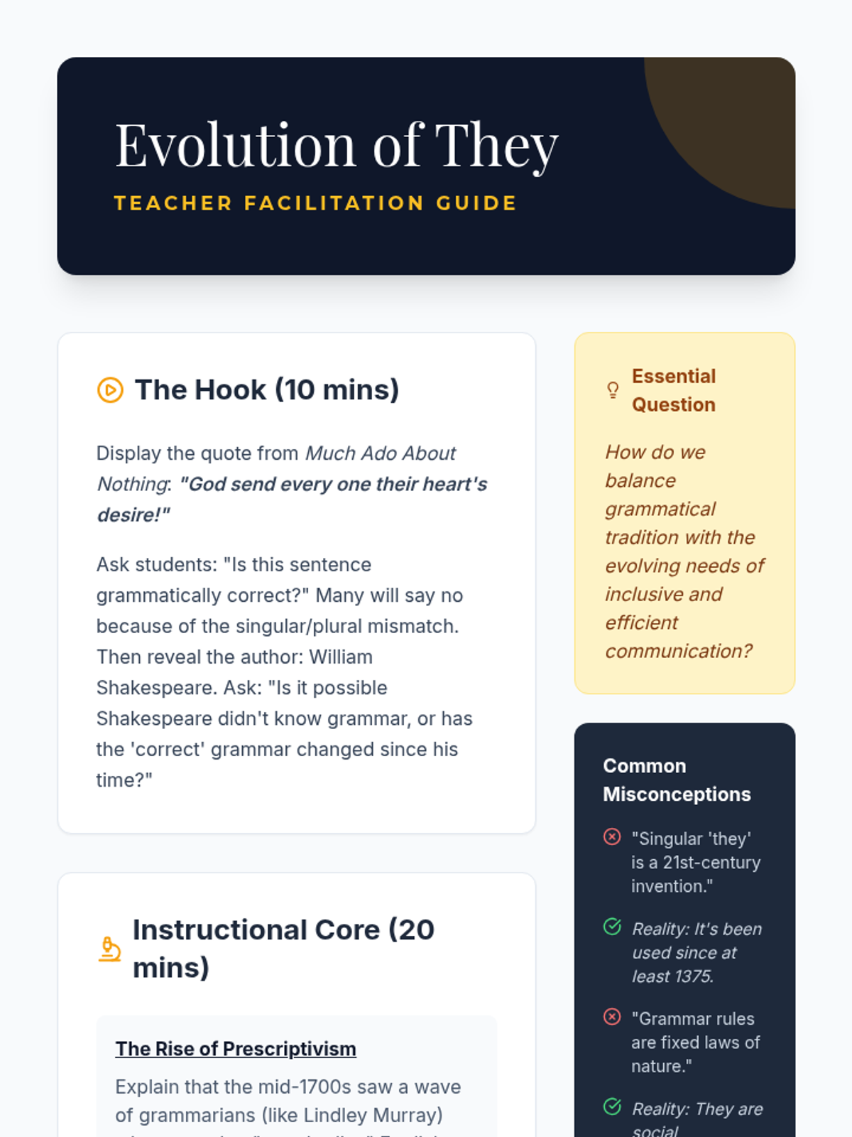This inquiry-based sequence explores the evolving nature of grammar, specifically addressing the debate around the singular 'they' and gender-neutral language. Students move from analyzing historical style guides to evaluating modern usage in journalism and academia.