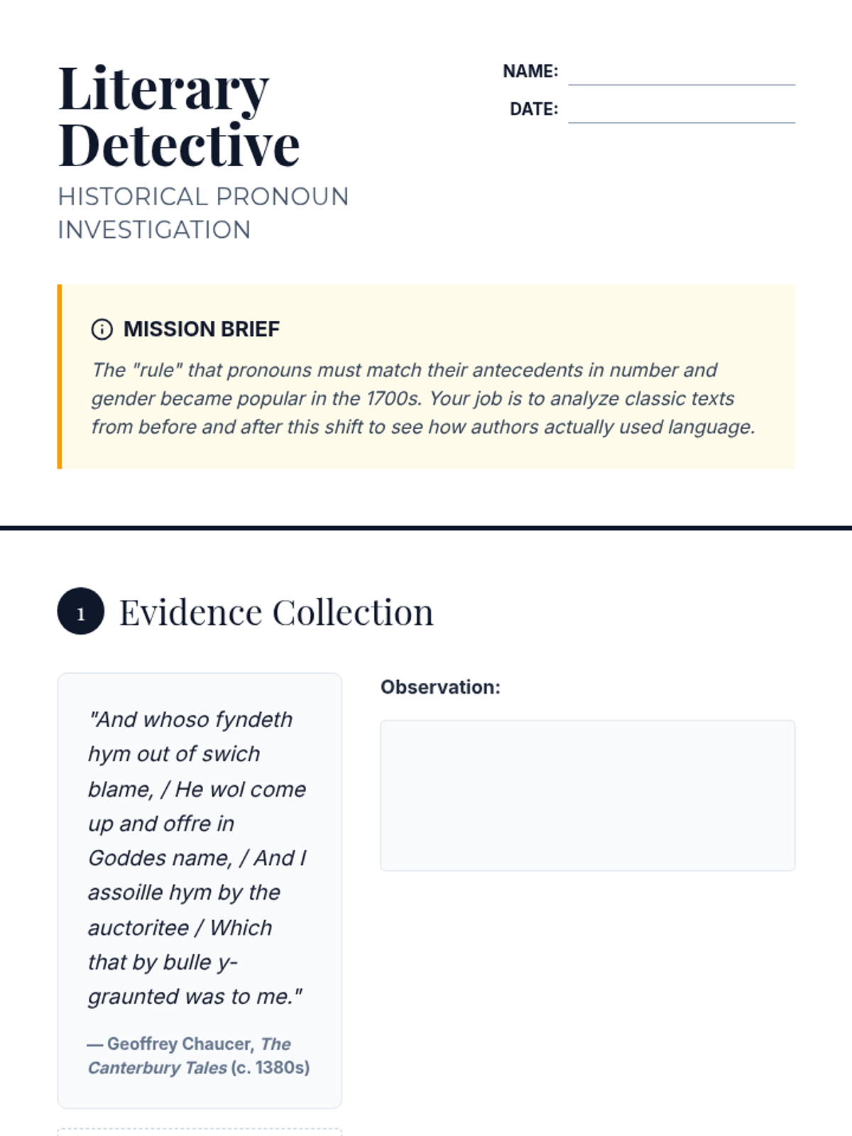 A 12th-grade ELA sequence exploring the linguistic evolution of pronoun-antecedent agreement, focusing on the singular 'they', modern style guide standards, and professional inclusivity. Students transition from historical inquiry to practical application and future prediction.
