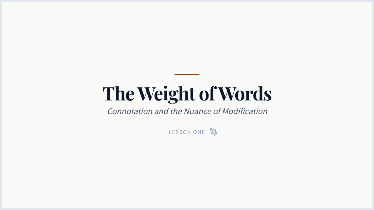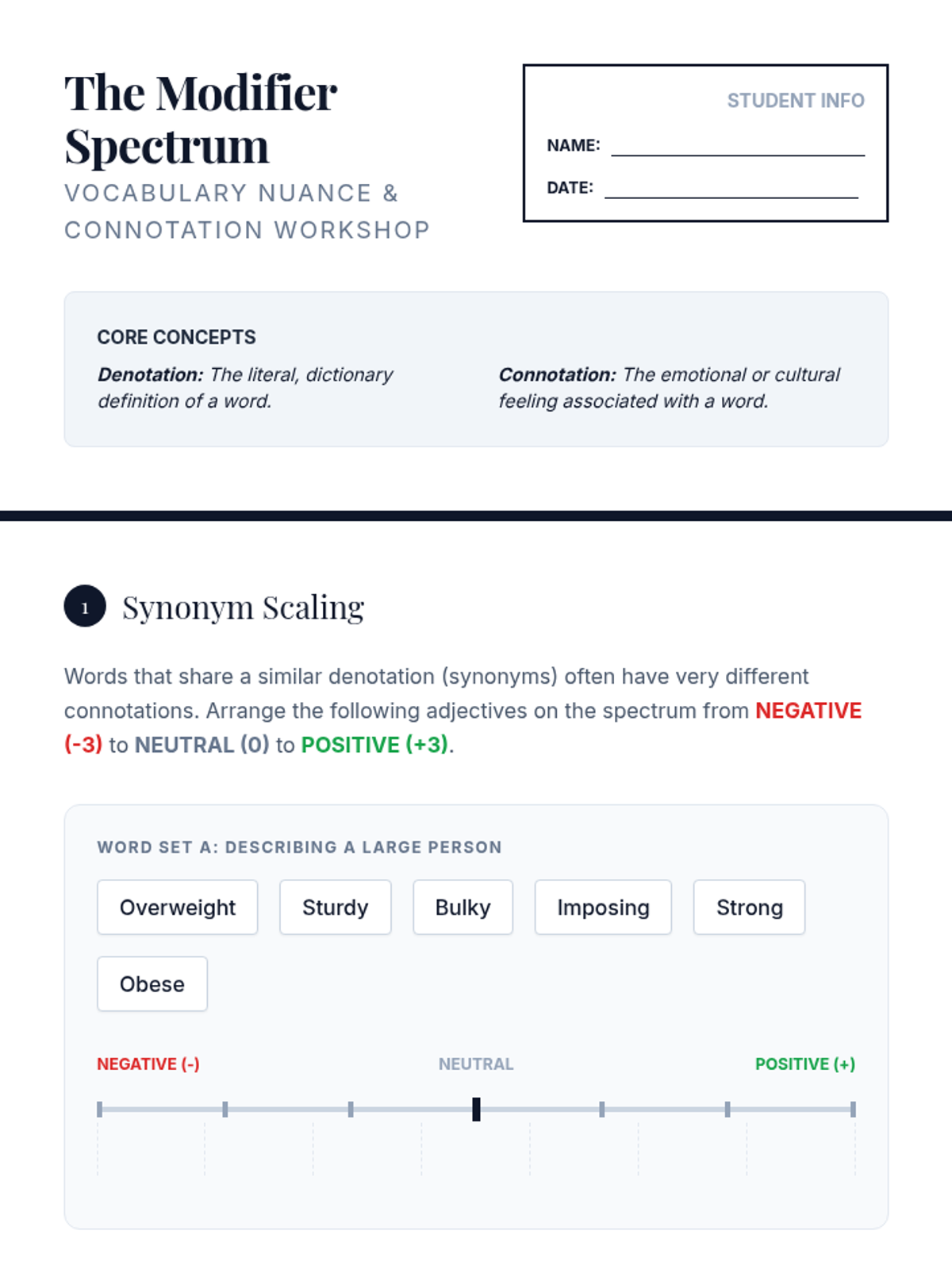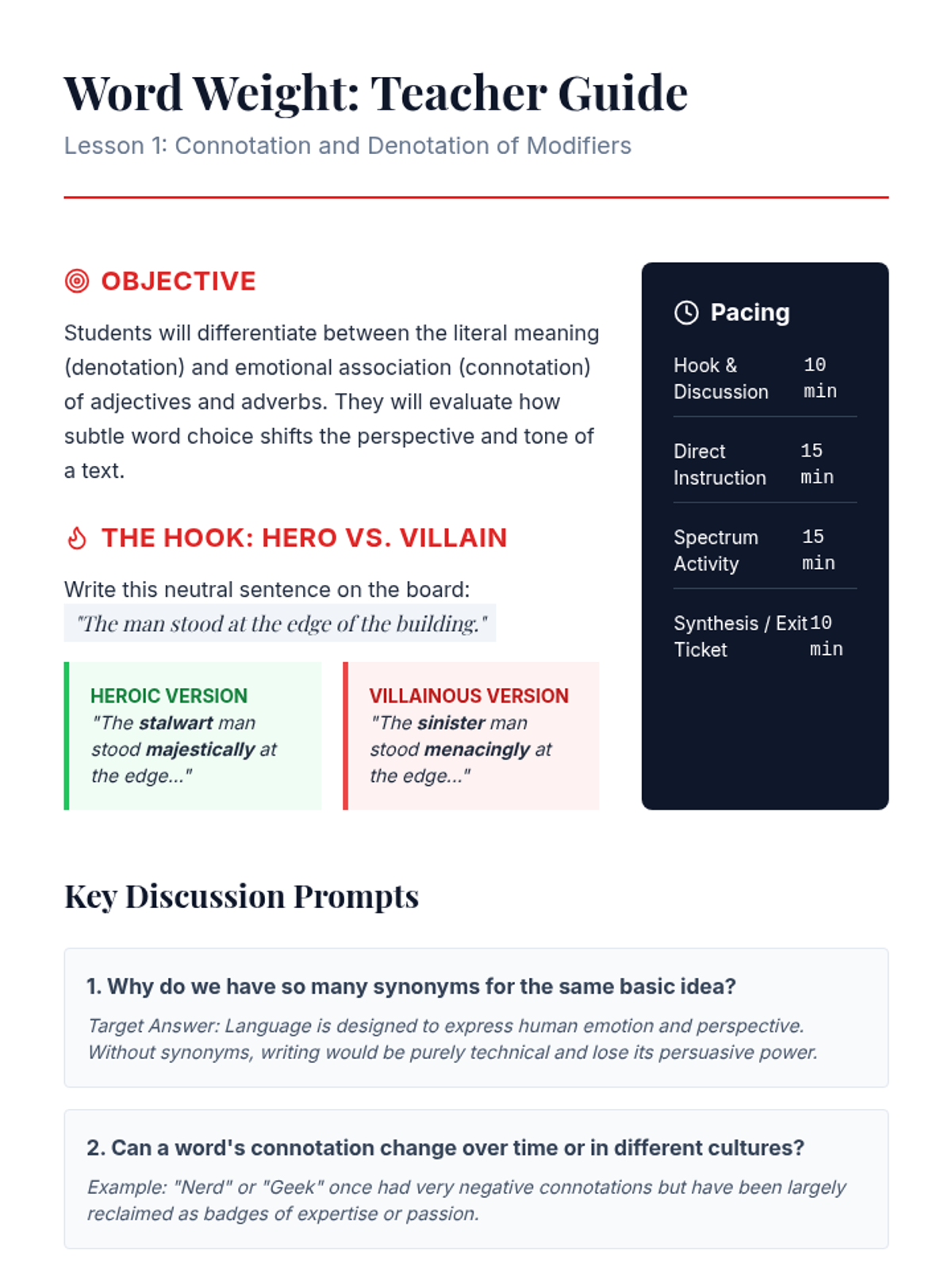 A high school ELA sequence exploring how adjectives and adverbs function as rhetorical tools to shape tone, atmosphere, and narrator reliability. Students progress from analyzing simple connotations to writing full rhetorical analyses of modifier choices in classic and modern texts.