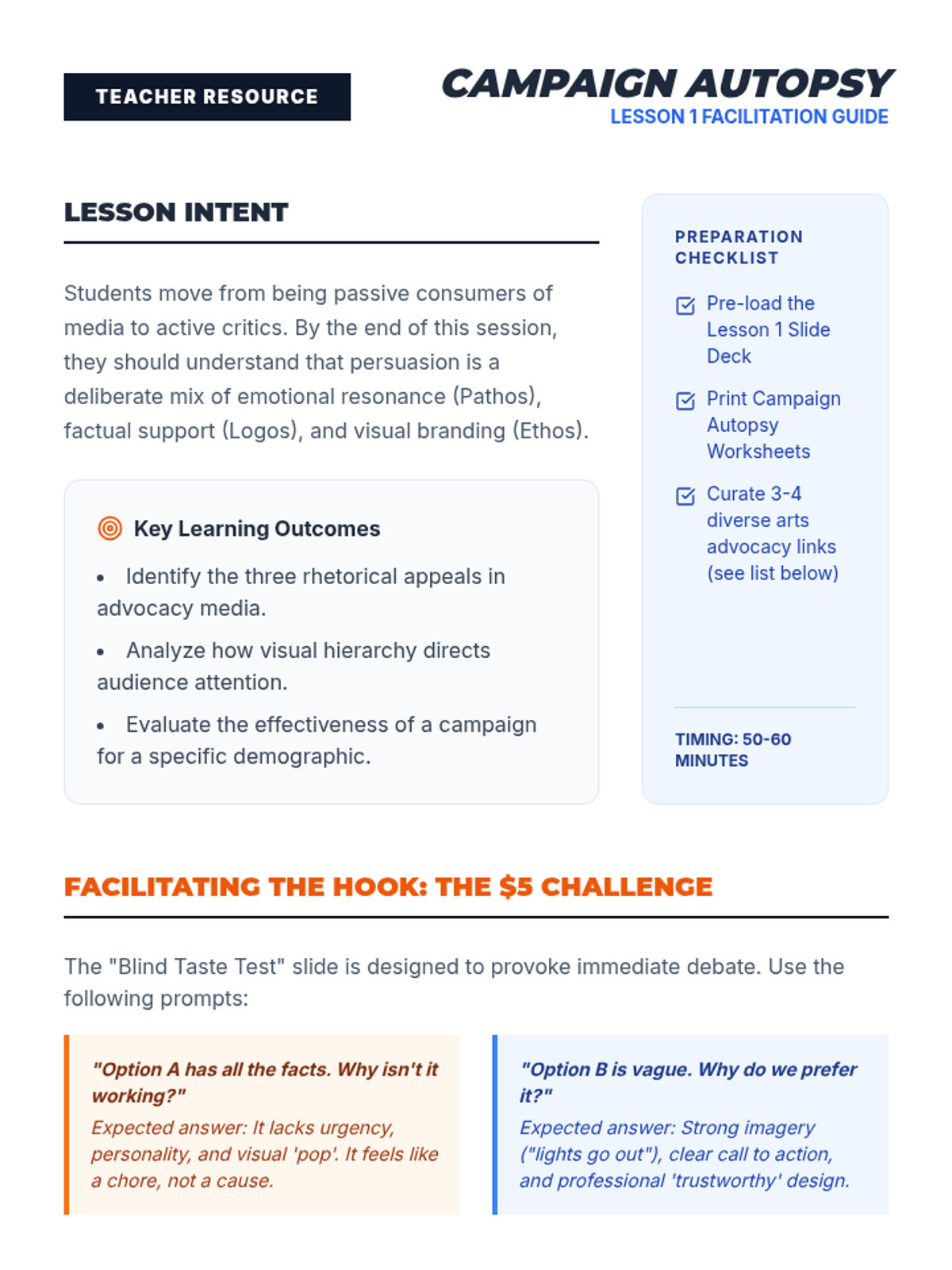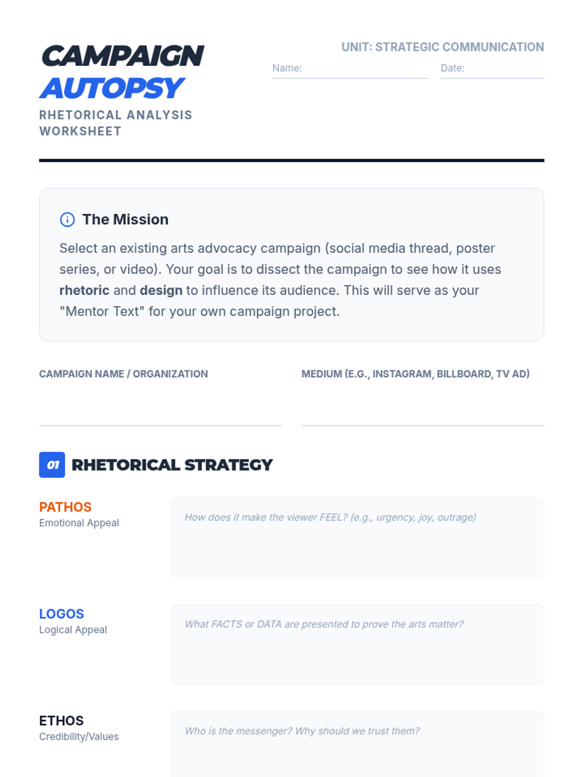 A project-based sequence where 10th-grade students design a comprehensive media campaign for a local arts initiative, mastering rhetorical analysis, audience profiling, data visualization, and professional pitch techniques.