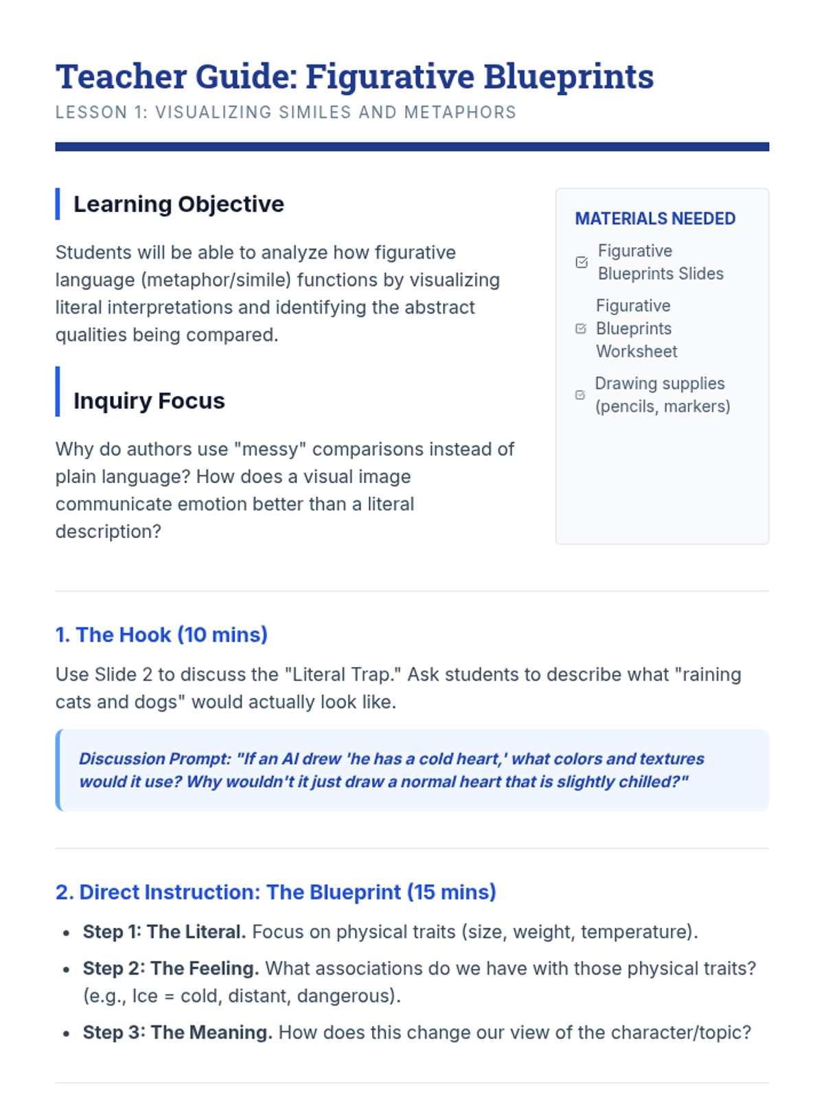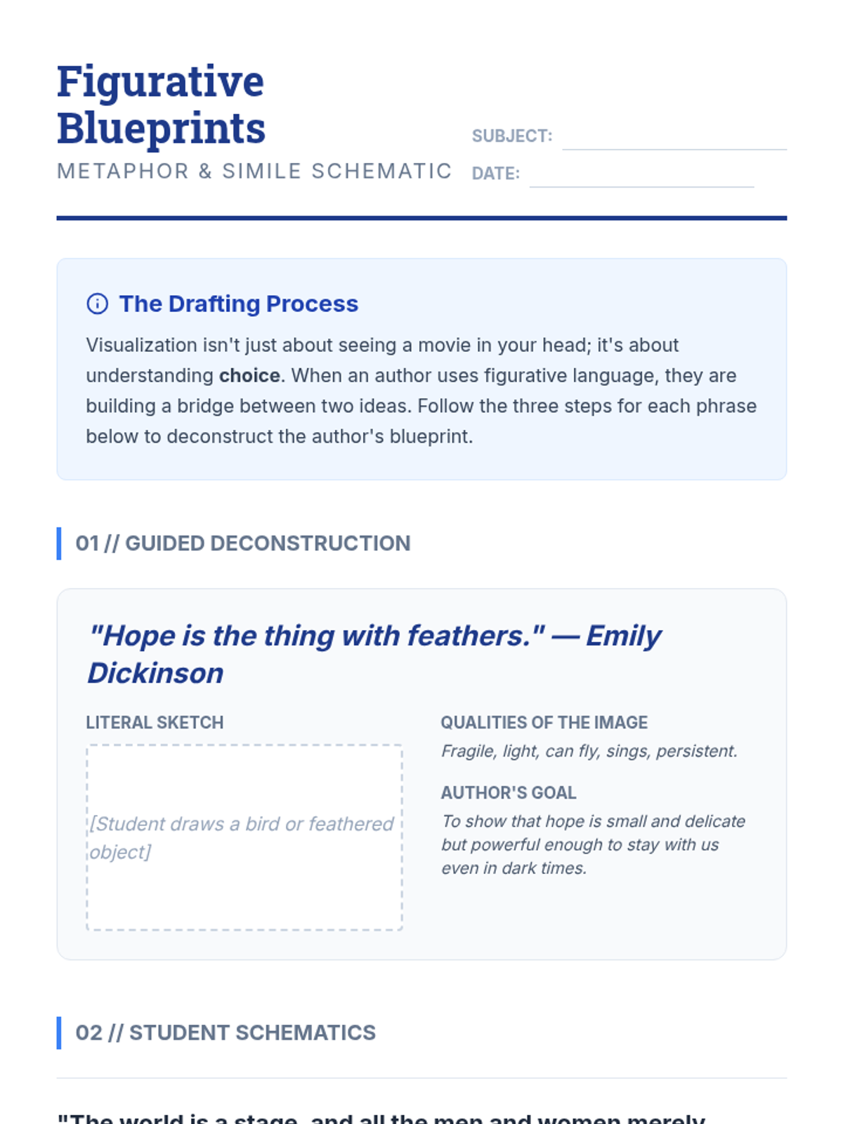 Literary DevicesFigurative language techniques including metaphor, irony, and symbolism used to deepen narrative meaning. Equips students with tools to analyze authorial intent and enhance creative writing.