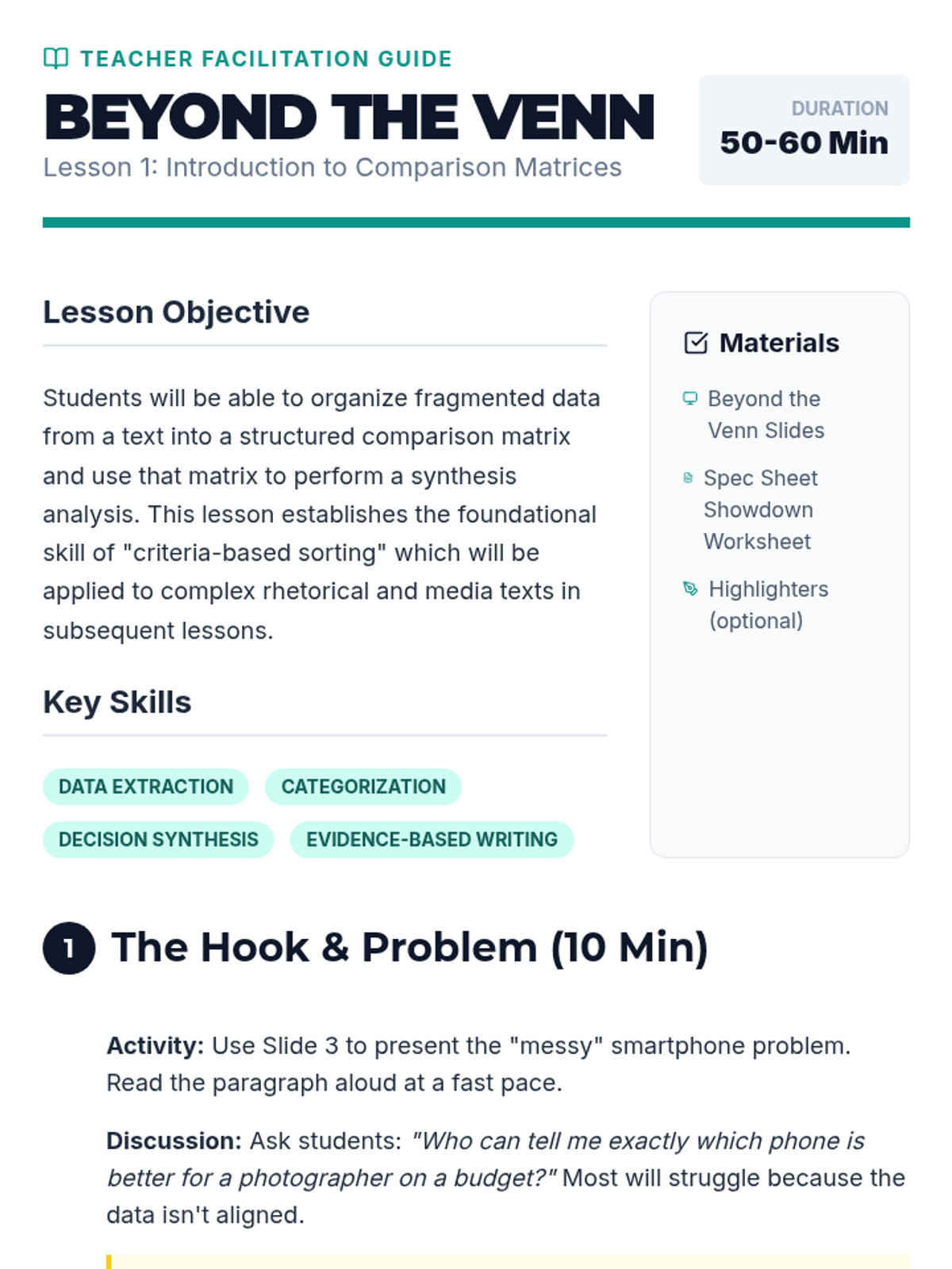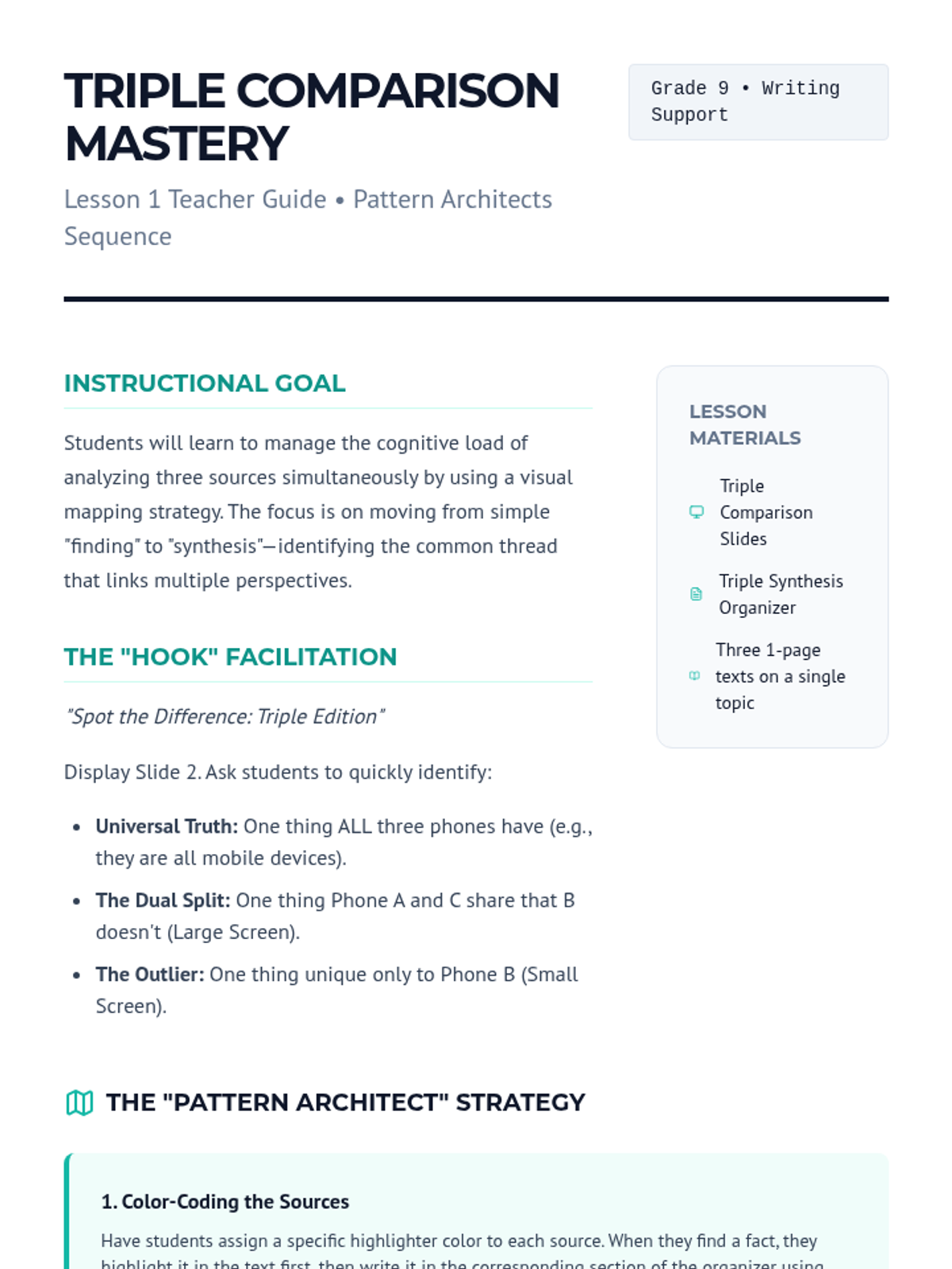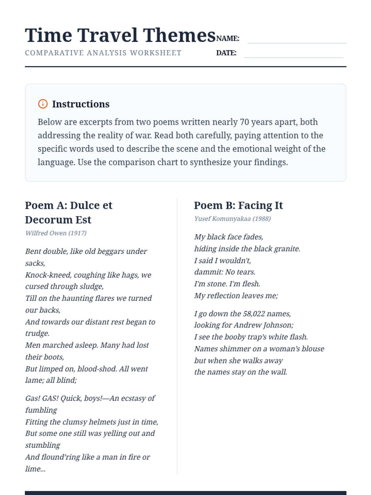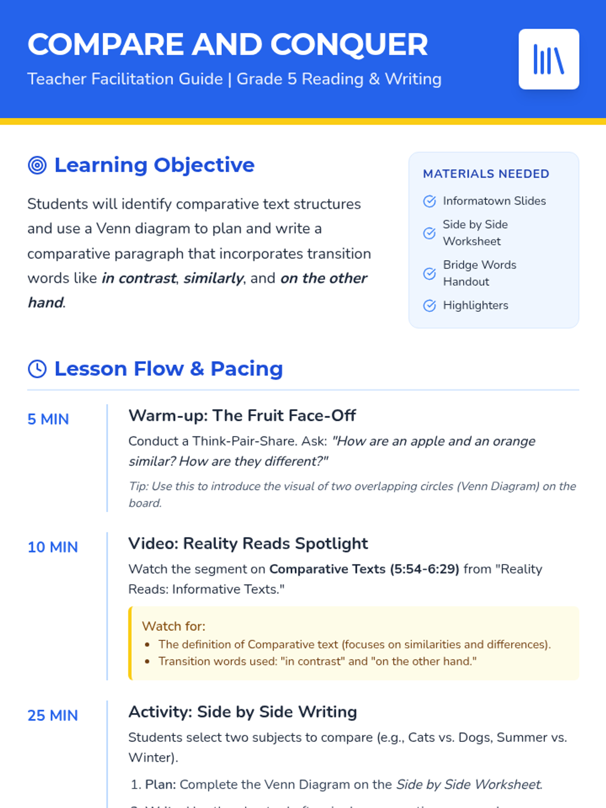 Comparing TextsTechniques for identifying similarities and differences in perspective, structure, and theme across diverse genres. Equips students to synthesize information and evaluate how different mediums approach shared topics.