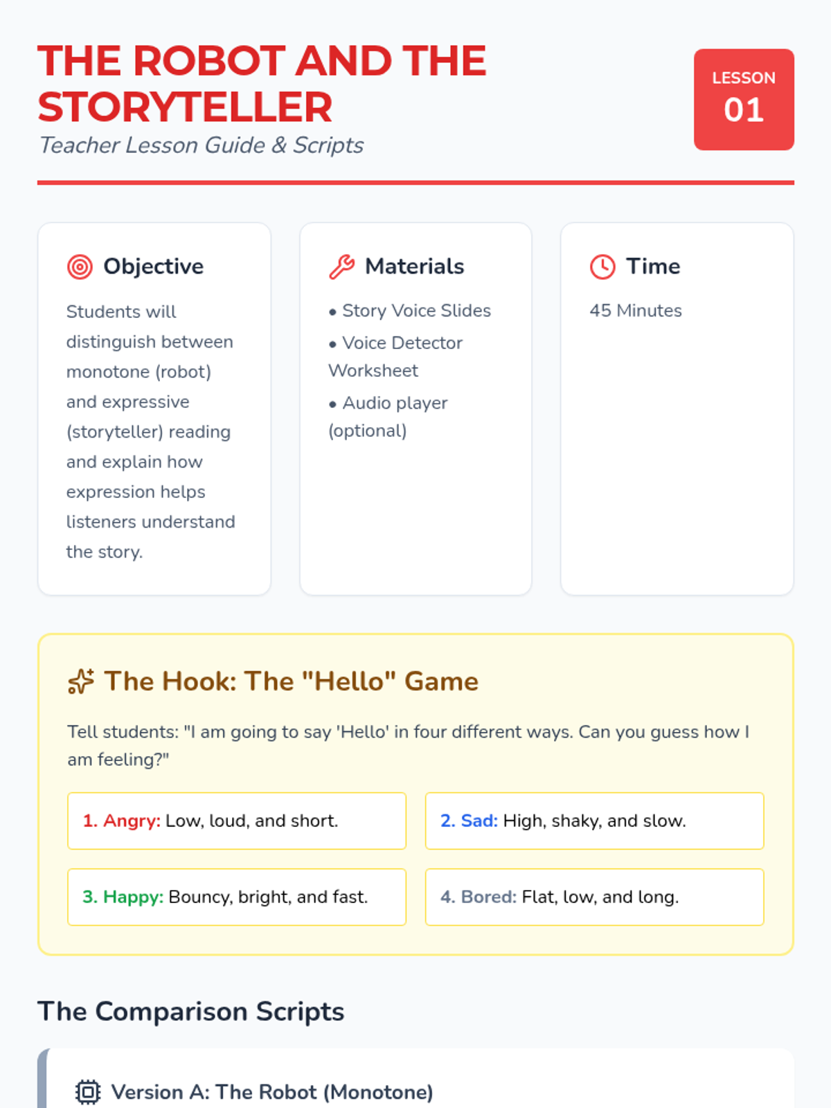 This sequence focuses on developing oral reading fluency and expression in 1st-grade students using read-along tools. Students learn to differentiate between monotone and expressive reading, match their voice to emotions and punctuation, and perform stories with prosody.