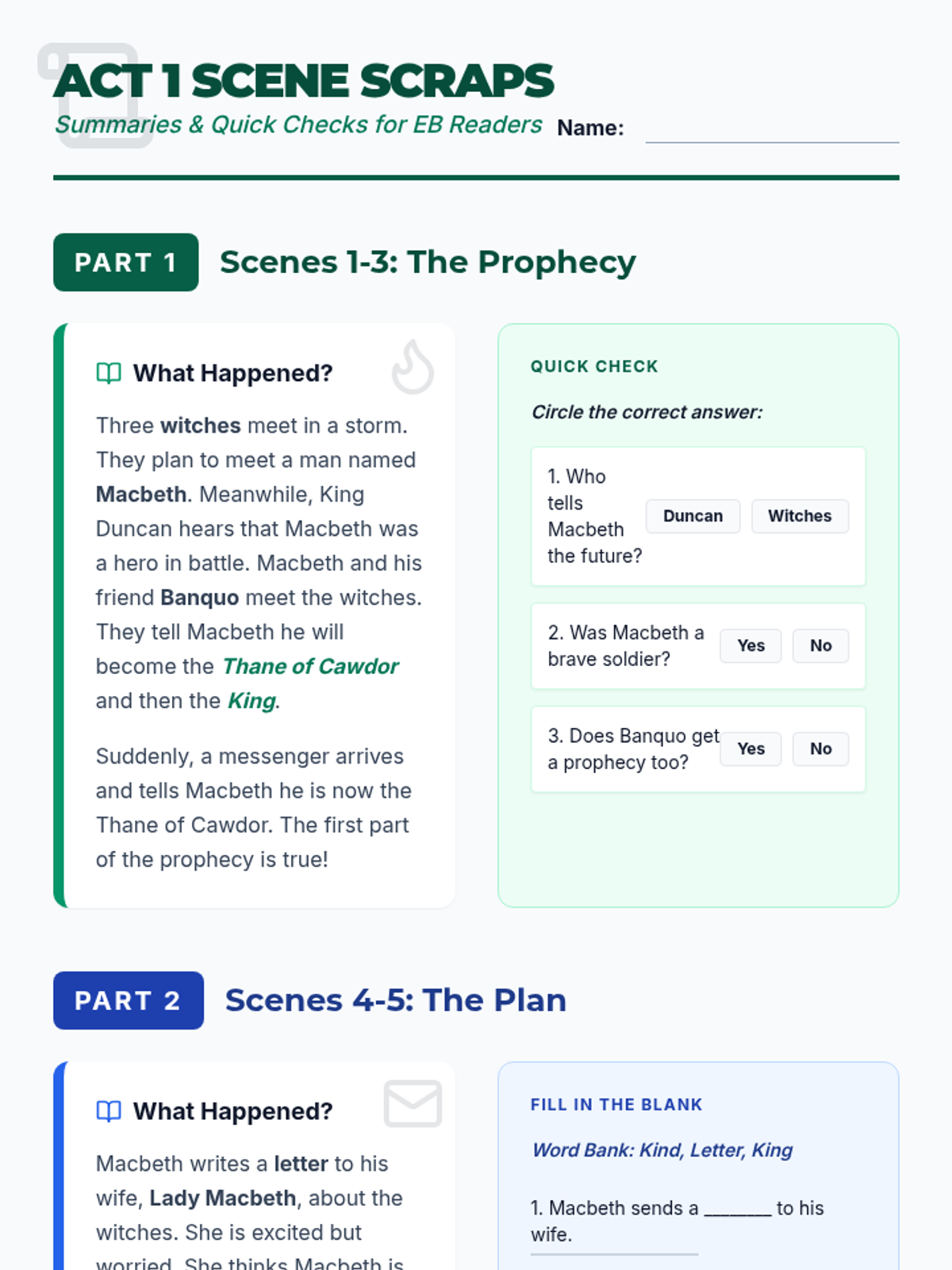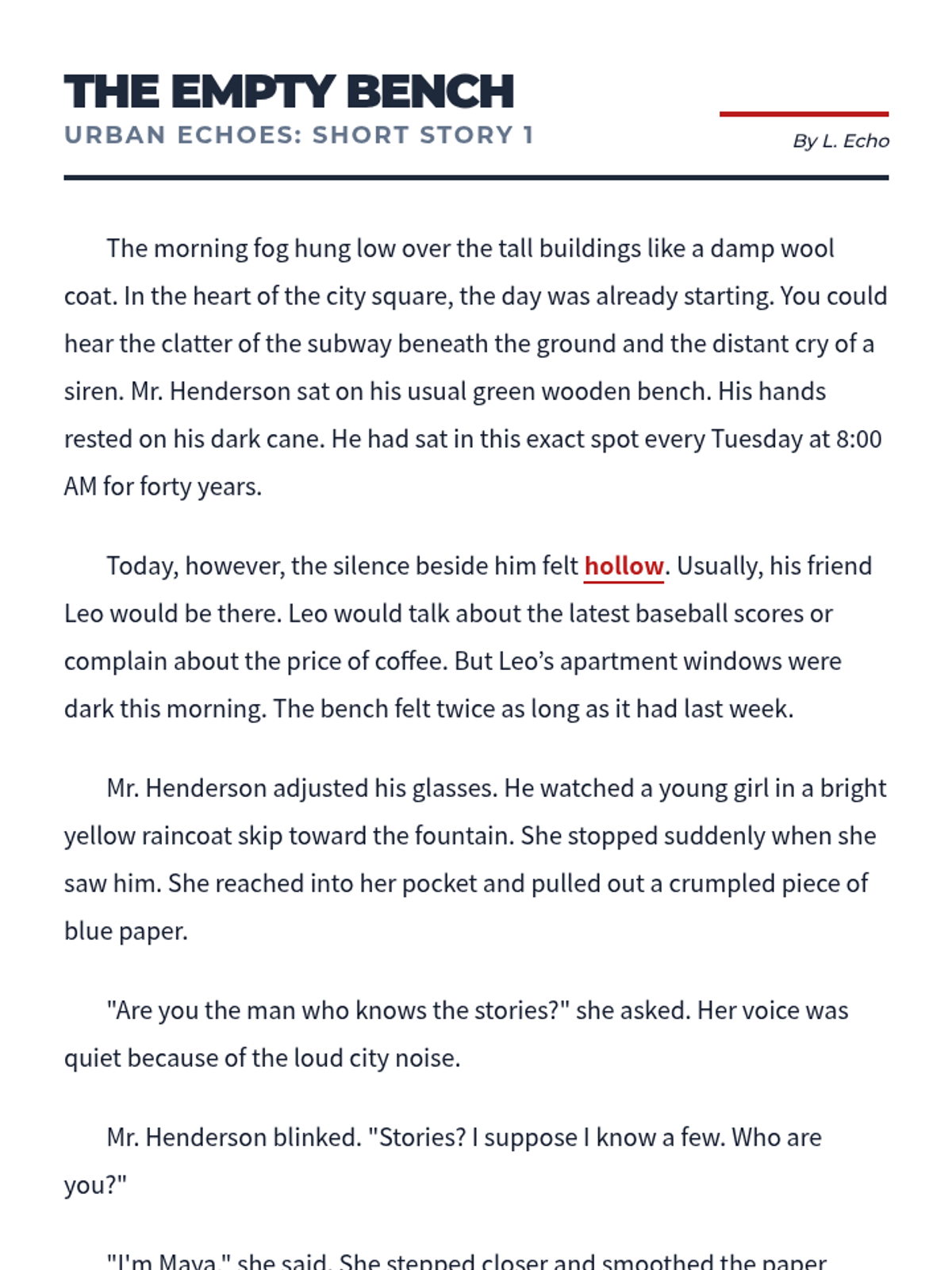 Read-Along Literary TextsAudio-narrated stories and poems paired with highlighted text. Builds reading fluency and vocabulary through multisensory engagement with literature.