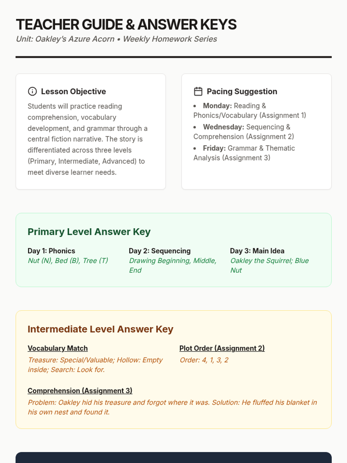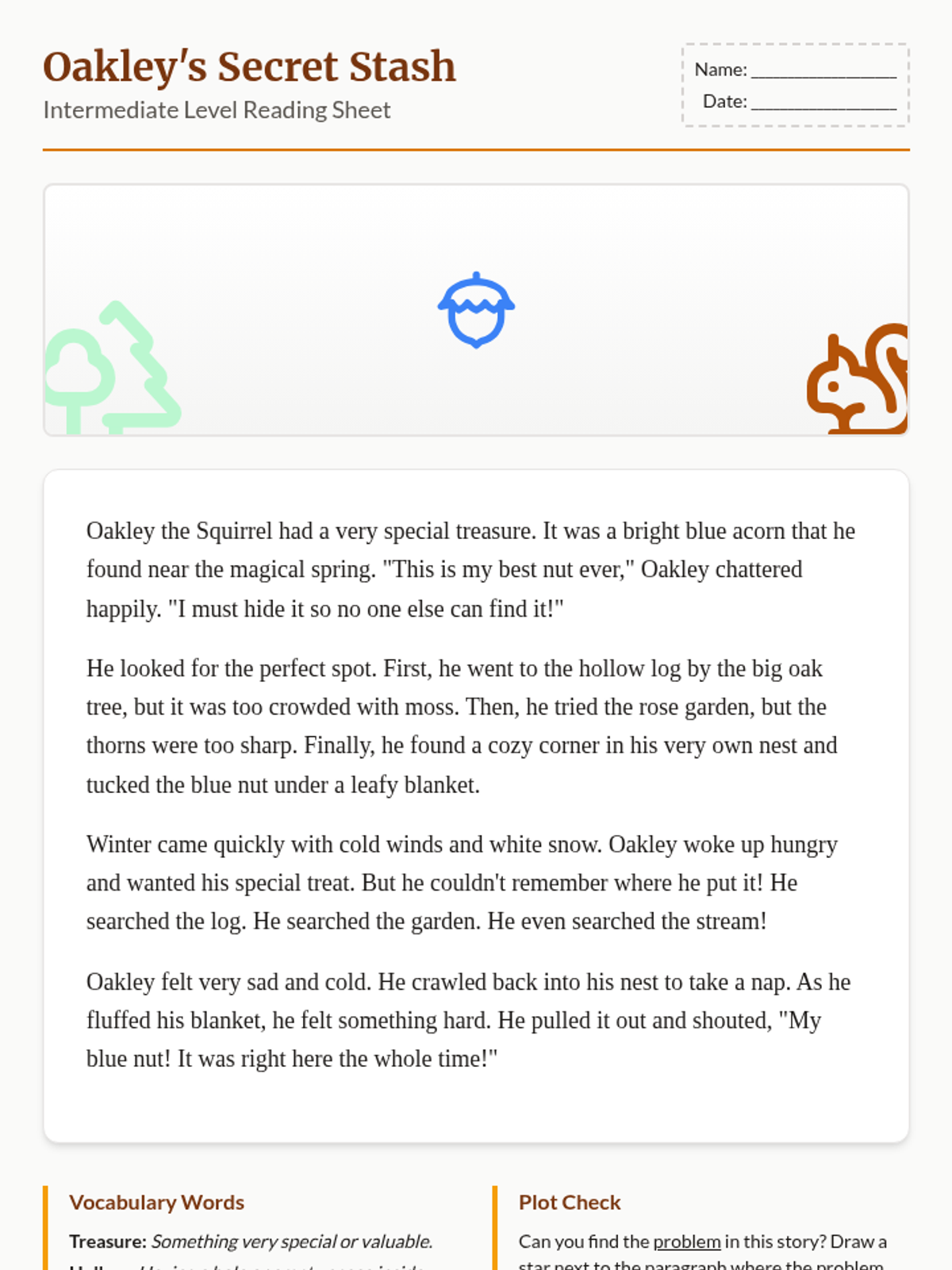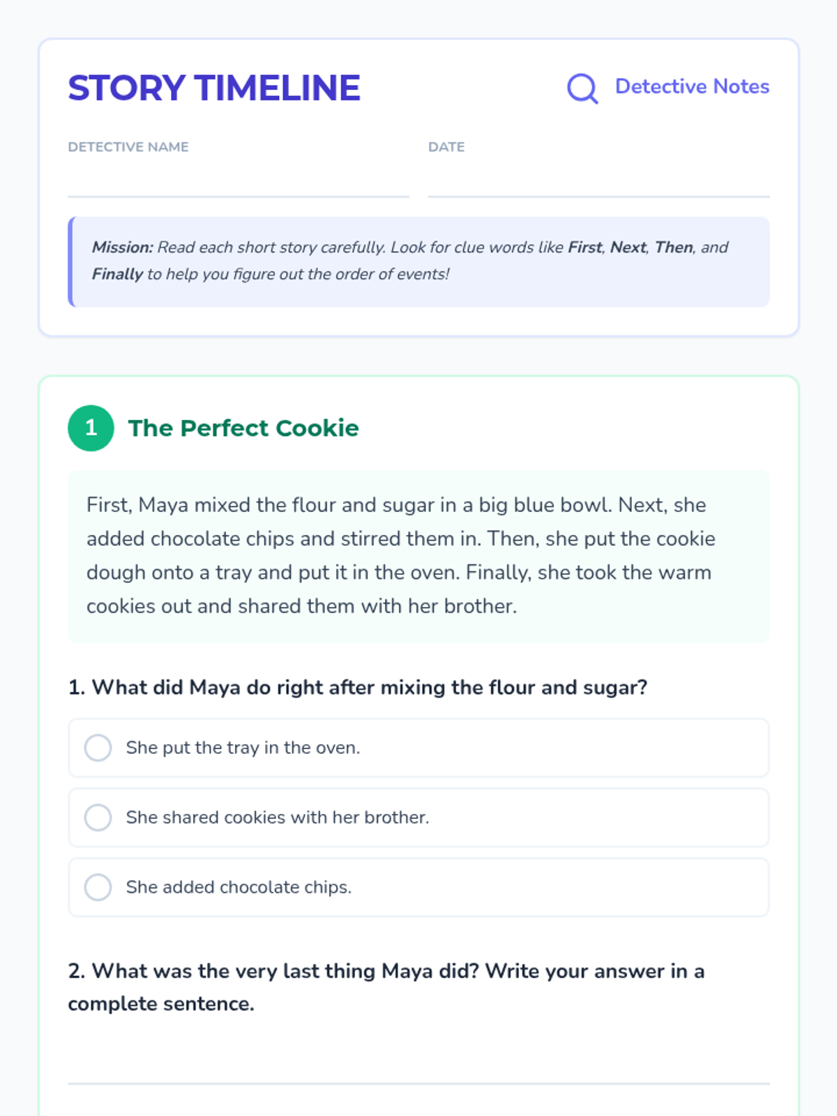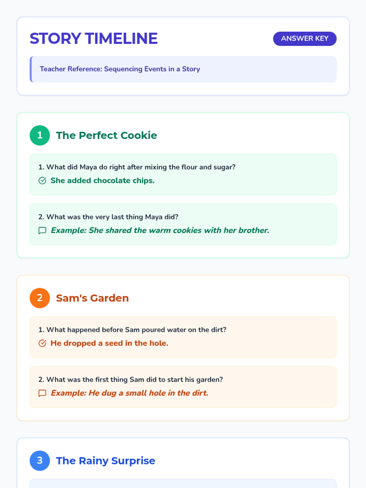 A foundational Pre-K sequence introducing the concepts of beginning, middle, and end through interactive read-alongs. Students learn to identify narrative structure, spot story problems, and sequence events using visual aids.