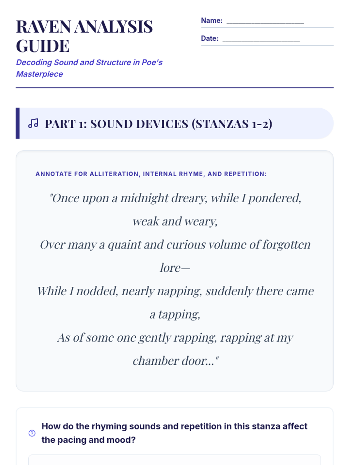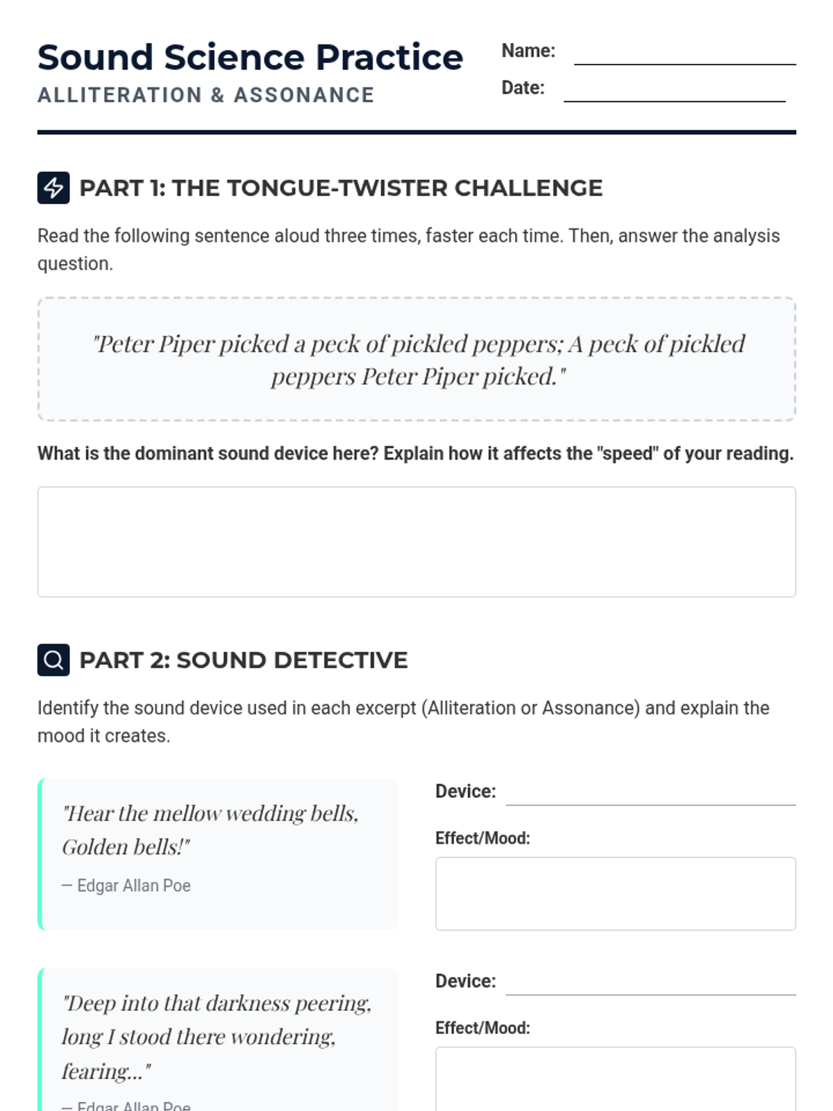 Poetry ElementsStanza structure, rhyme schemes, and meter across various poetic forms. Examines figurative language like metaphors and similes alongside sound devices such as alliteration and onomatopoeia.