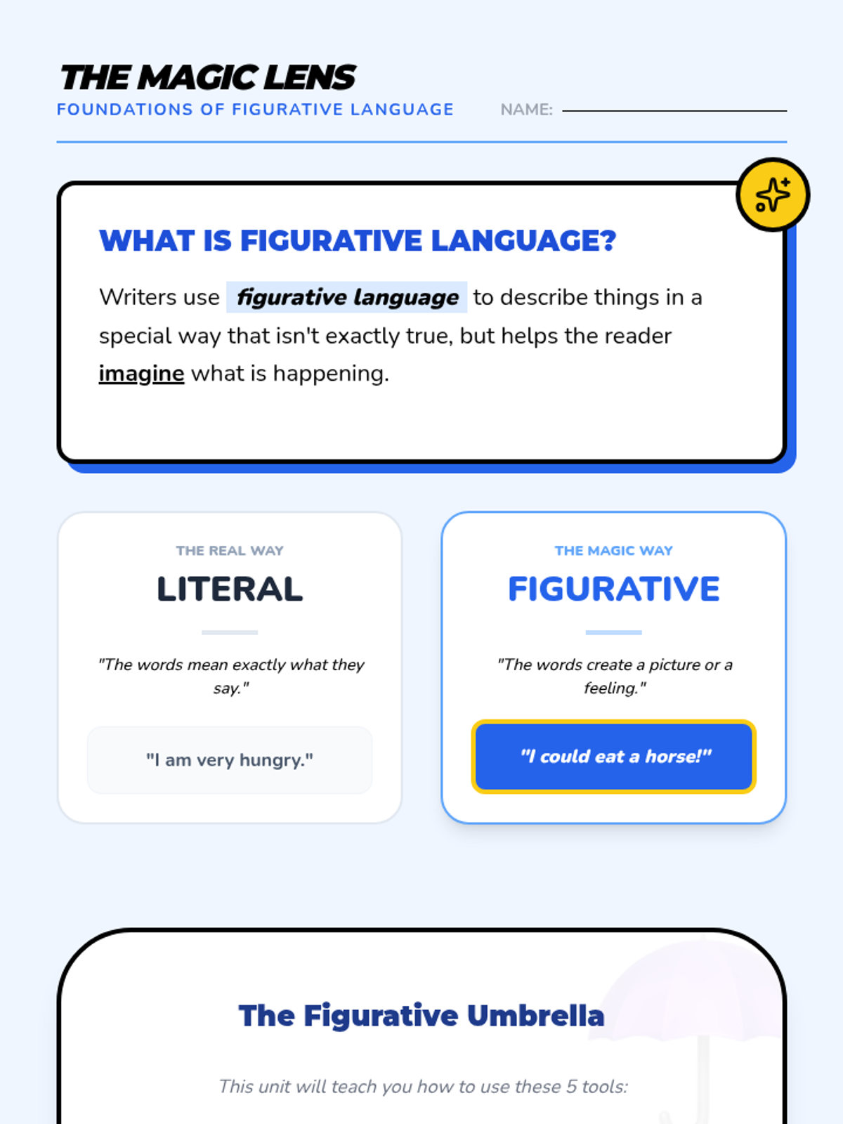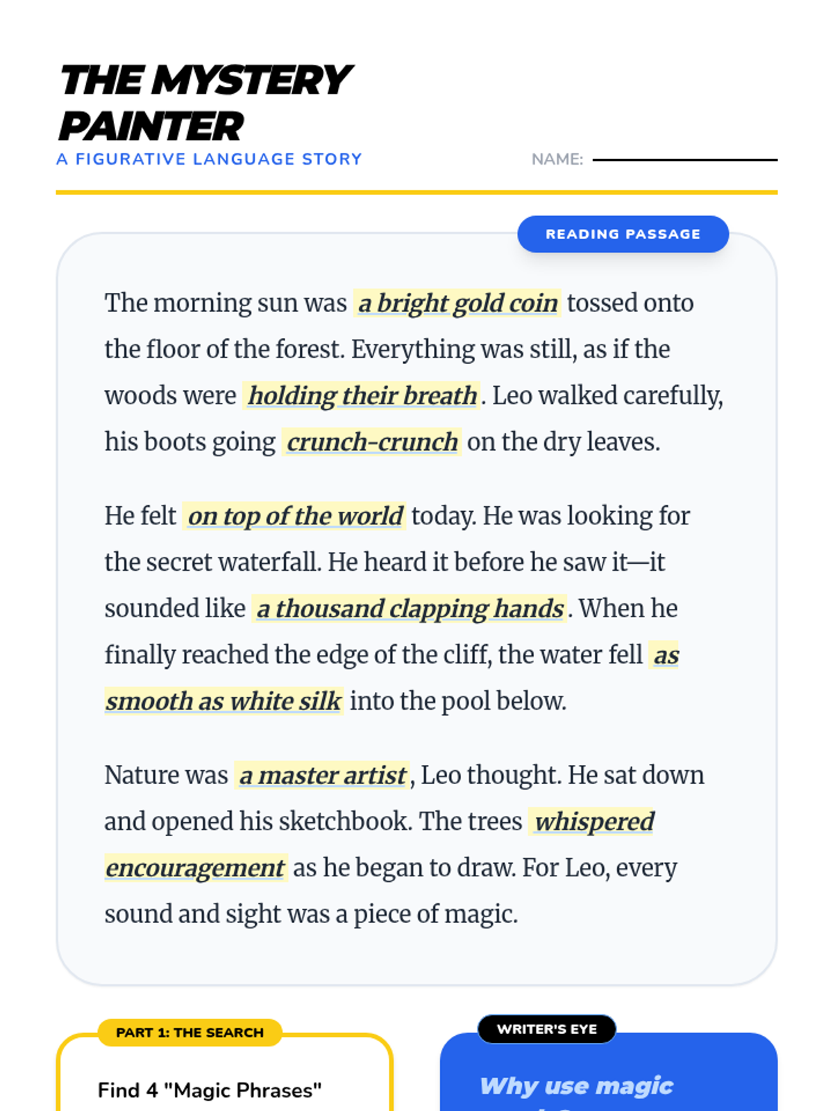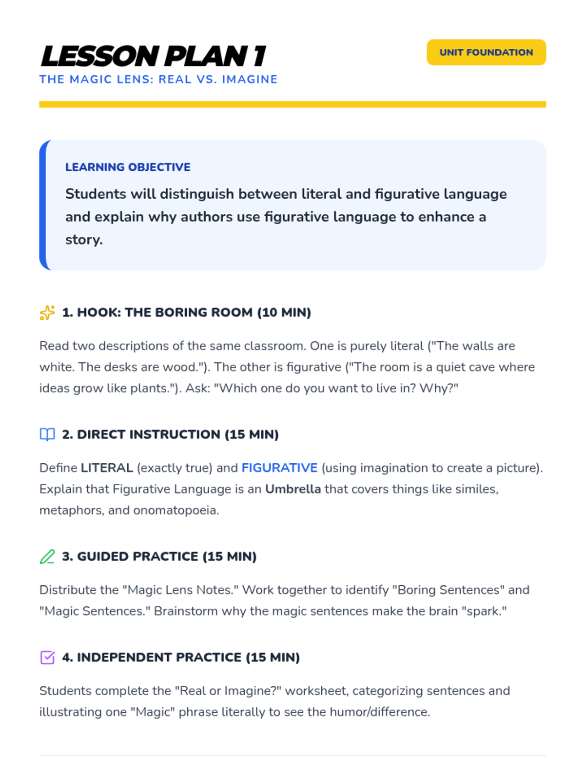 A whimsical journey into the world of poetry where students use their imagination to transform everyday objects and sounds into magical verses. This sequence focuses on metaphors, similes, and sensory language through playful, game-based learning.