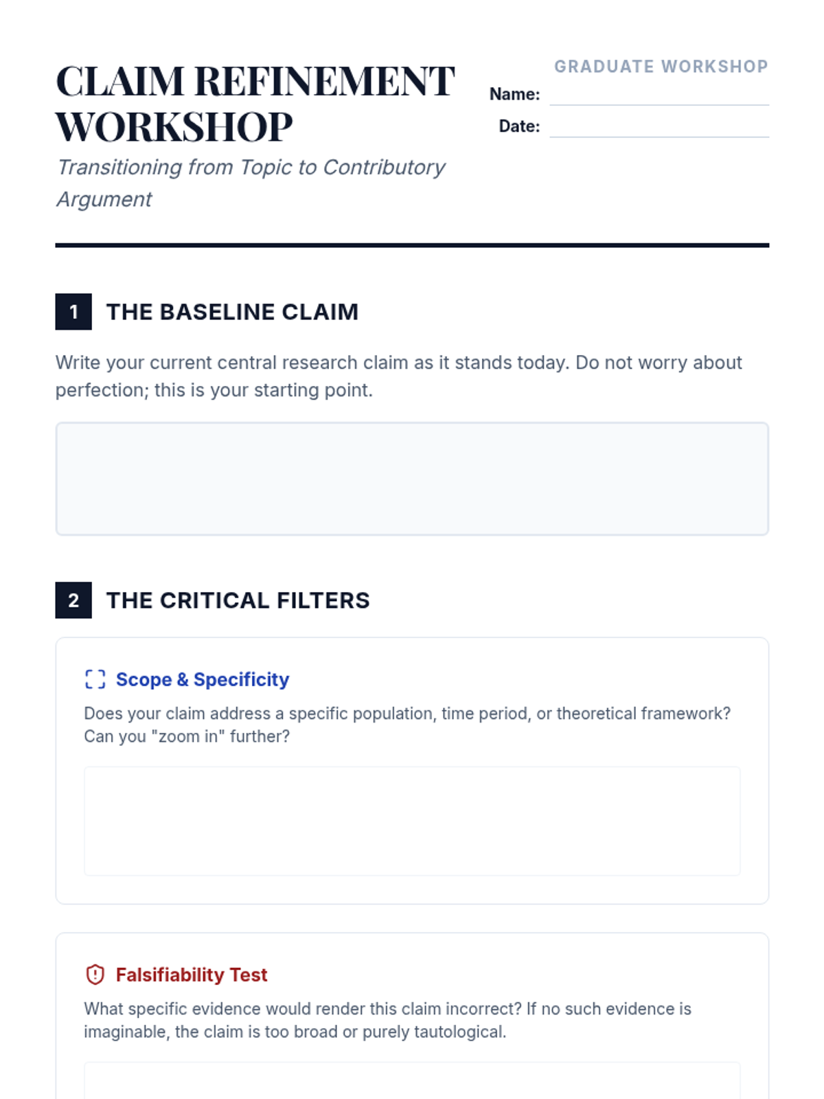 A comprehensive graduate-level workshop series focused on transitioning from research topics to defensible academic contributions. Students will master thesis refinement, literature synthesis, counter-argument strengthening (steelmanning), and the oral defense of evidentiary choices.