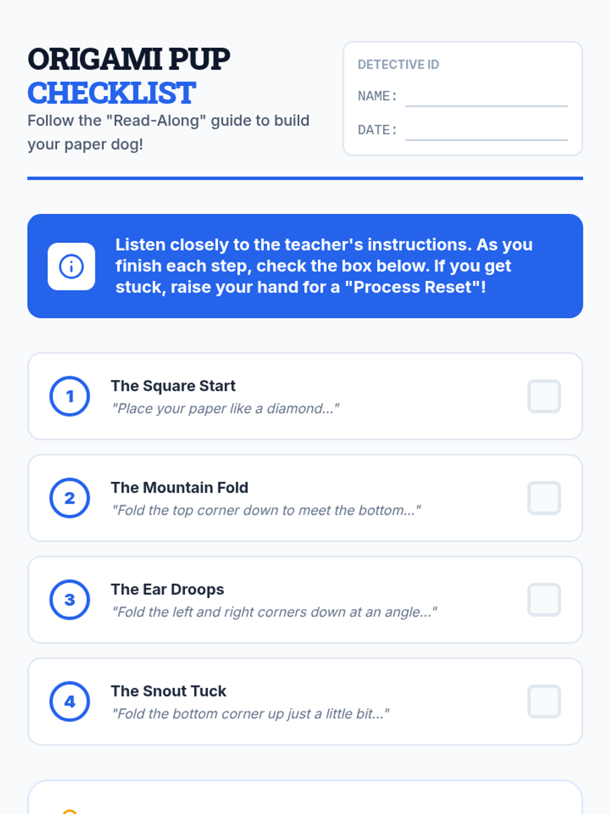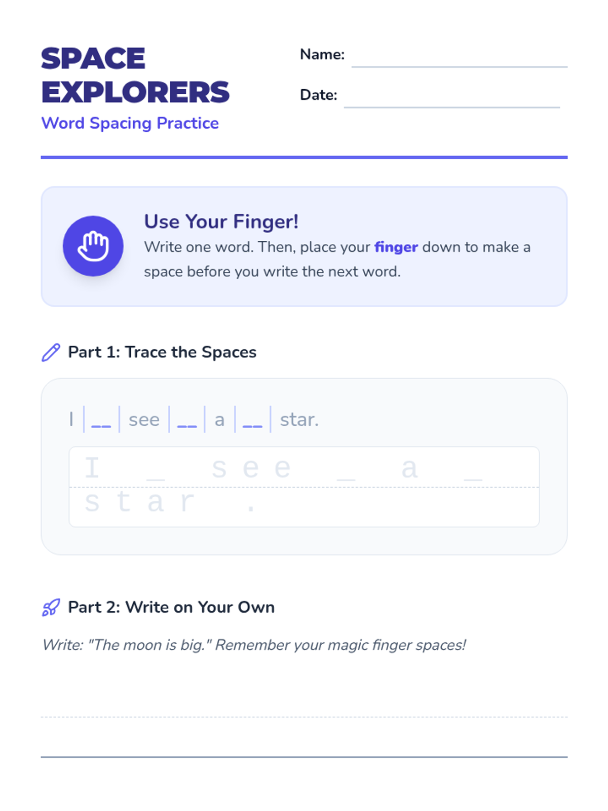This sequence teaches Kindergarten students the essential formatting rules of written English, including word spacing, left-to-right directionality, the return sweep, and list formatting. Students will progress from using physical spacing tools to producing legible, well-formatted multi-line documents.