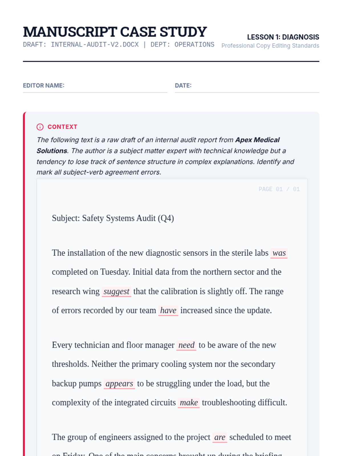 This sequence situates subject-verb agreement within the professional responsibilities of copy editors and technical writers, moving from manual correction to critical evaluation of automated tools.