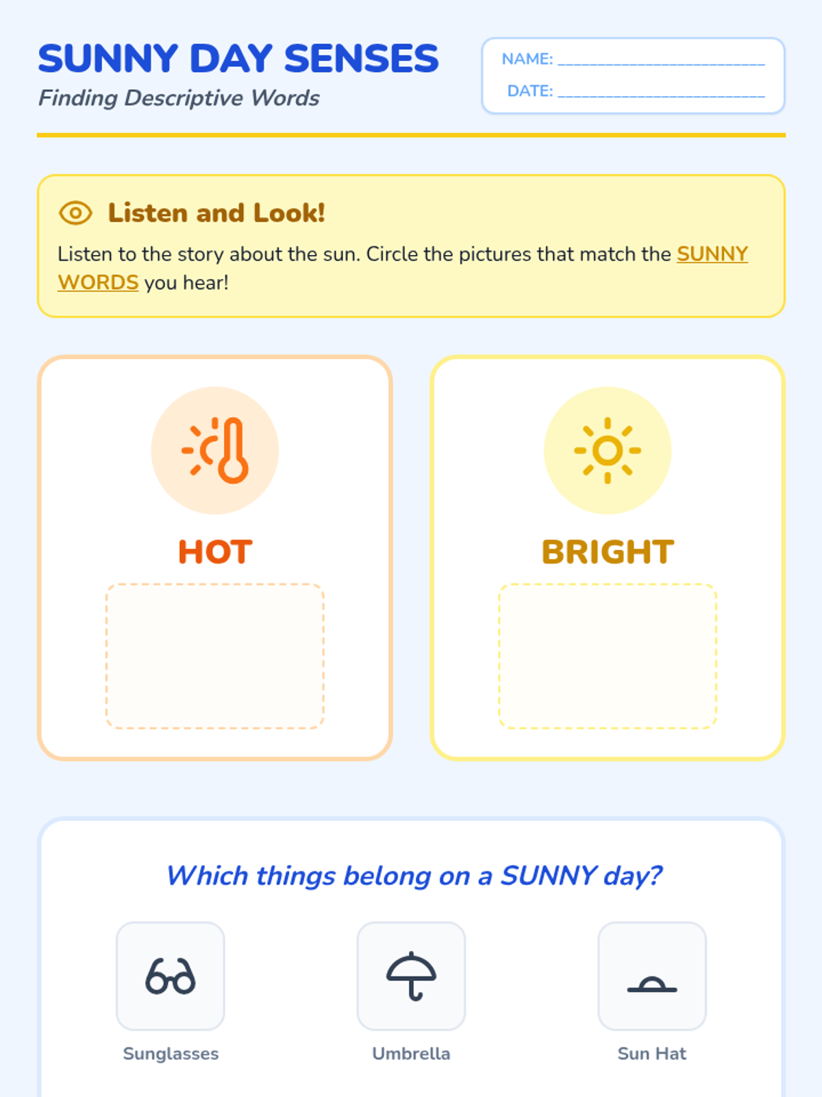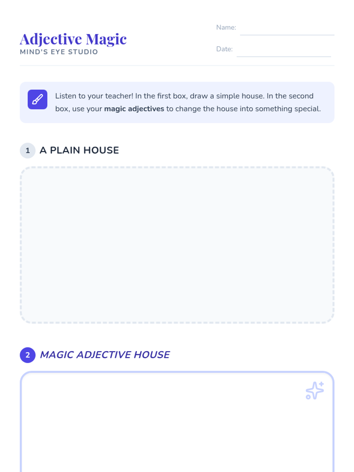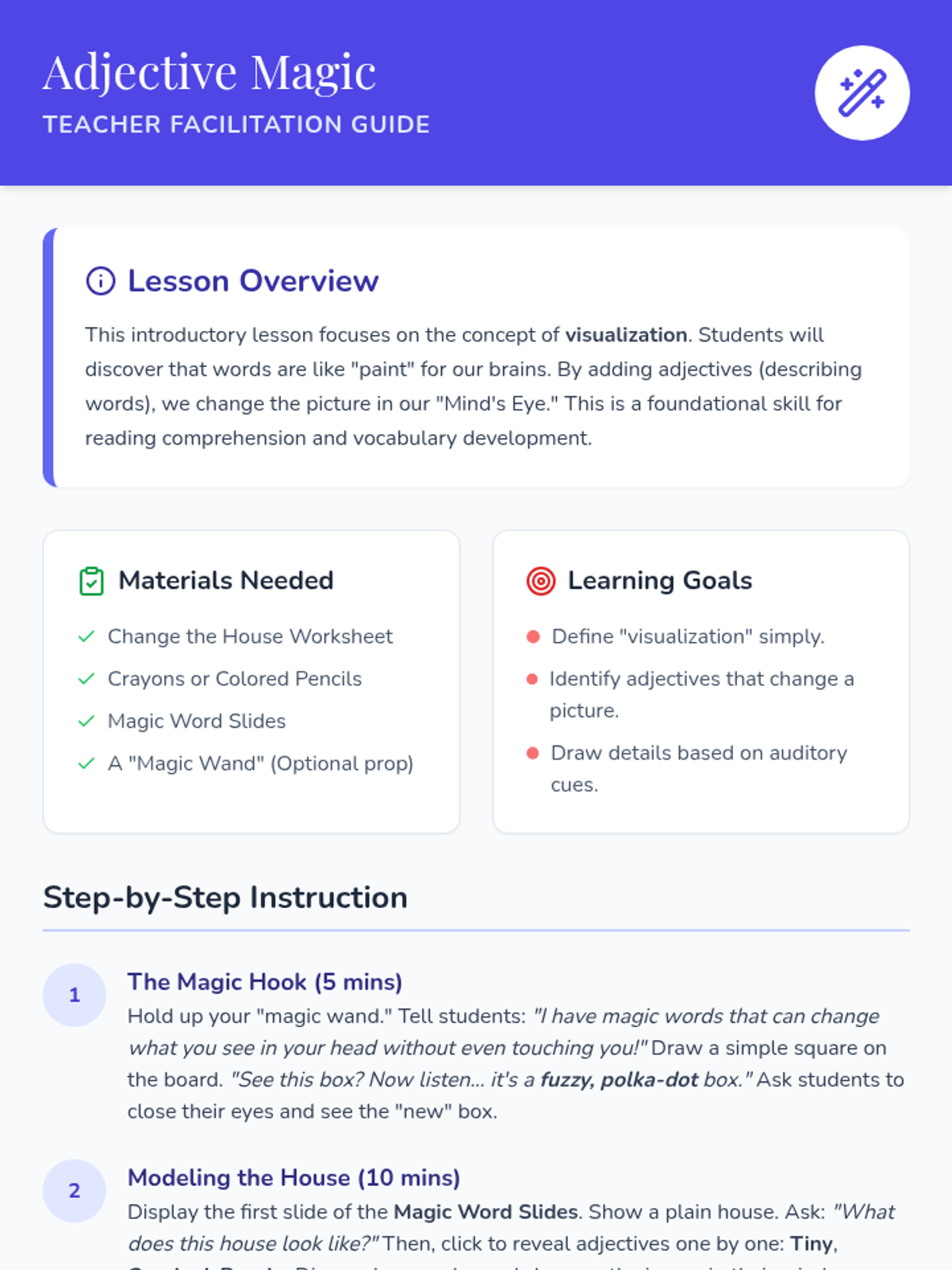 A Kindergarten sequence focused on building visualization skills through descriptive vocabulary. Students learn how adjectives like size, shape, and condition change the mental images they form while reading and listening.