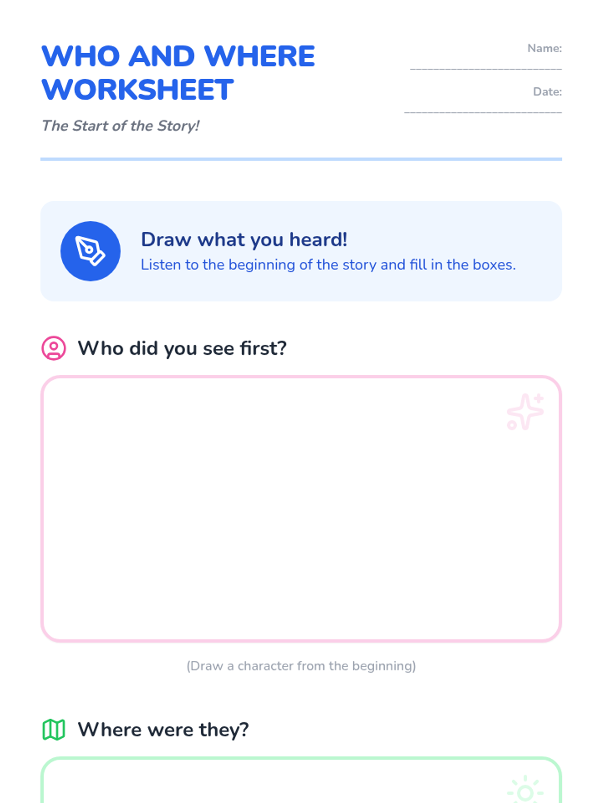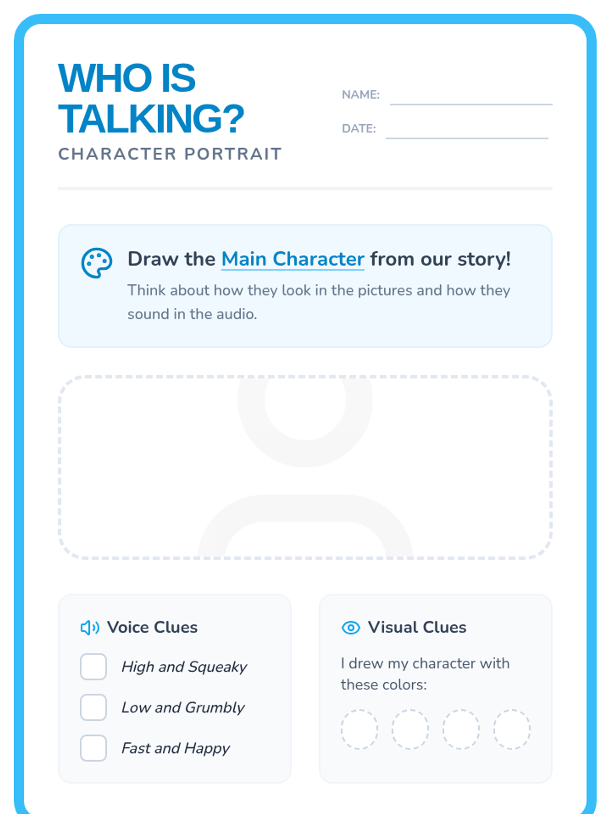 A Kindergarten ELA sequence focused on analyzing character and setting through audio-narrated stories, helping students build listening comprehension and visualization skills.