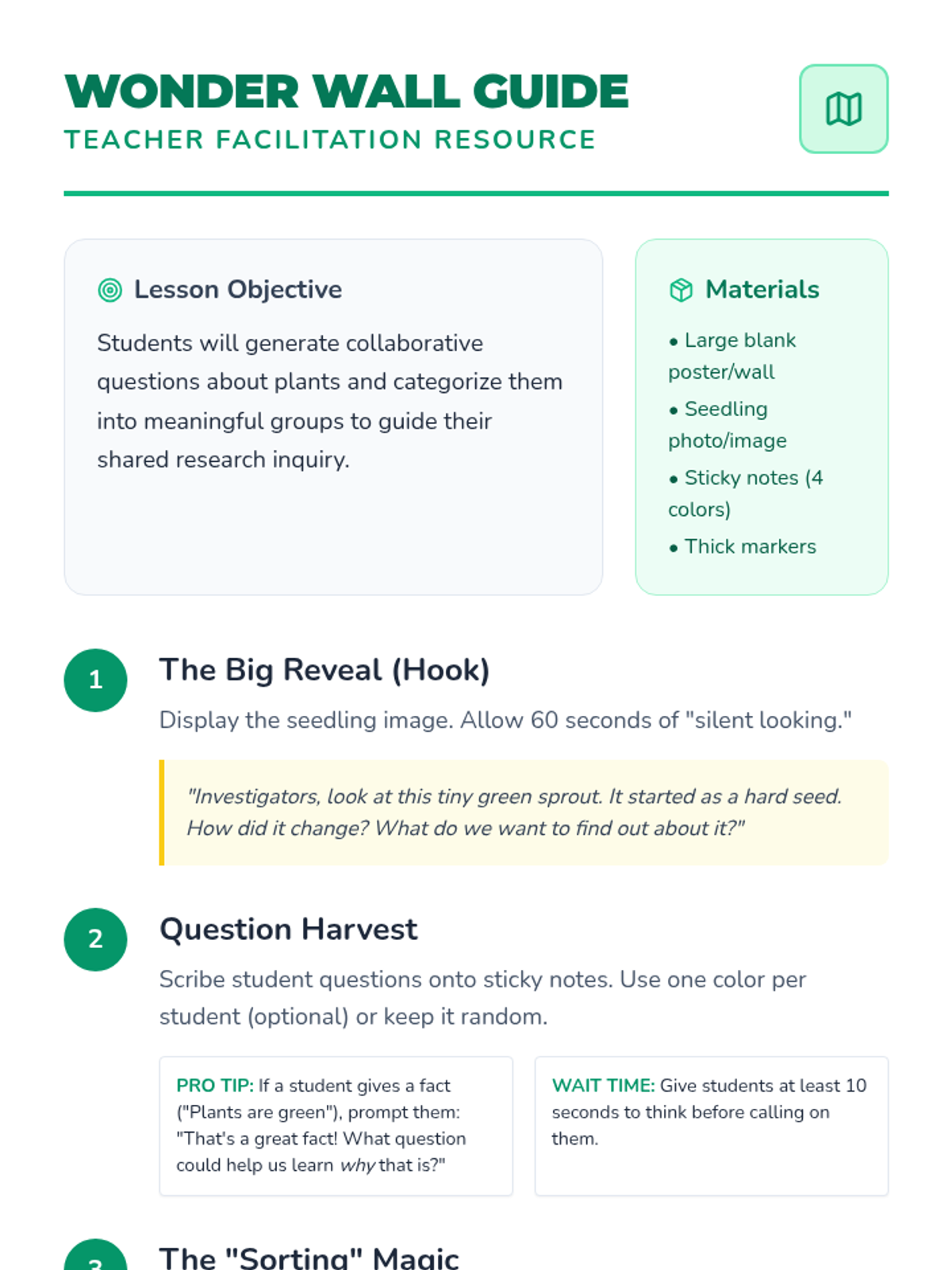 A Kindergarten ELA sequence on collaborative research skills, using a shared topic (Plants) to teach questioning, categorization, fact verification, and synthesis. Students learn to work together to answer big questions by gathering and combining information.