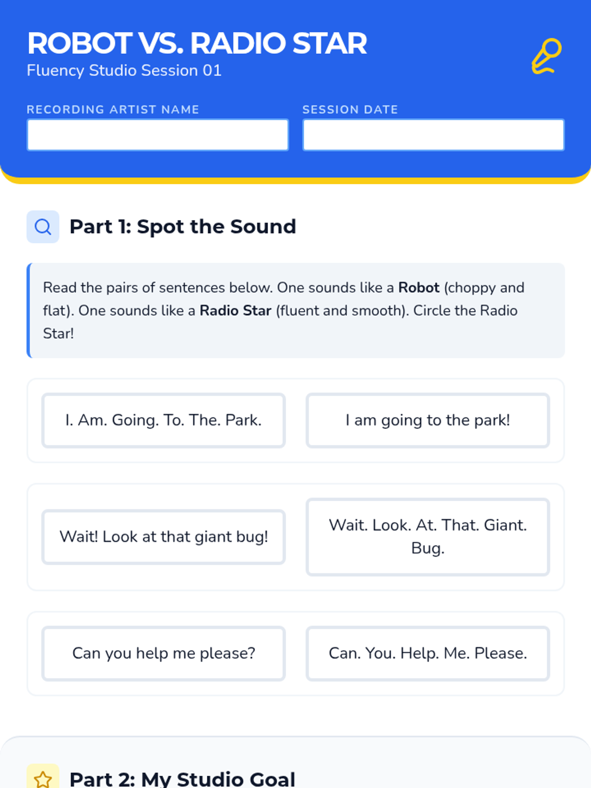 A 2nd Grade ELA sequence focused on developing oral reading fluency through audio models, mimicry, and self-assessment in a 'recording studio' themed environment.