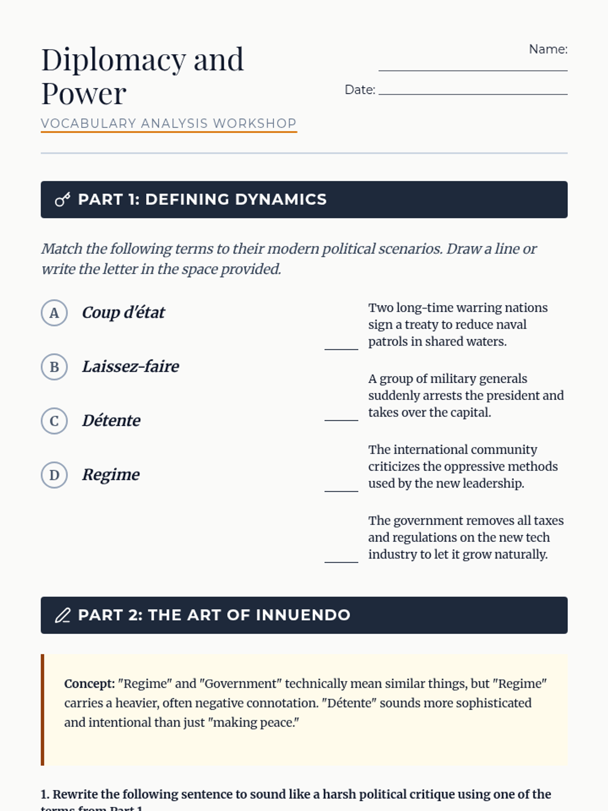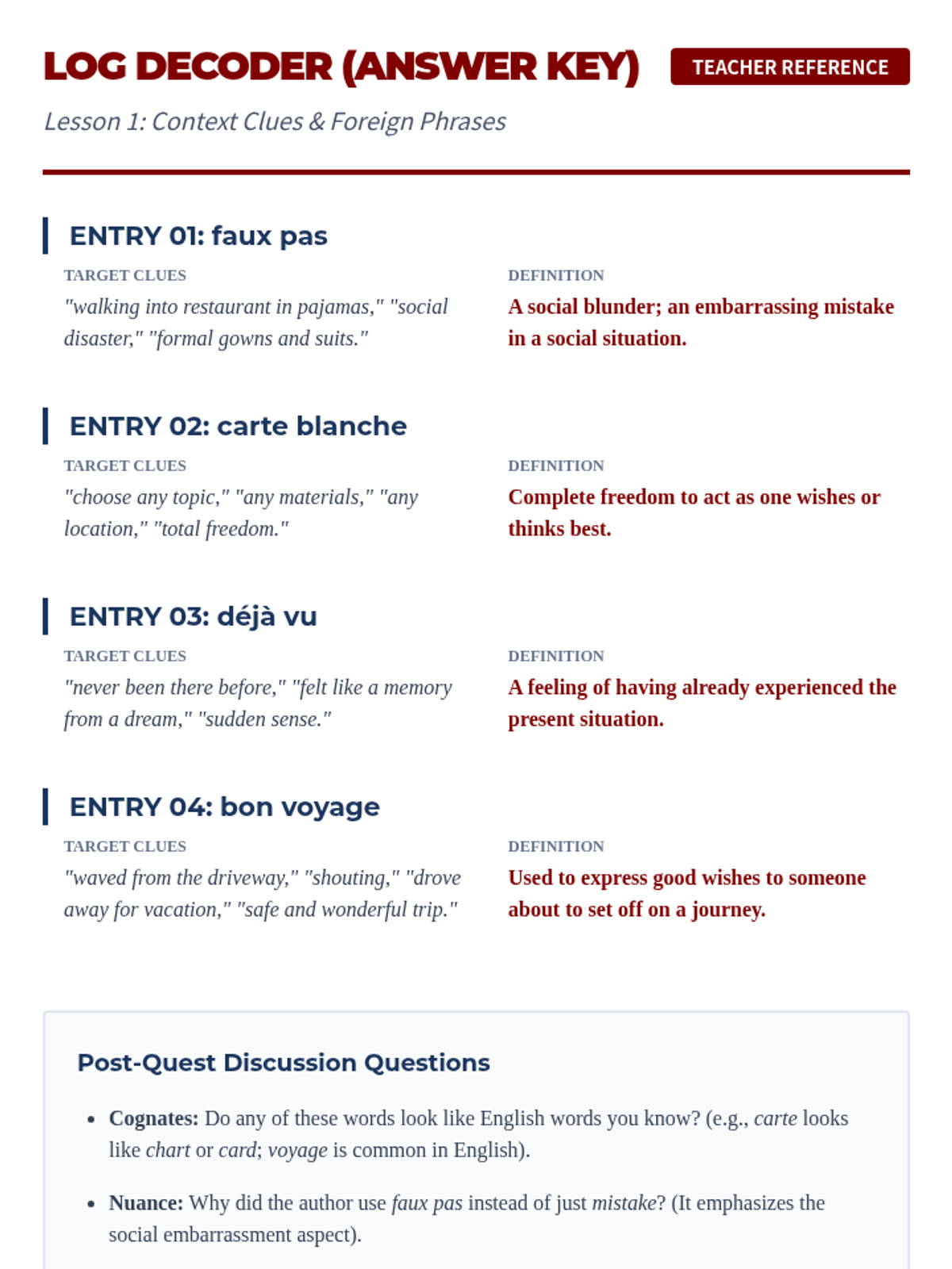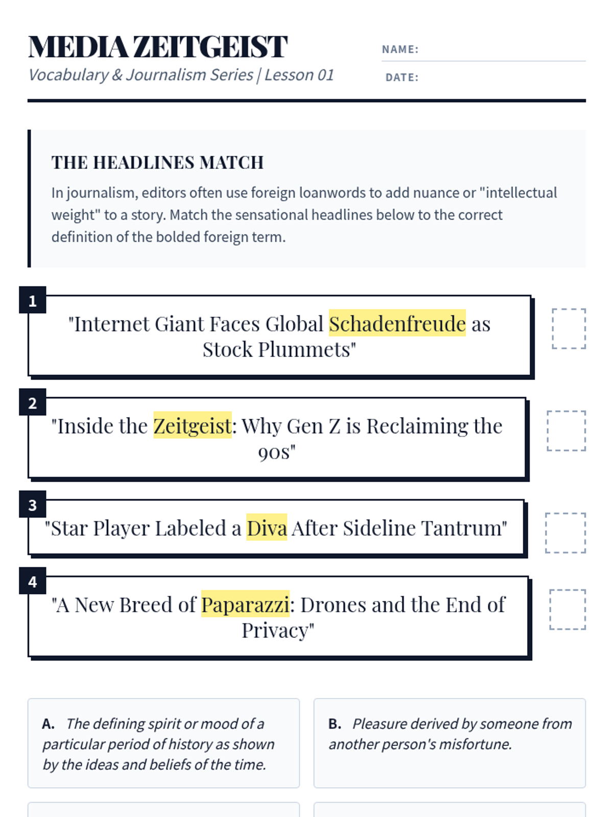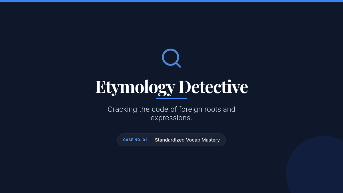 A high-energy, grade 11 vocabulary sequence focused on the mastery of foreign loanwords and expressions common in academic and standardized testing contexts. Students move from morphological analysis to active usage through gamified challenges and systematic practice.