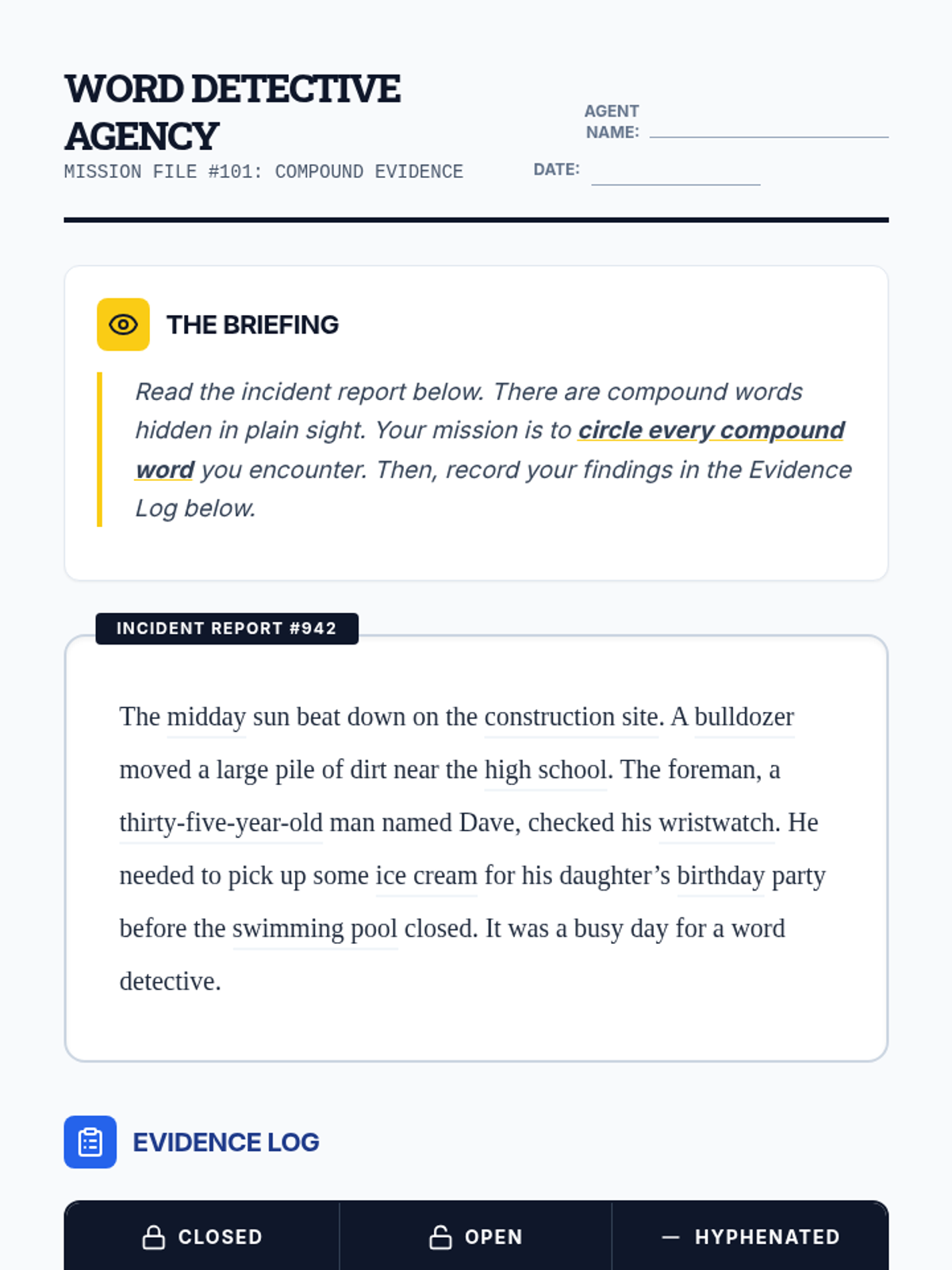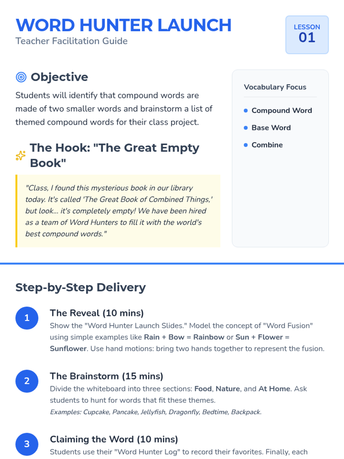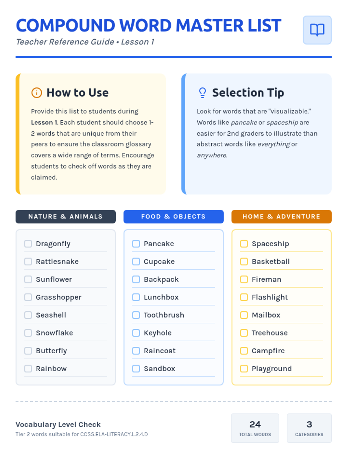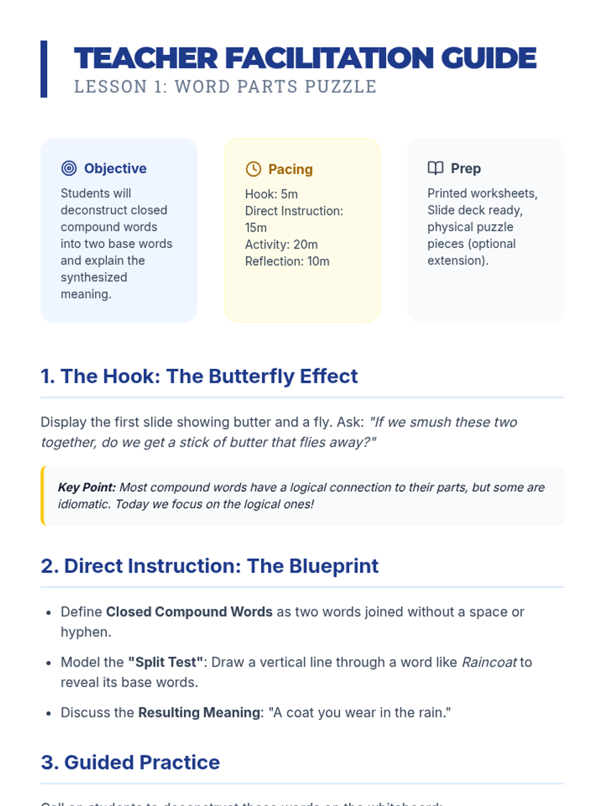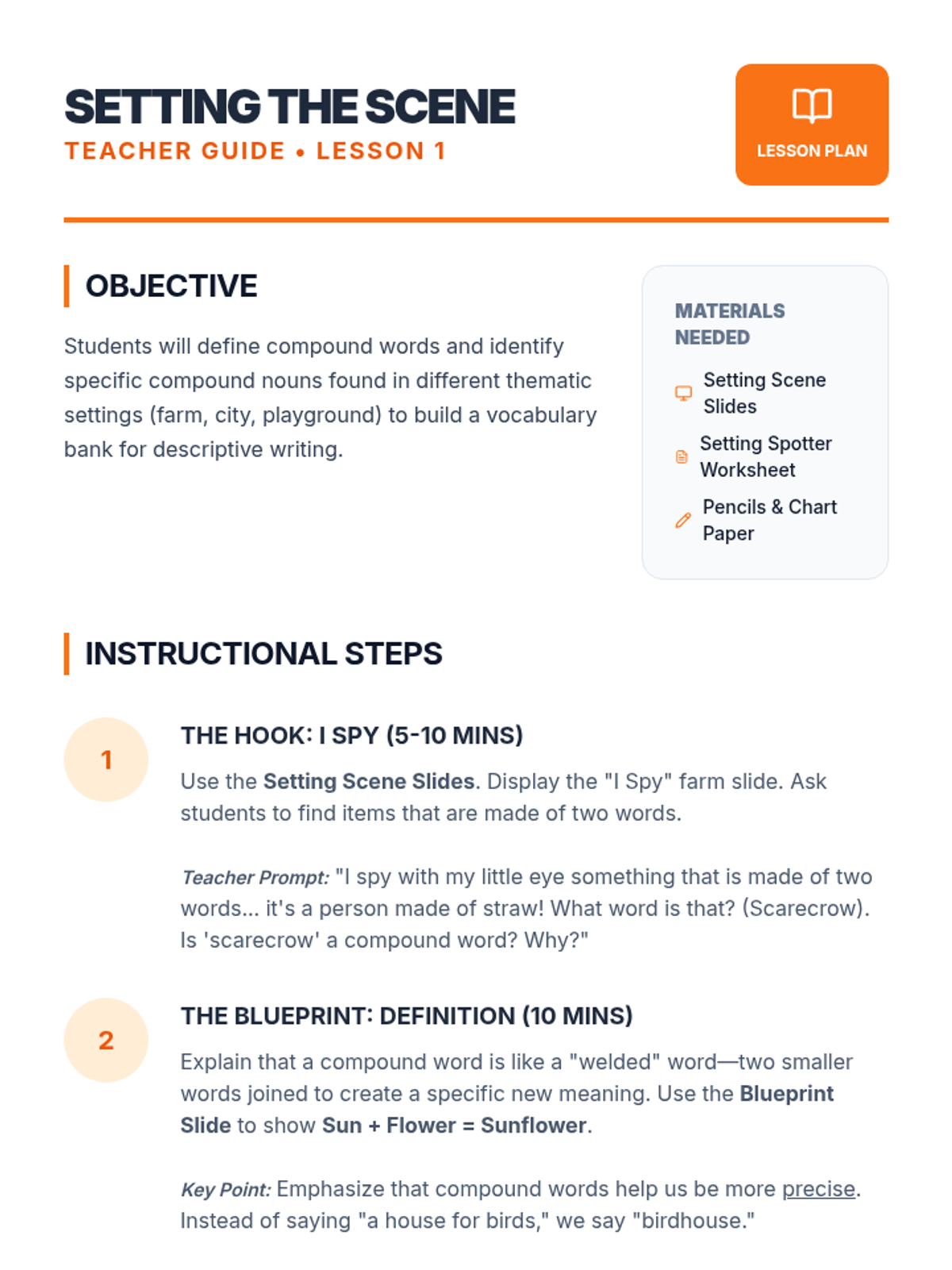 A comprehensive 3rd-grade sequence that bridges the gap between isolated vocabulary practice and reading fluency through the study of compound words. Students progress from identifying compound words in passages to using them as tools for sentence expansion and narrative writing.