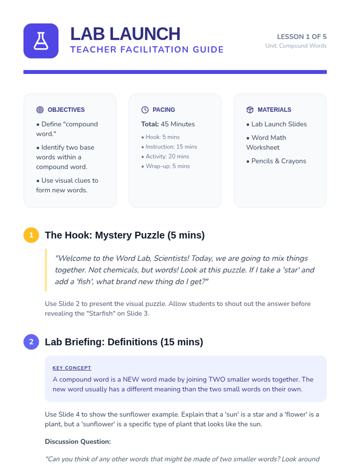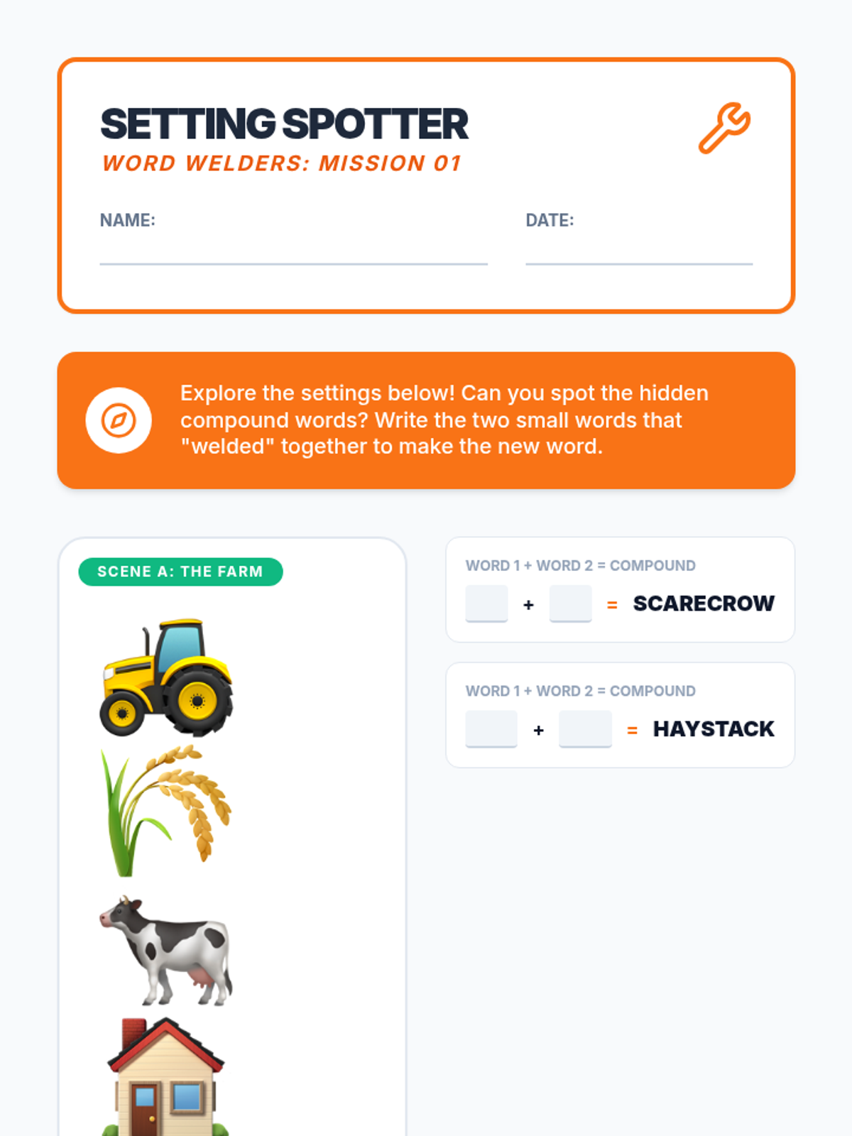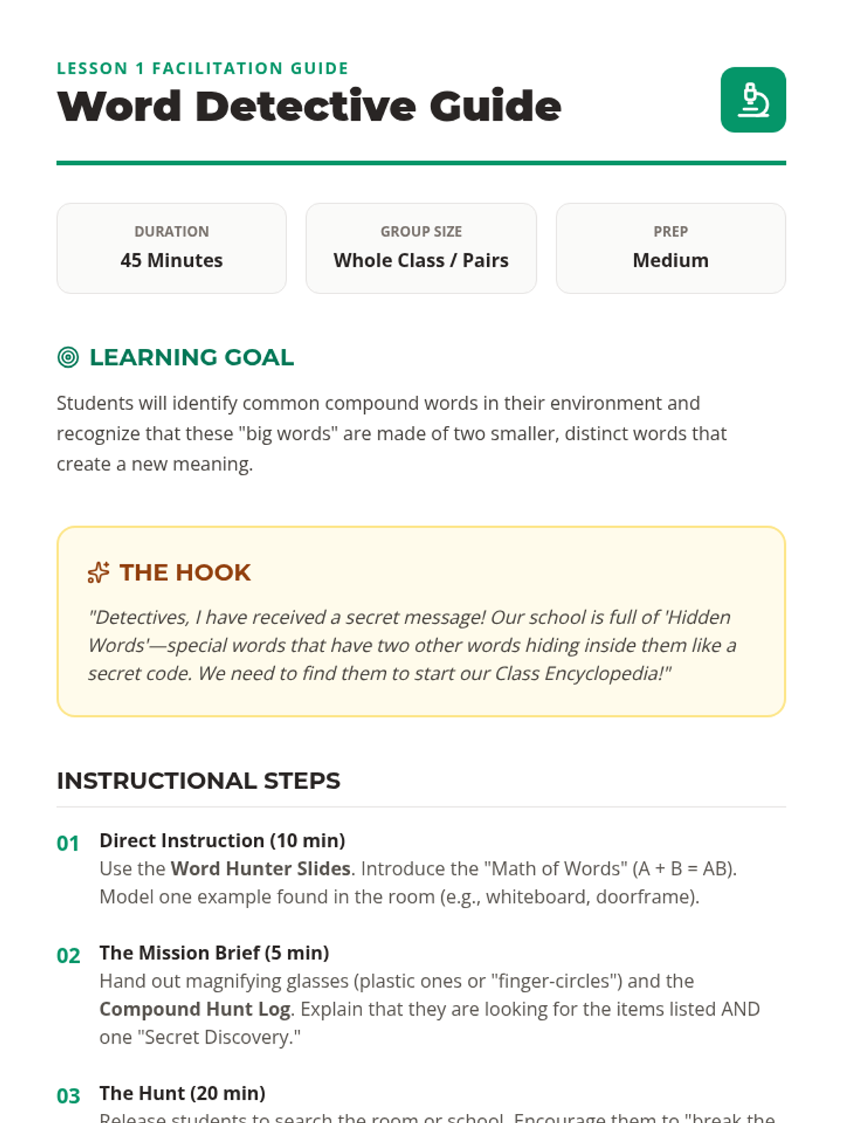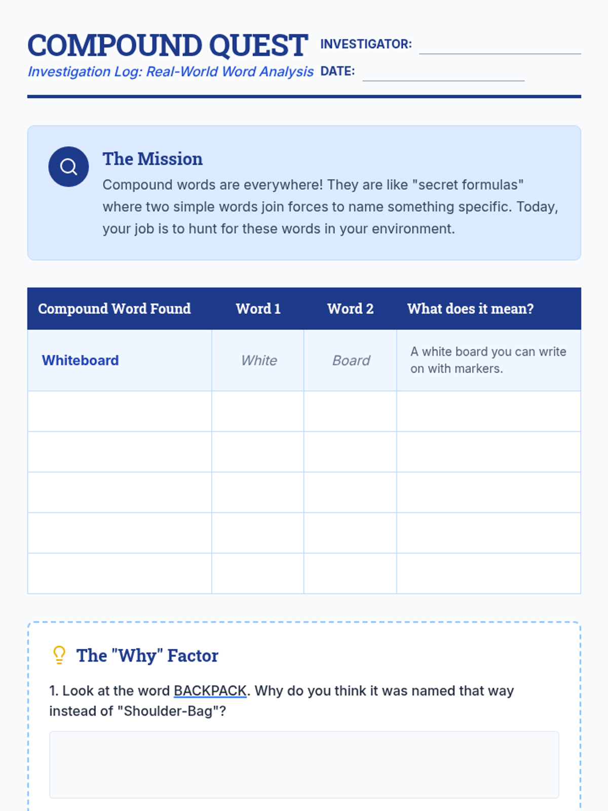 A comprehensive 3rd-grade sequence that bridges the gap between isolated vocabulary practice and reading fluency through the study of compound words. Students progress from identifying compound words in passages to using them as tools for sentence expansion and narrative writing.