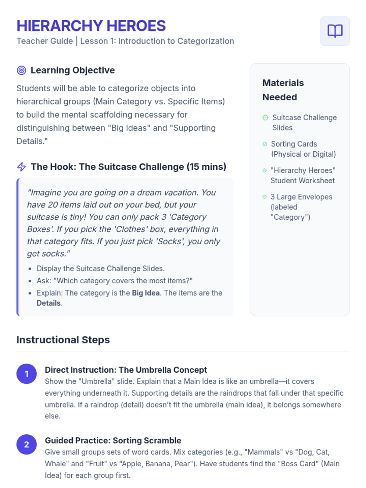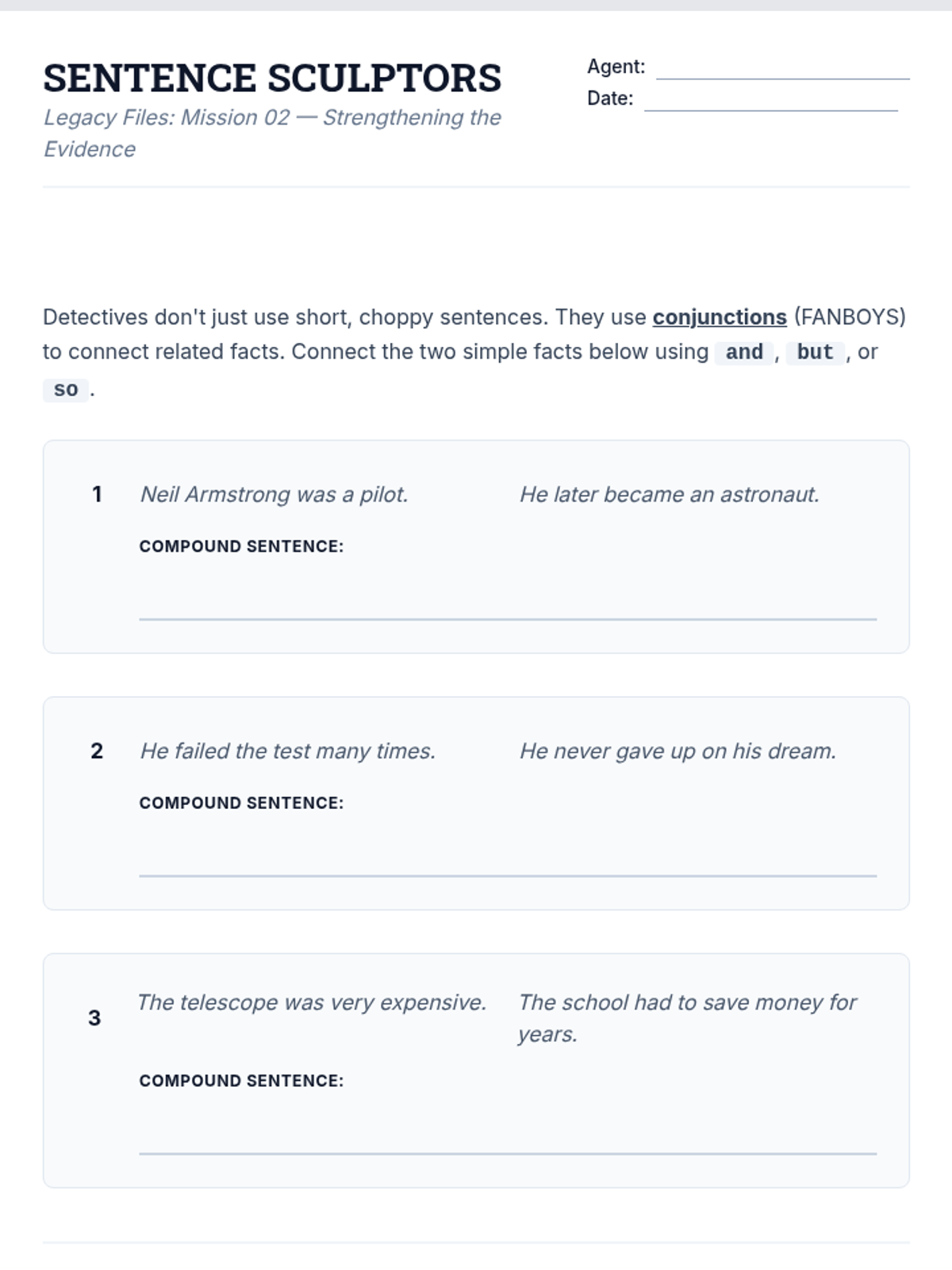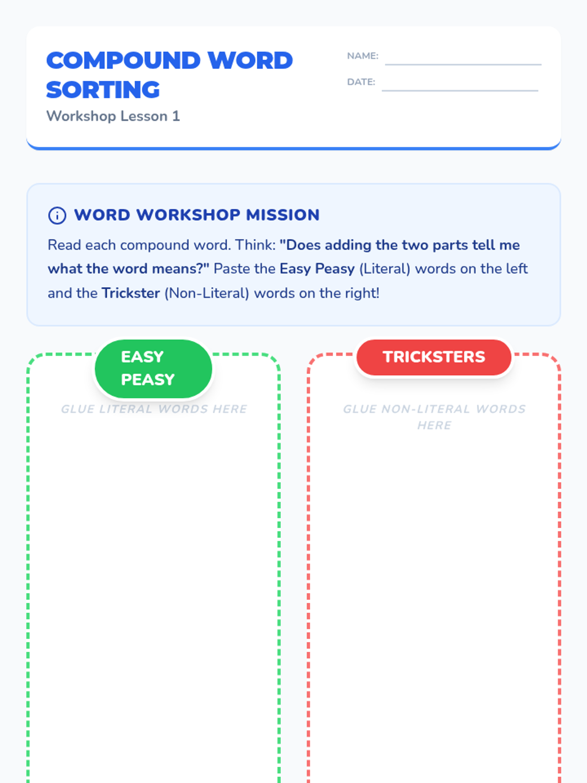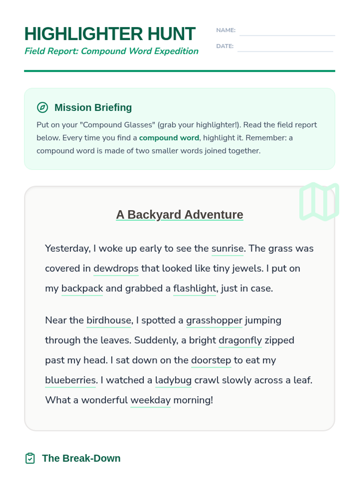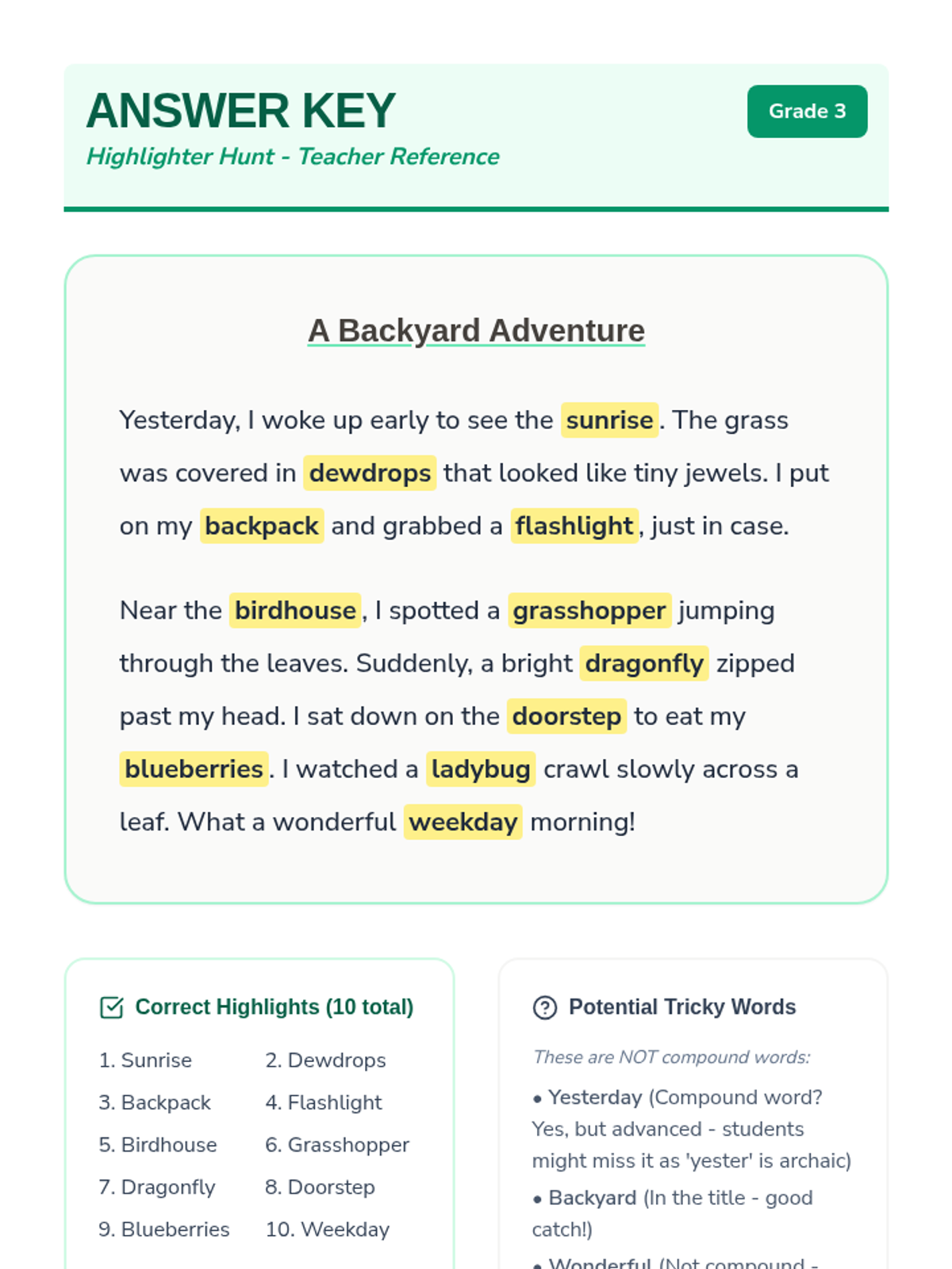 A comprehensive 3rd-grade sequence that bridges the gap between isolated vocabulary practice and reading fluency through the study of compound words. Students progress from identifying compound words in passages to using them as tools for sentence expansion and narrative writing.