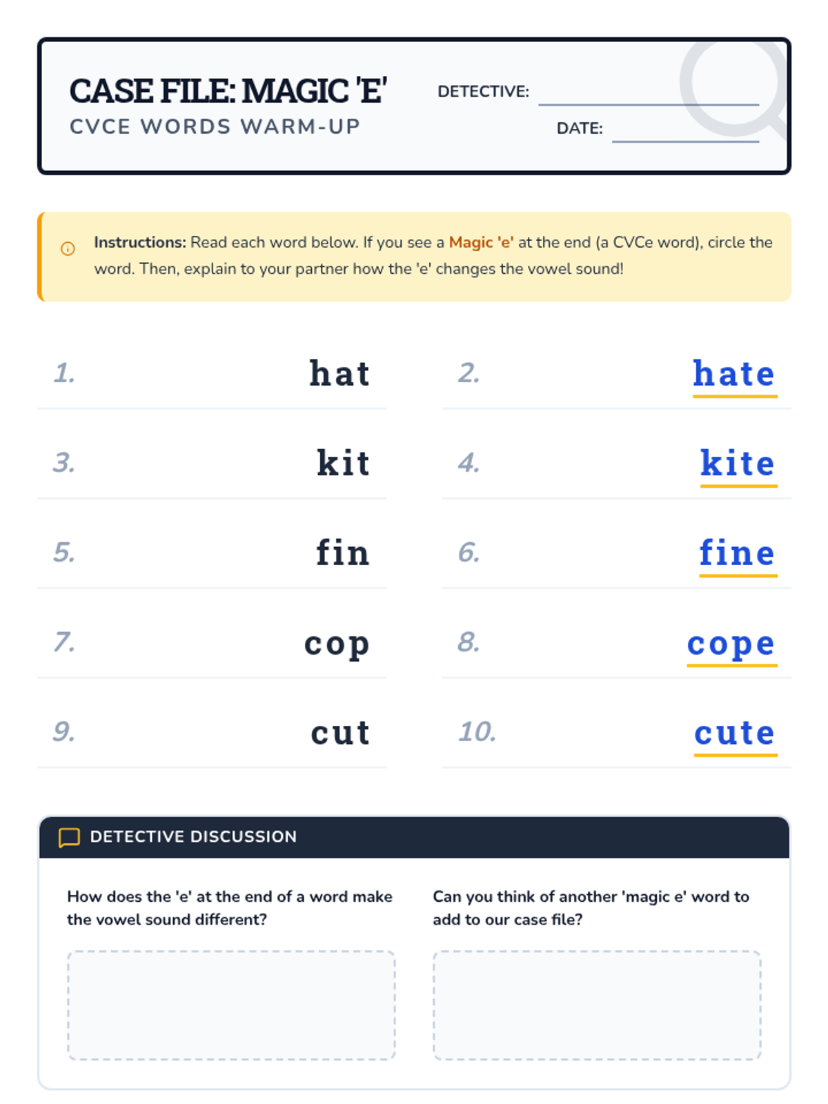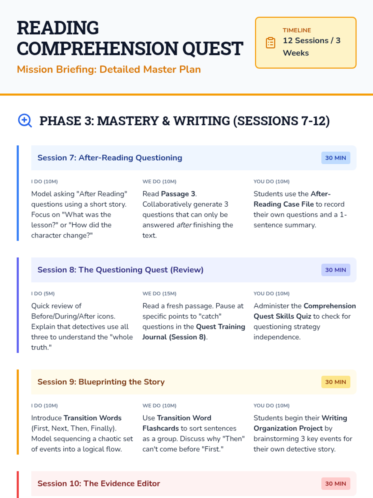 A 3-week, 12-session reading and writing curriculum designed for Tier 2 small groups, focusing on CVCe words, sequencing, questioning, and writing organization with a detective-themed 'Quest' aesthetic.