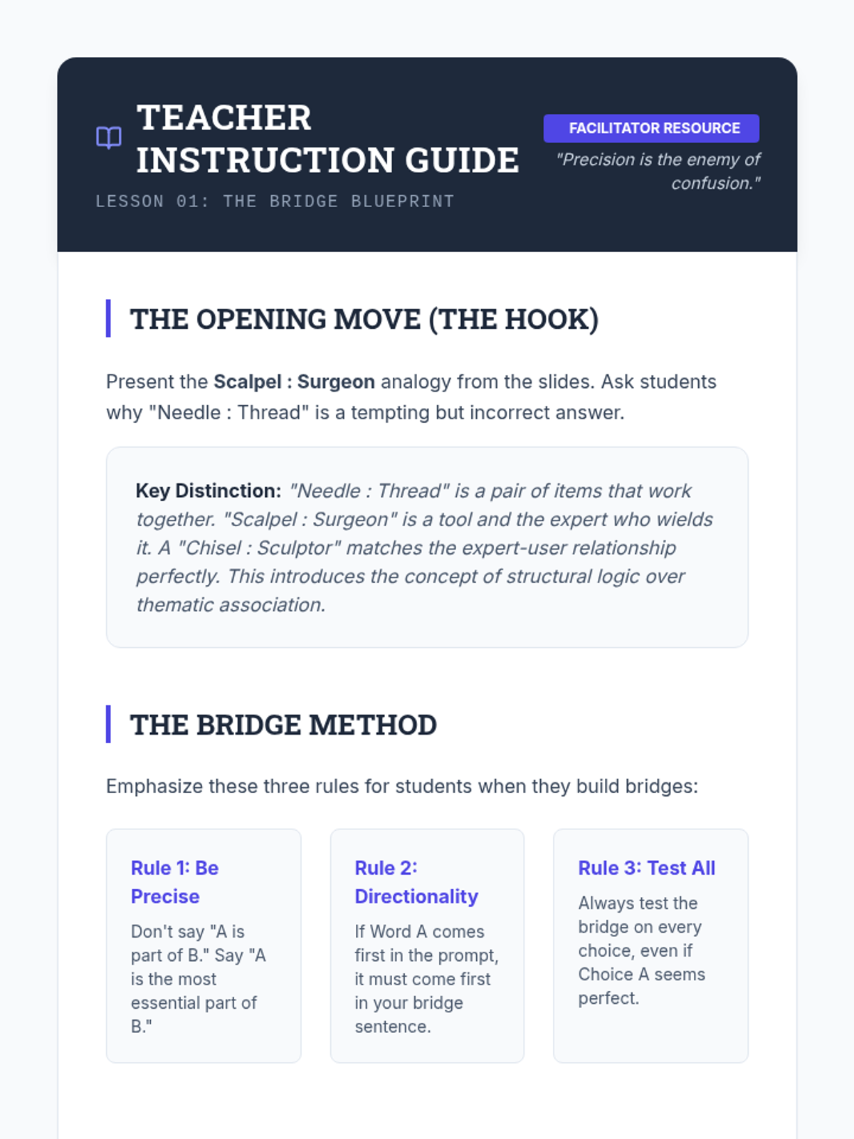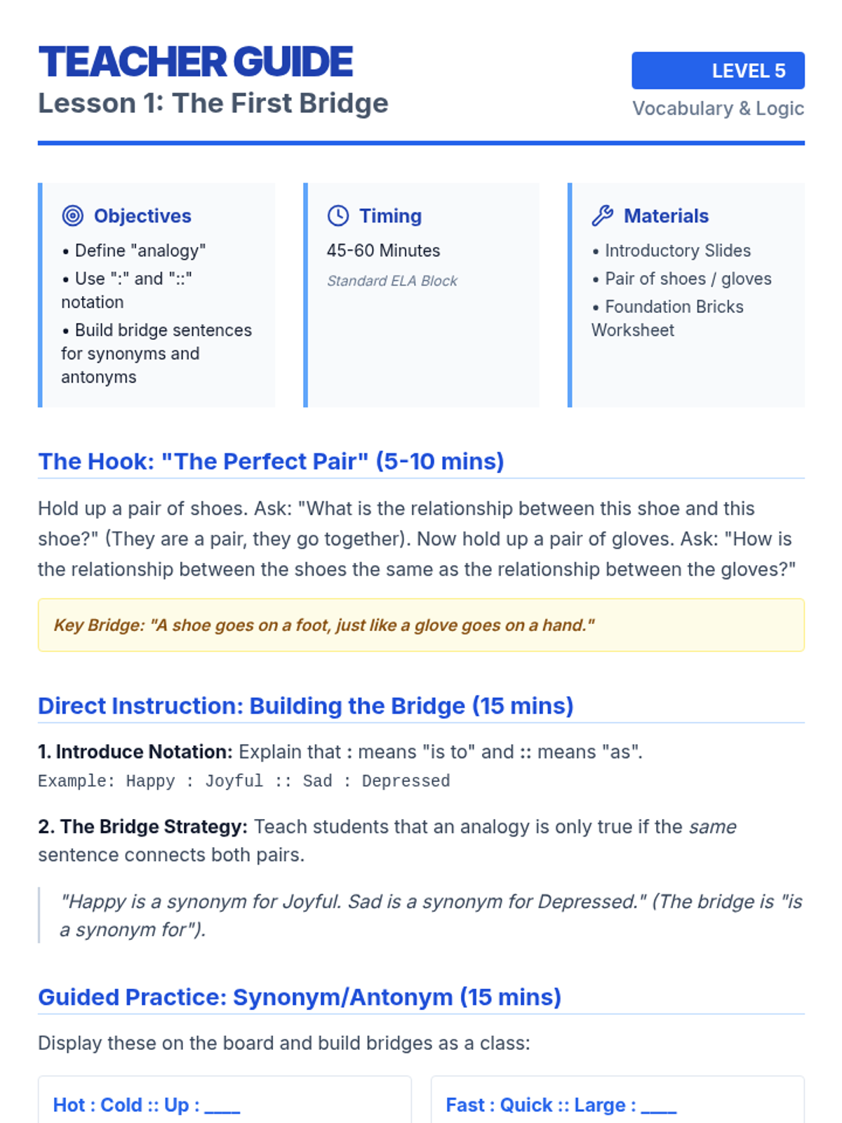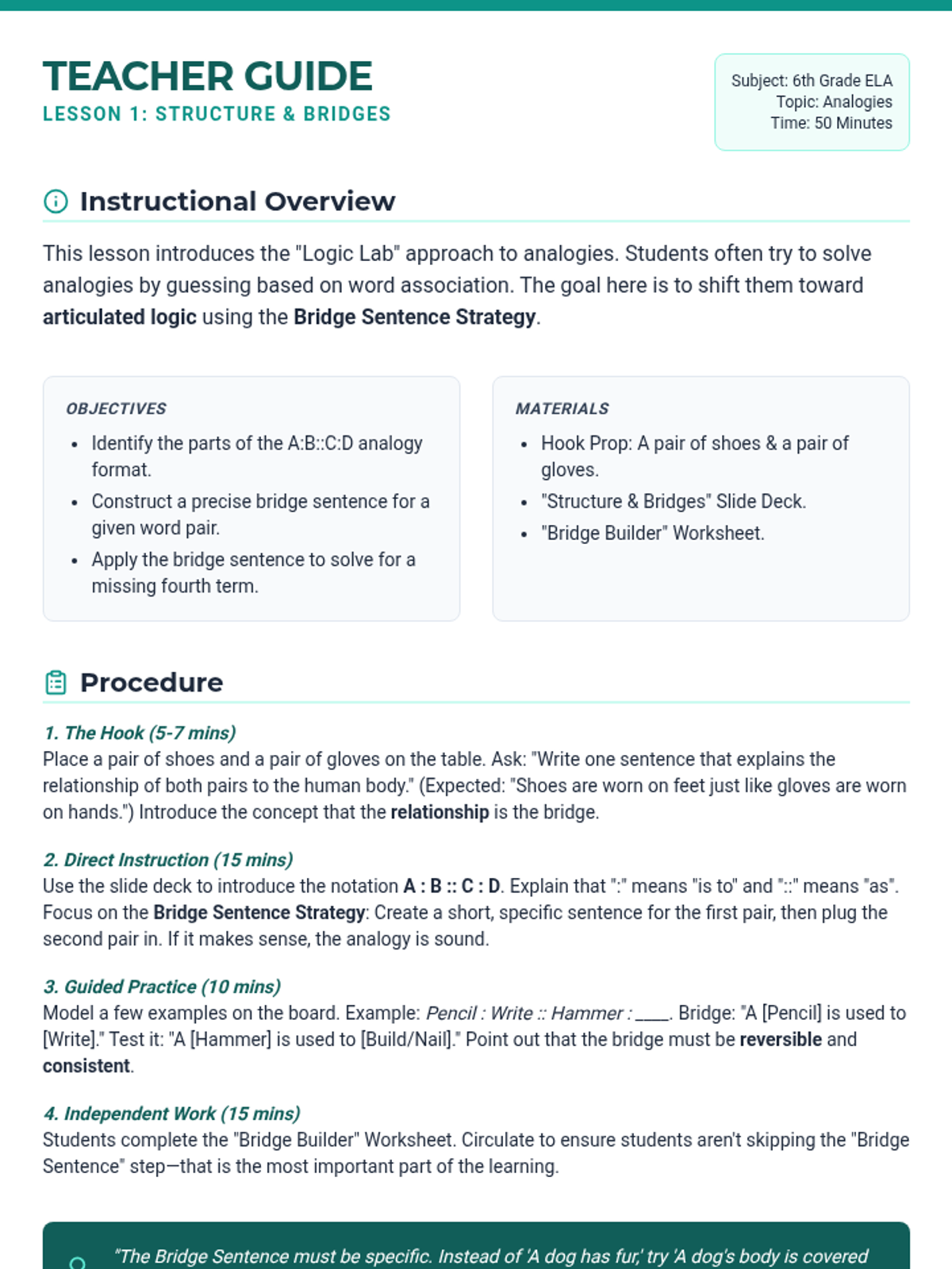 This sequence introduces 6th-grade students to the structure of analogies, focusing on identifying specific relationship types using the 'bridge sentence' strategy. Students progress from simple synonym/antonym pairs to complex structural and functional relationships.