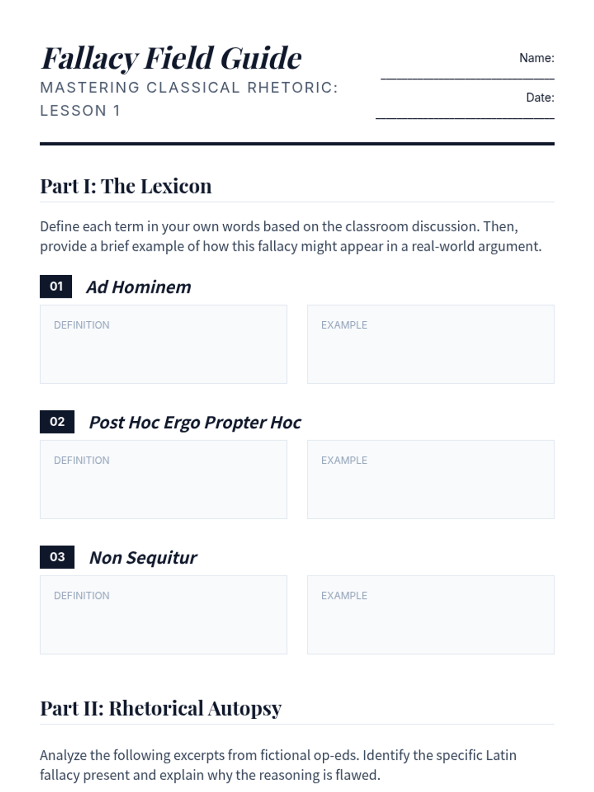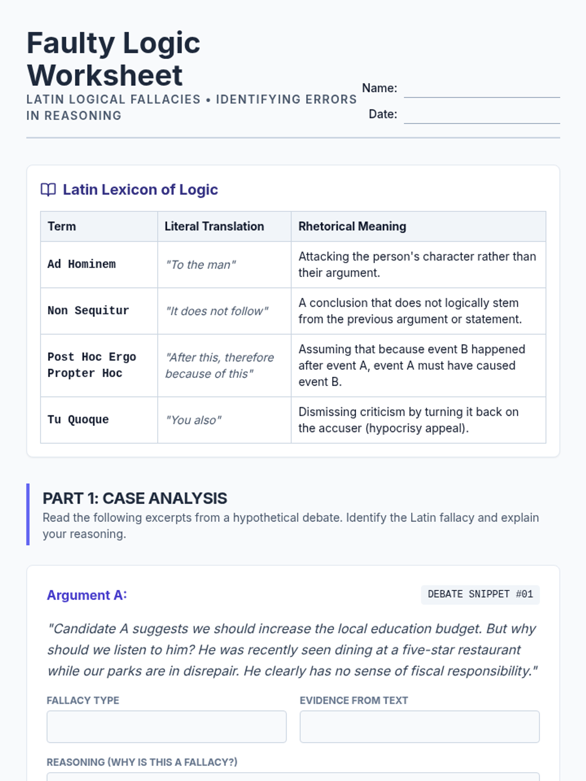 This sequence immerses students in the scholarly and rhetorical traditions that shape formal academic discourse, focusing on Latin and Greek expressions prevalent in university-level writing and debate. Students will analyze how terms like 'ad hominem,' 'non sequitur,' and 'status quo' function as shorthand for complex logical concepts, culminating in a Socratic seminar.