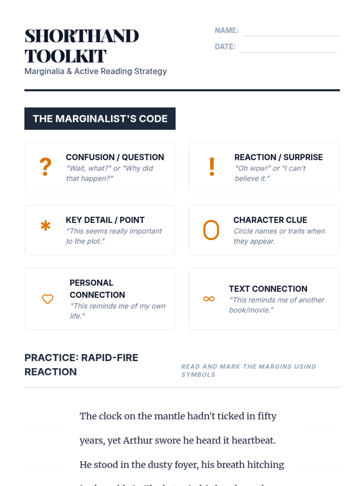 A 10th-grade academic support sequence that transforms students from passive readers to active analysts through the art of marginalia. Students master shorthand symbols, inquiry-based questioning, theme tracking, and summarization to prepare for a text-based Socratic seminar.