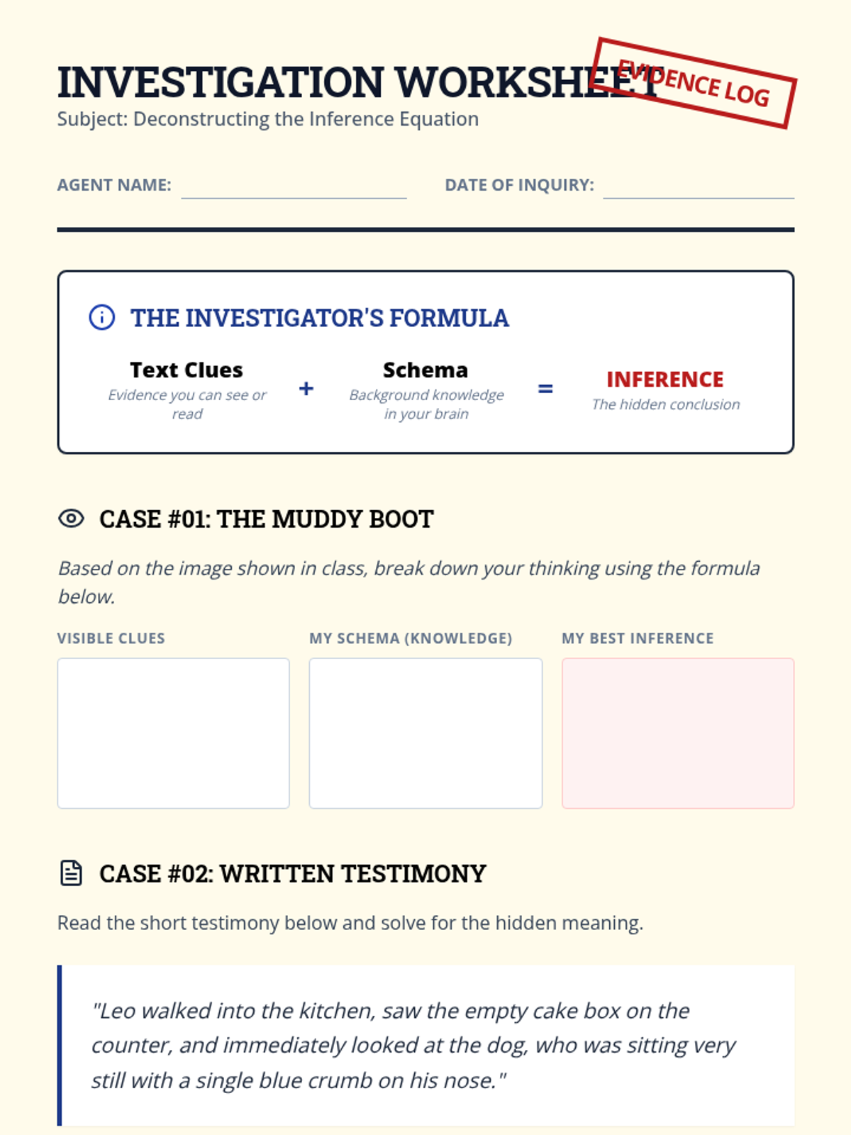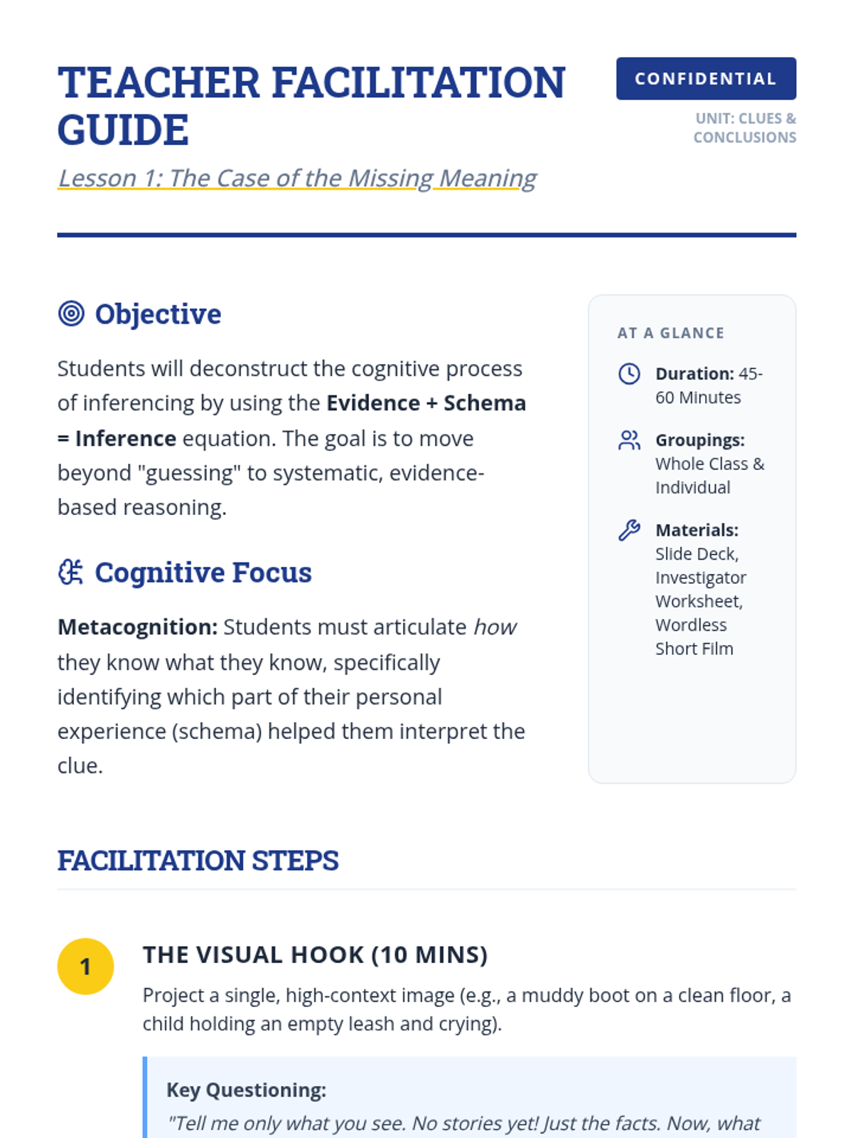 A structured ELA workshop sequence for 11th-grade academic support, focusing on the cognitive process of making inferences and predictions. Students move from visual analysis to complex text synthesis using the 'Evidence + Schema = Inference' equation.