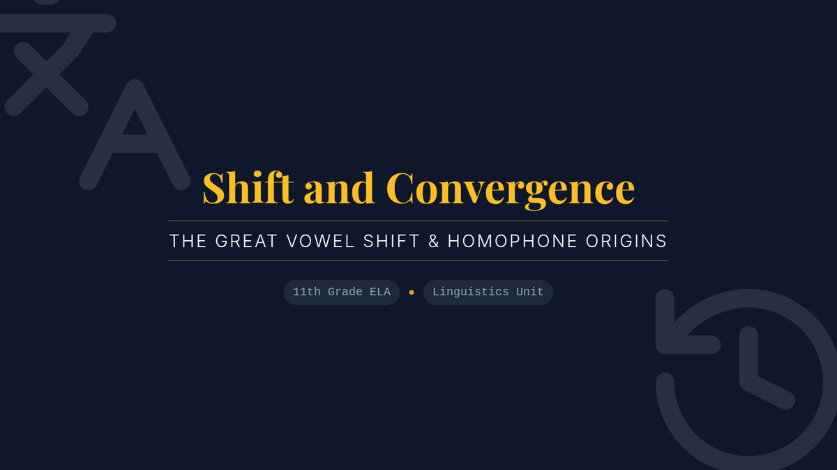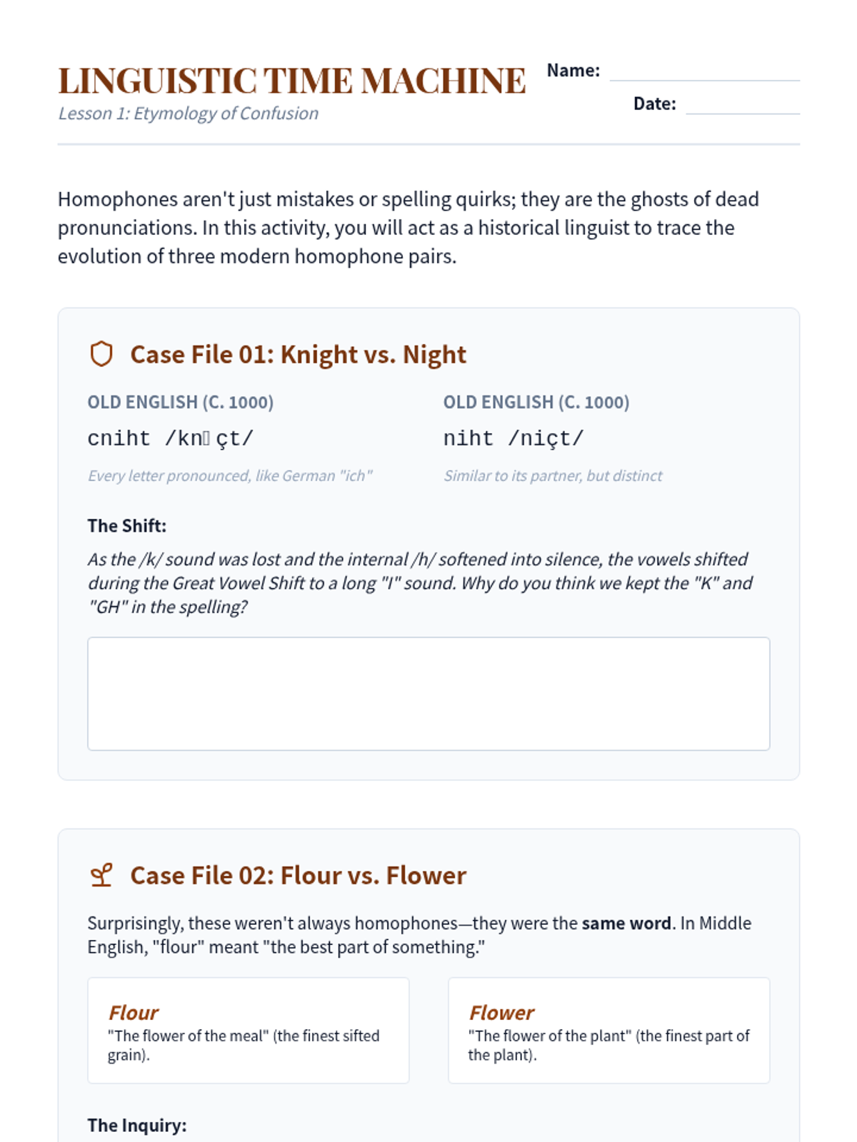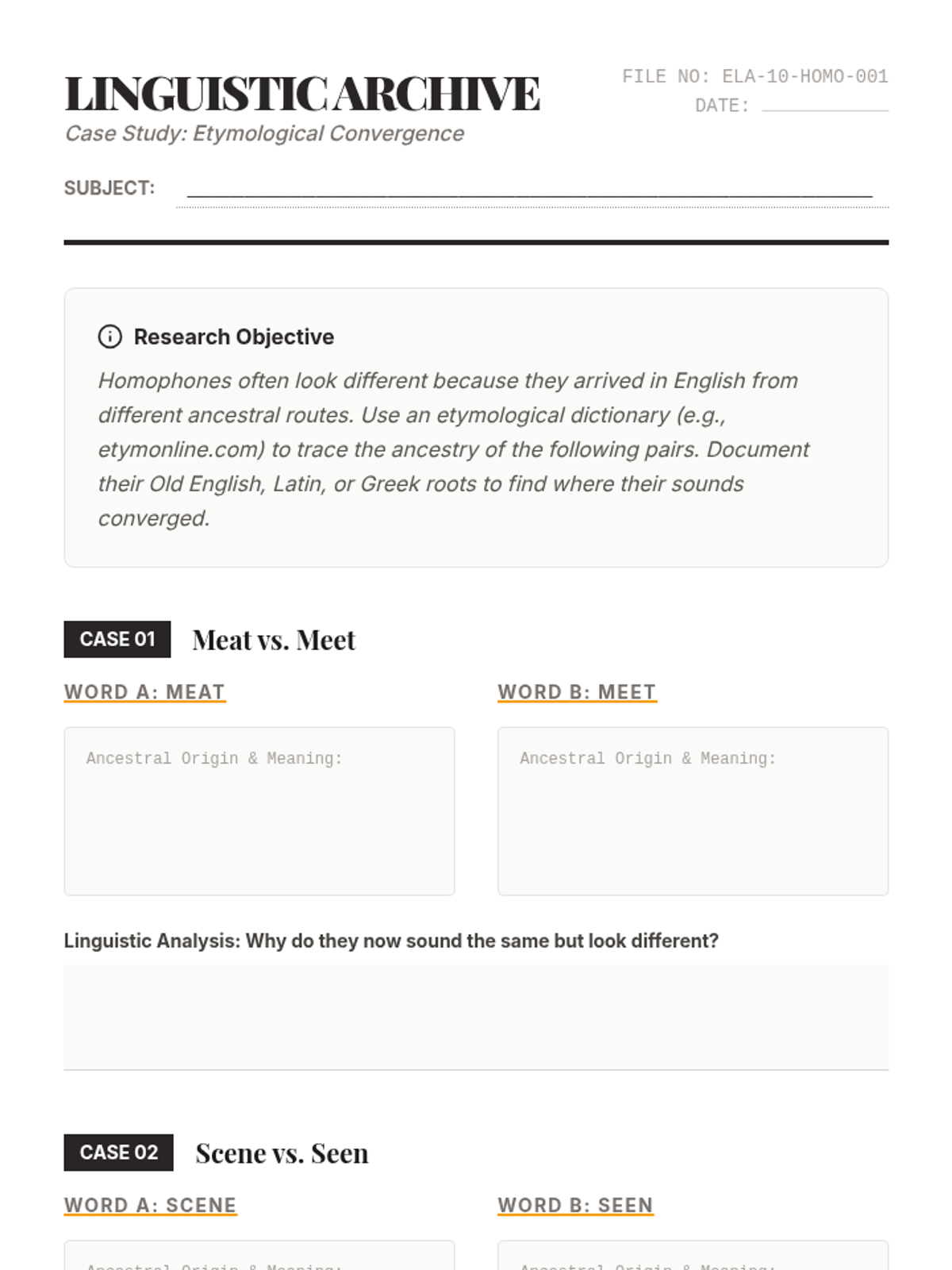 A high-school level exploration of the historical and linguistic roots of English homophones. Students investigate the Great Vowel Shift, etymological origins, and phonetic evolution to understand why modern English spelling diverges from its pronunciation.