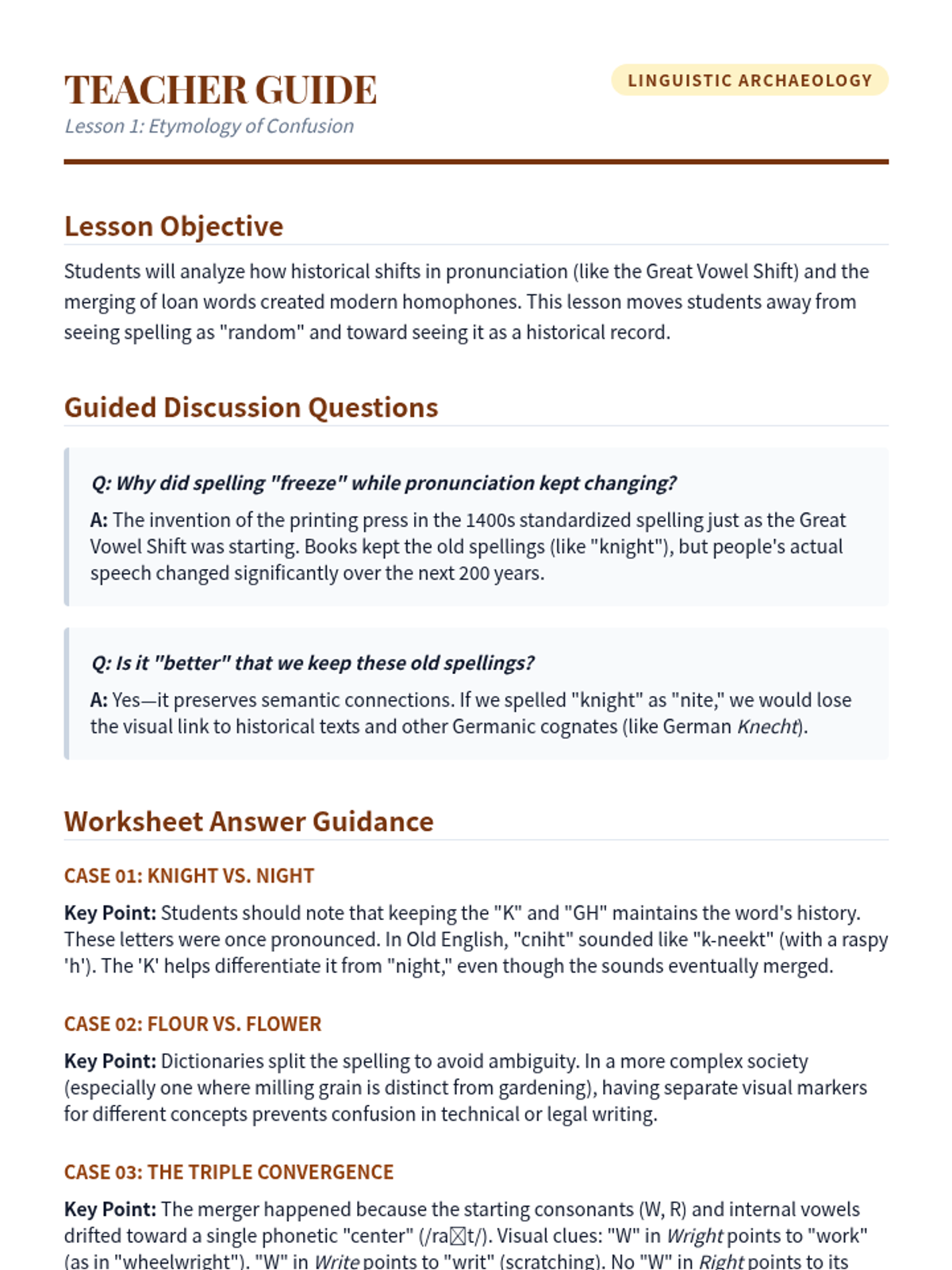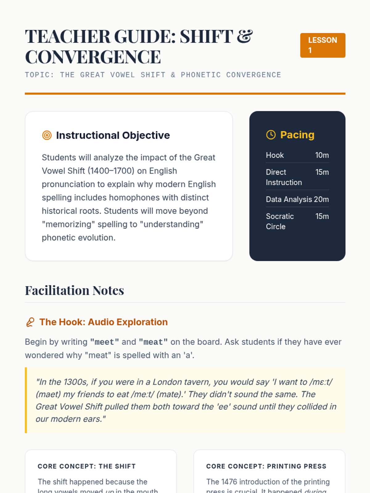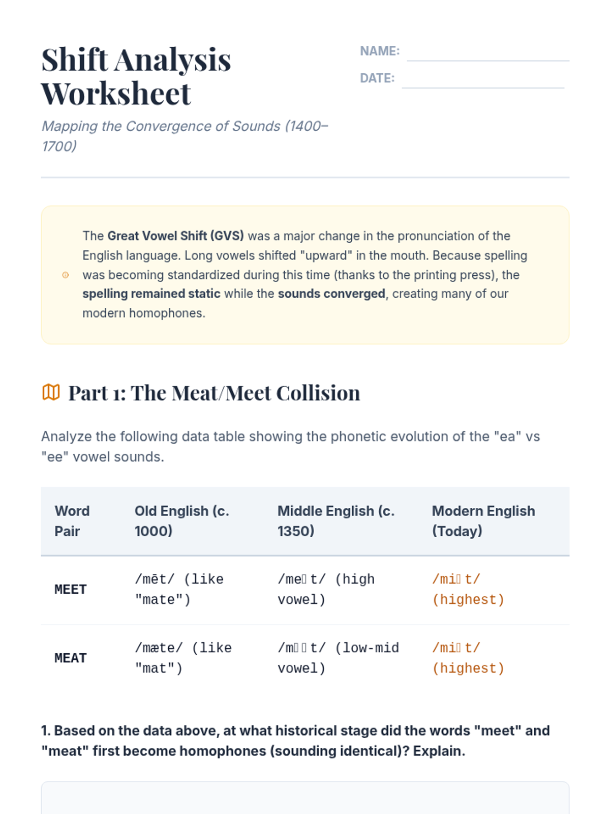 A high-school level exploration of the historical and linguistic roots of English homophones. Students investigate the Great Vowel Shift, etymological origins, and phonetic evolution to understand why modern English spelling diverges from its pronunciation.