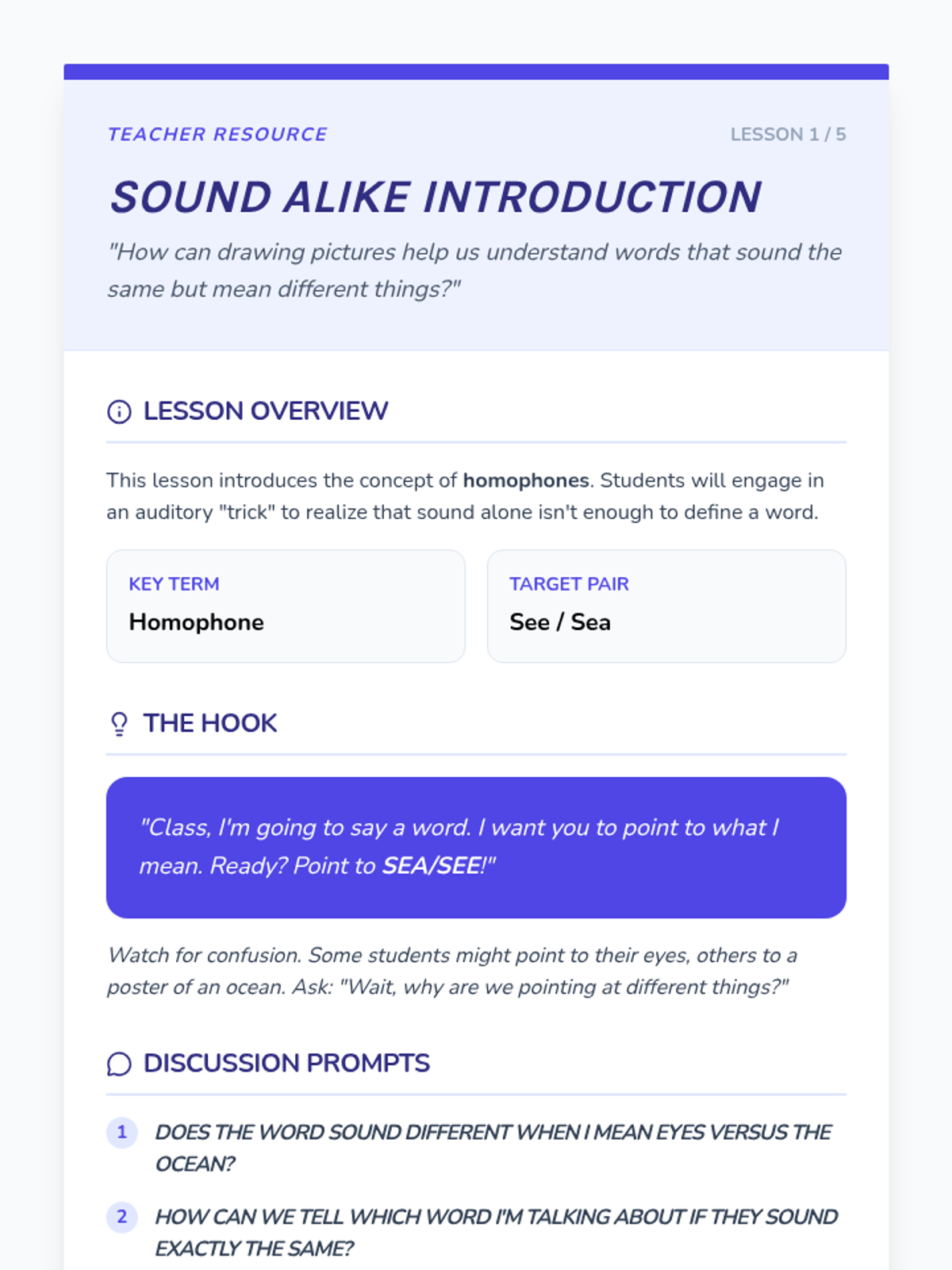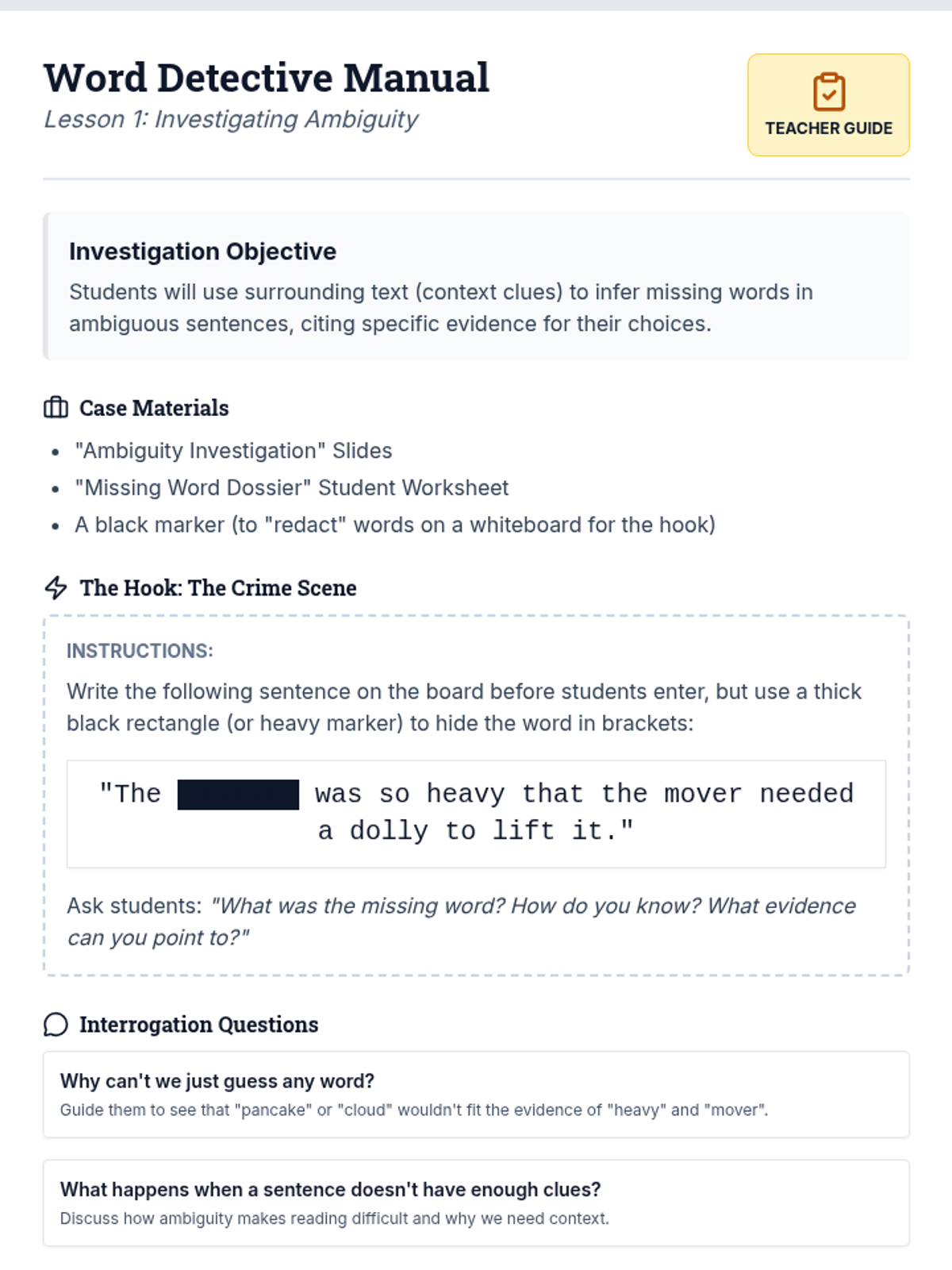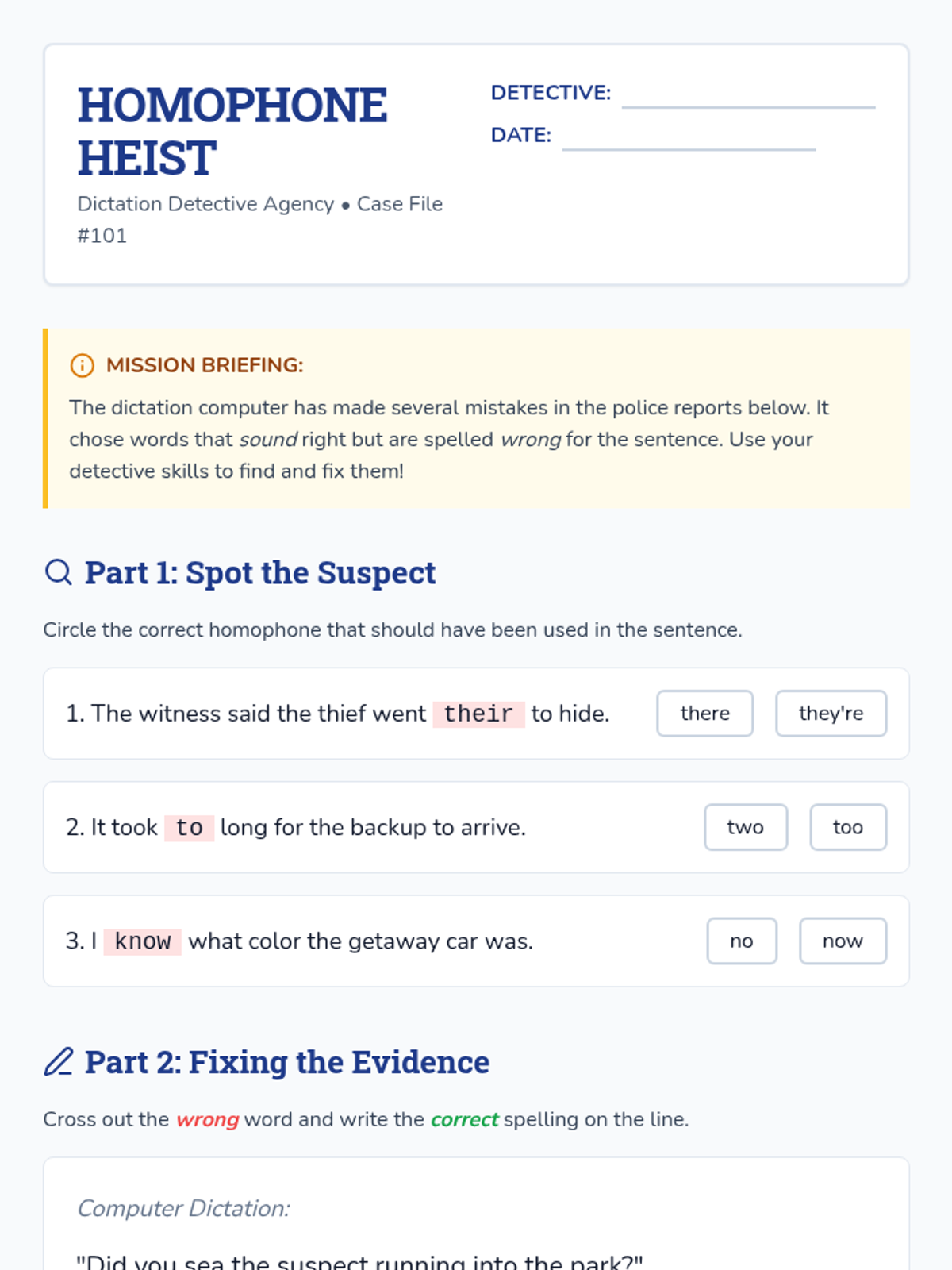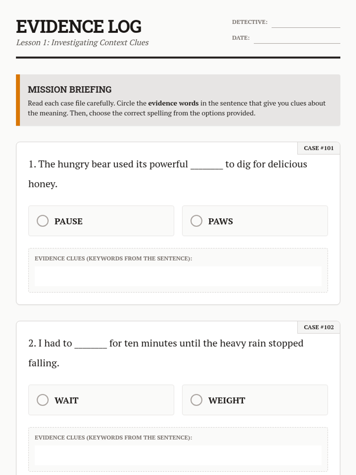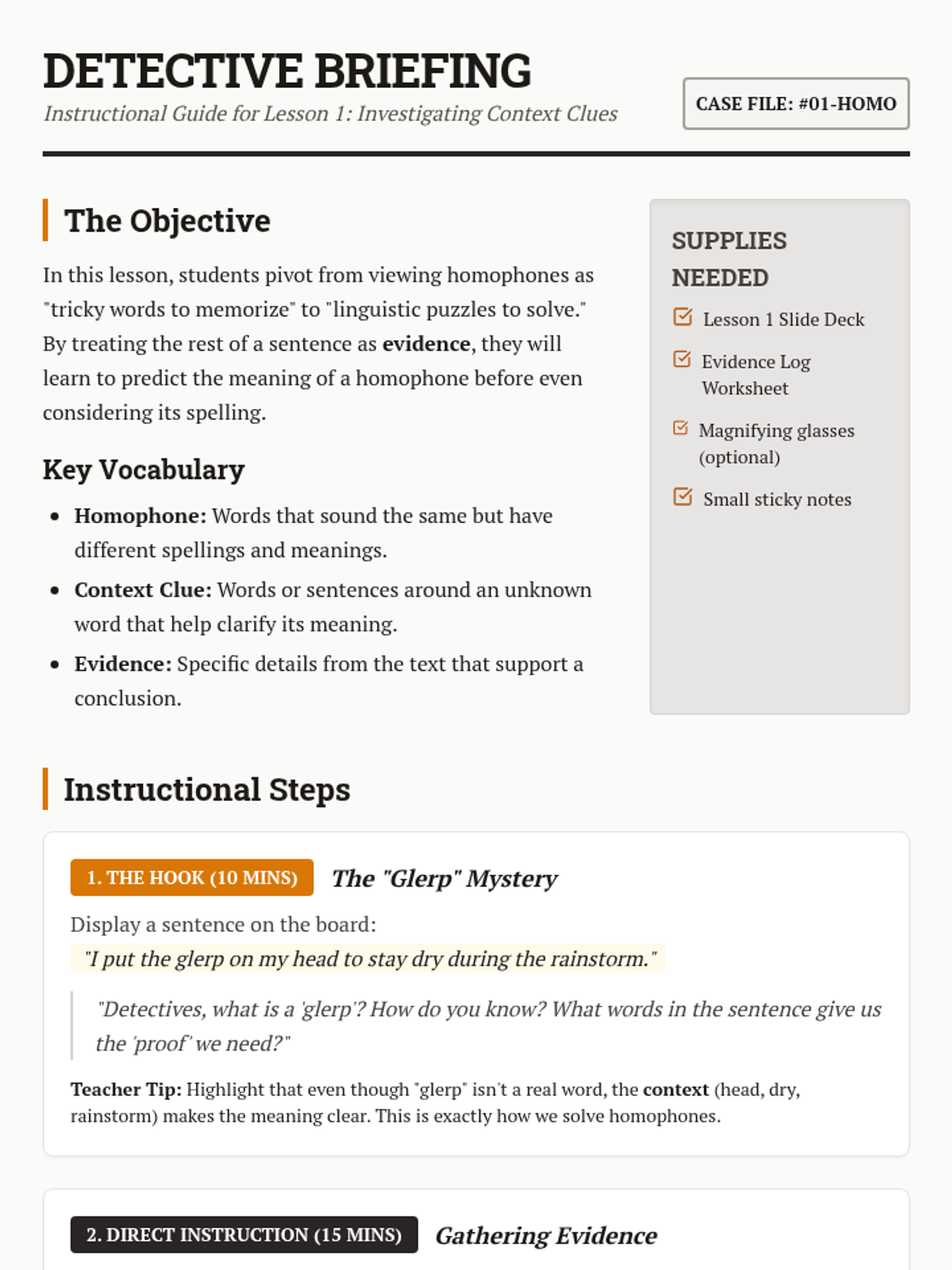 A 4th Grade ELA sequence where students become 'Context Detectives' to master homophones. Instead of rote memorization, students use contextual evidence and grammatical clues to solve linguistic puzzles and create their own wordplay.
