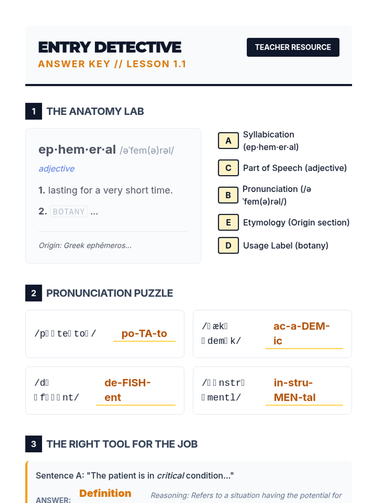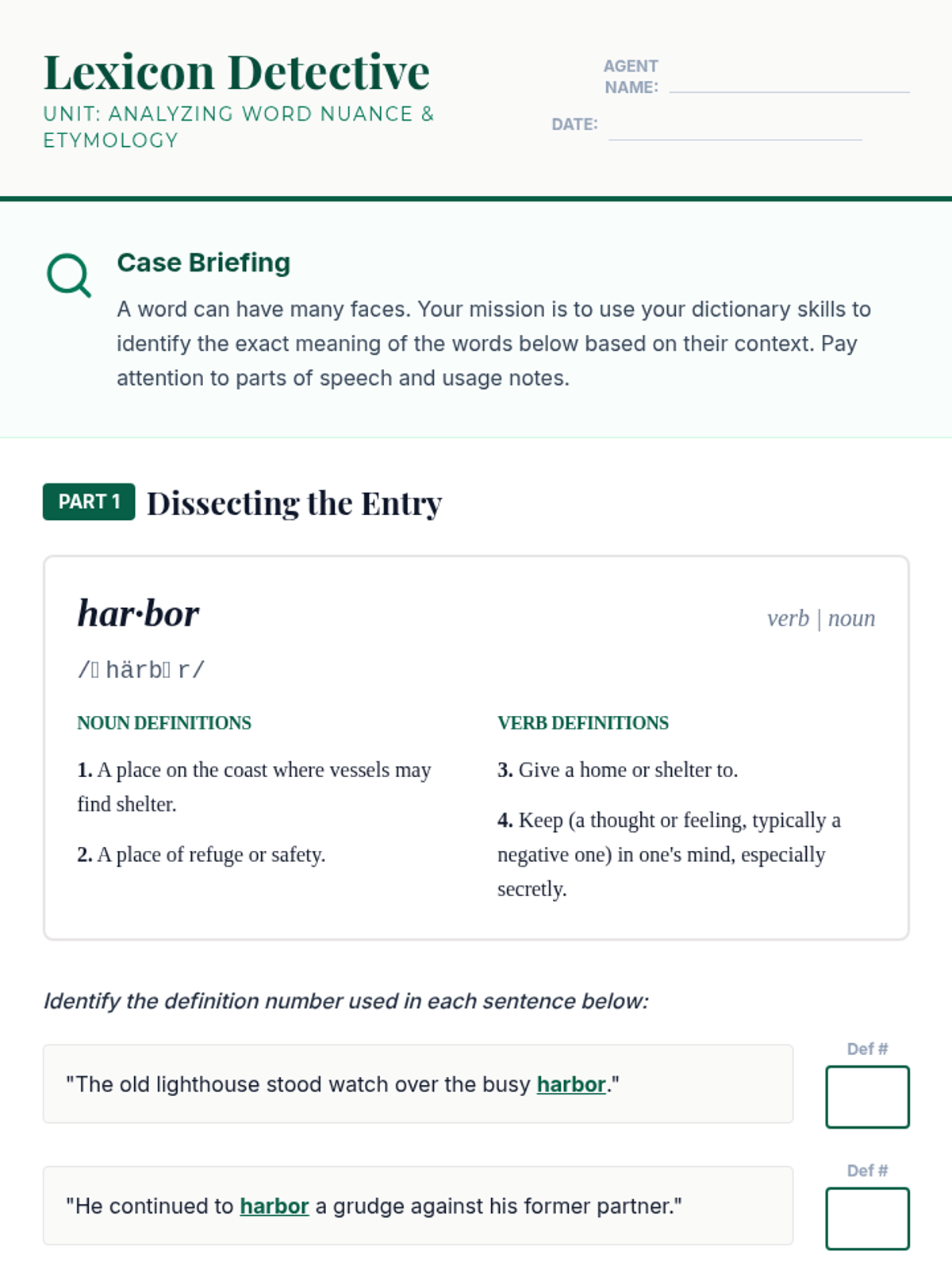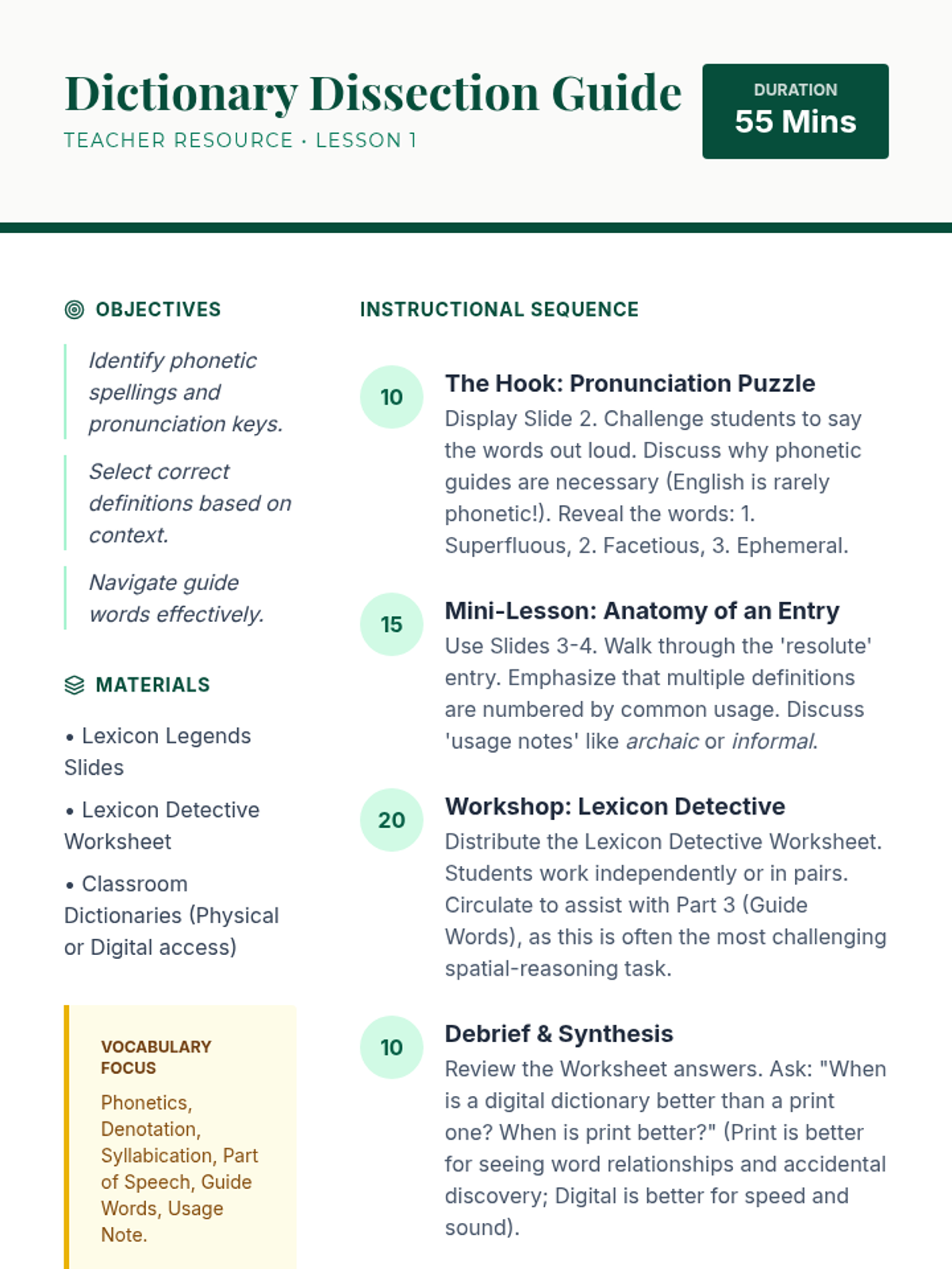 A comprehensive sequence for 9th-grade students to master the use of dictionaries, thesauri, and specialized reference tools. Students will move from understanding the anatomy of a dictionary entry to analyzing the nuances of connotation and etymology, culminating in the creation of their own subject-specific glossaries.