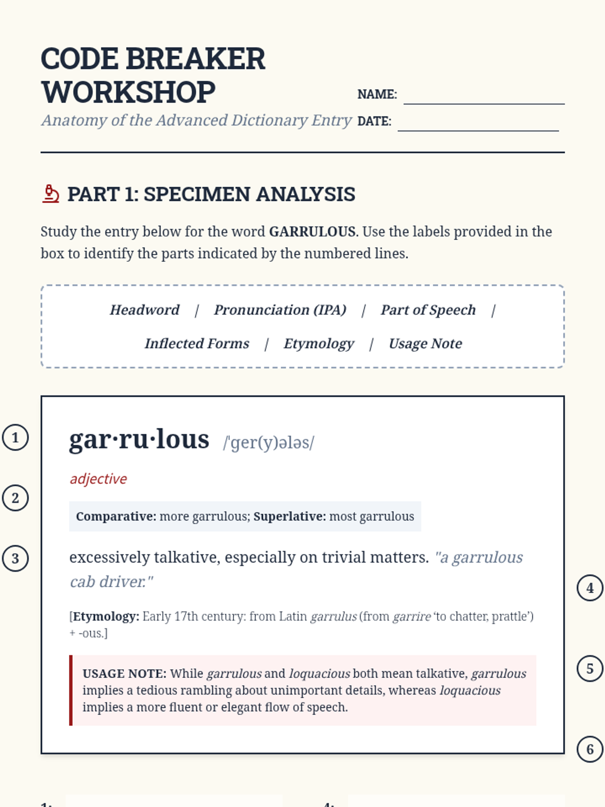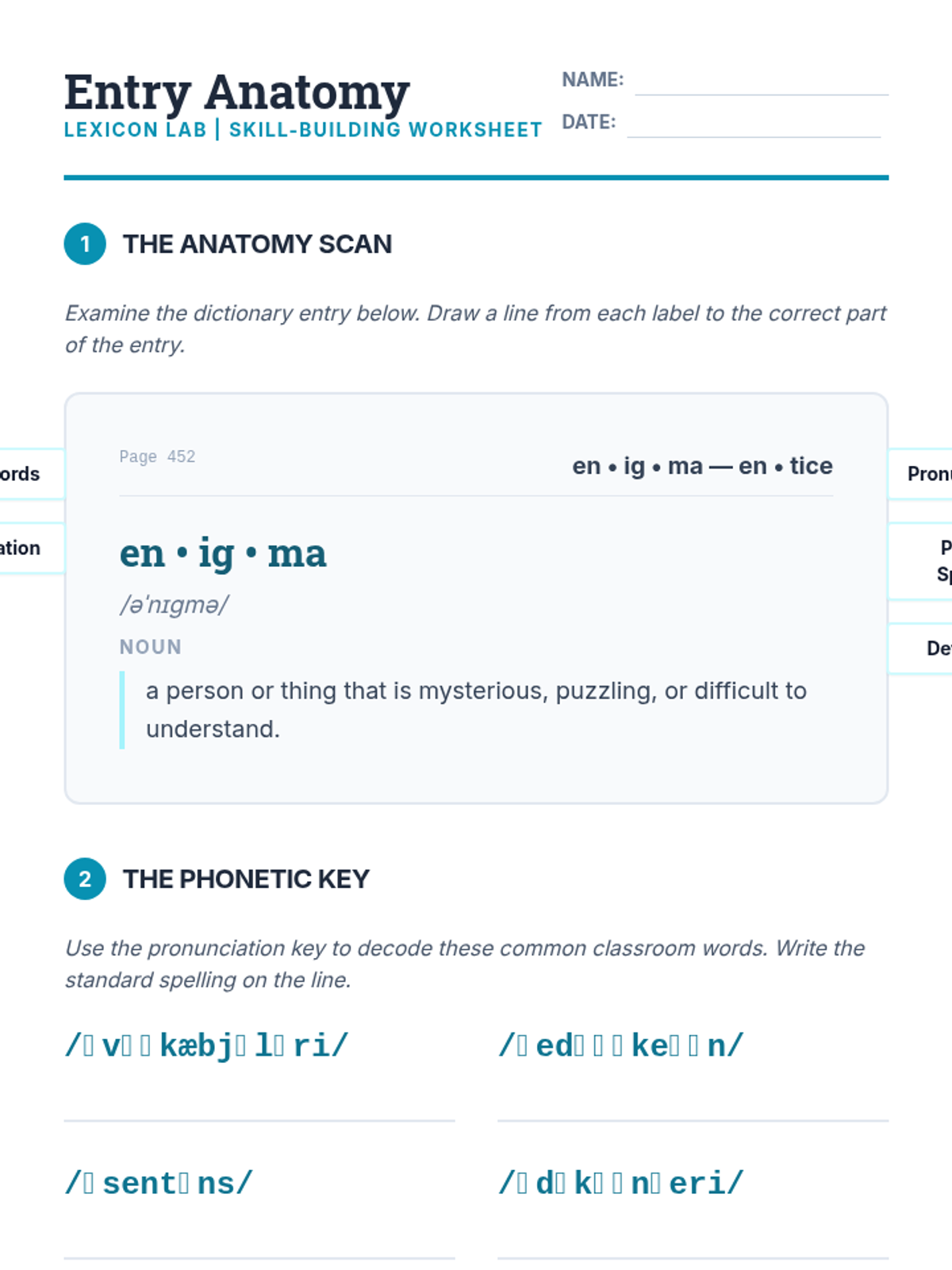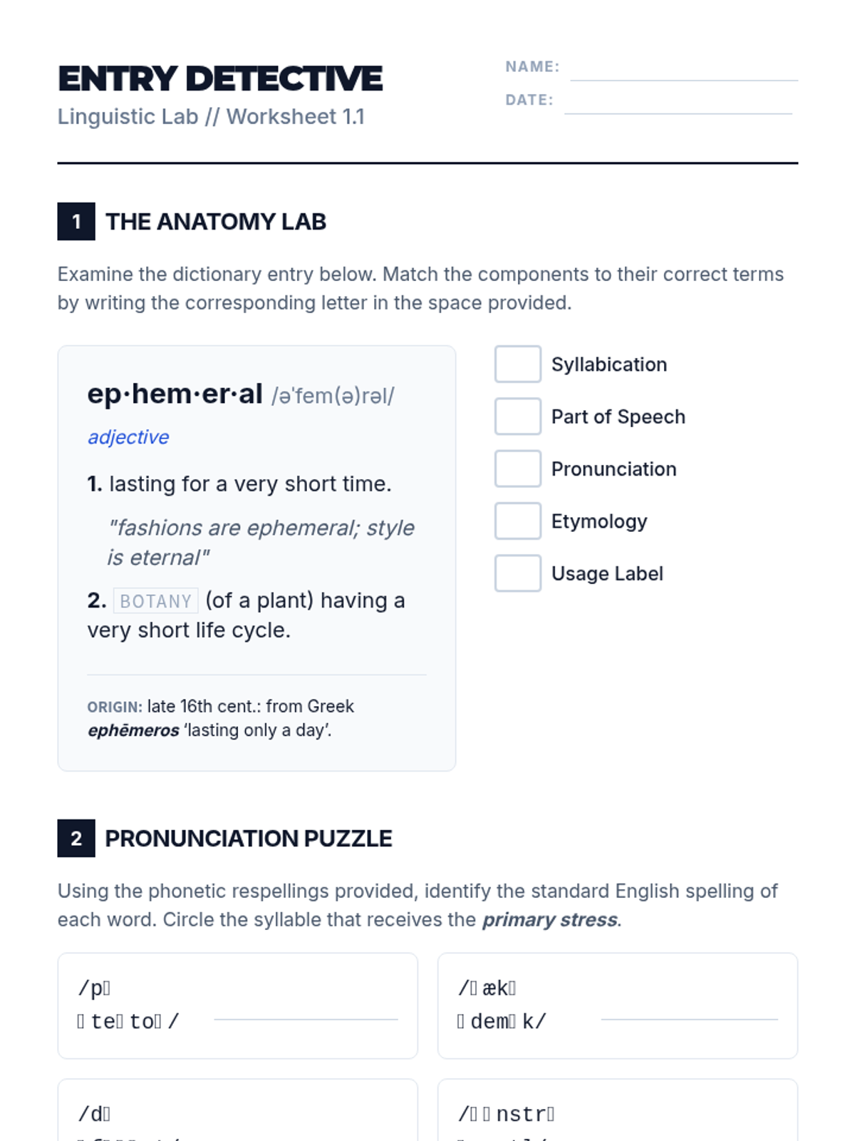 A comprehensive sequence for 9th-grade students to master the use of dictionaries, thesauri, and specialized reference tools. Students will move from understanding the anatomy of a dictionary entry to analyzing the nuances of connotation and etymology, culminating in the creation of their own subject-specific glossaries.