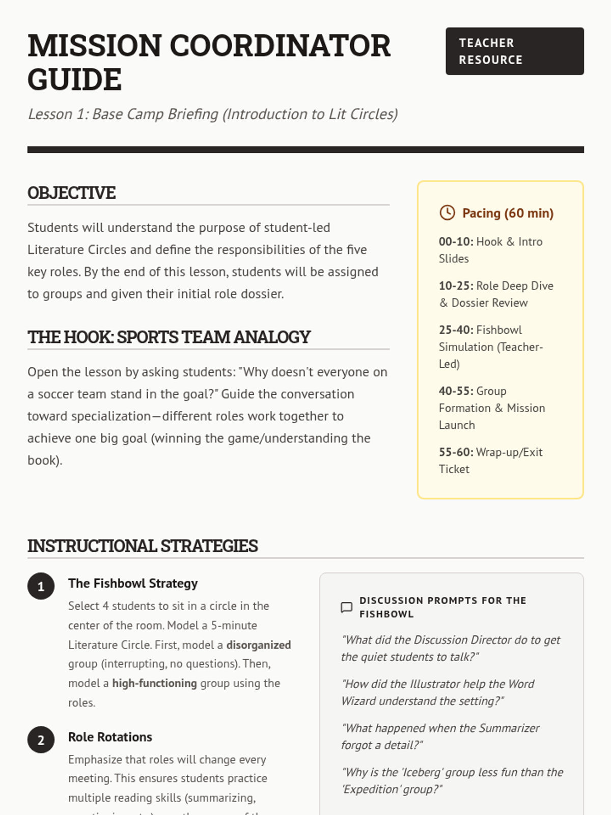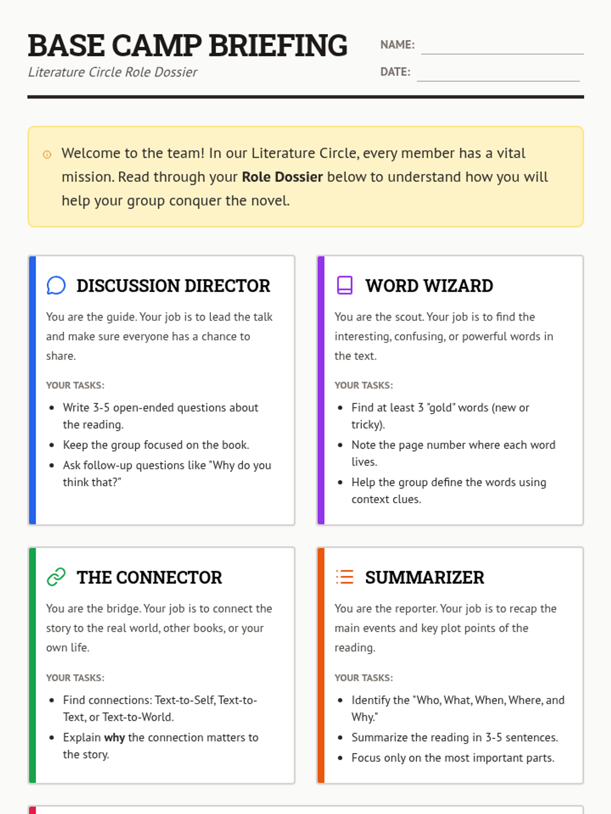A 4th-grade sequence that uses the Literature Circle model to teach collaborative reading comprehension. Students take on specific roles to analyze texts, use evidence to support arguments, and culminate in a group synthesis project.